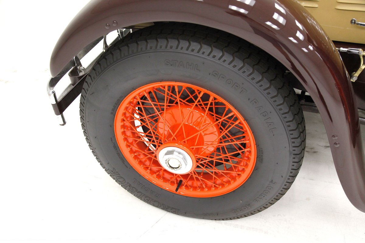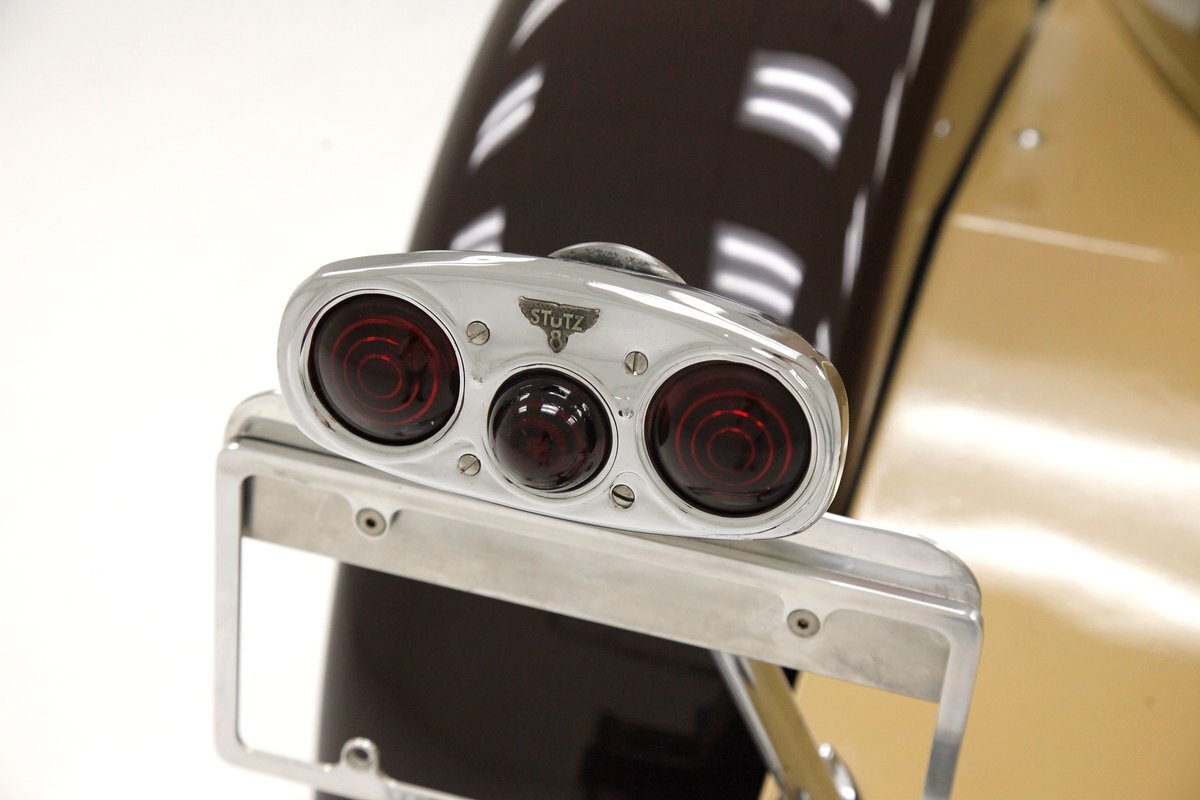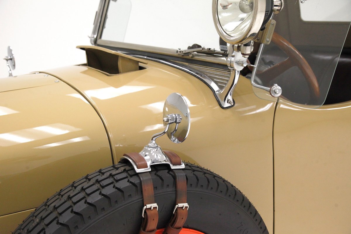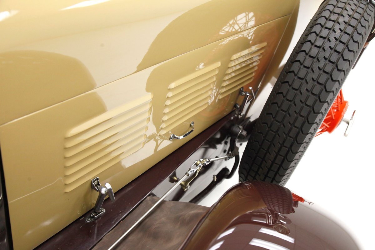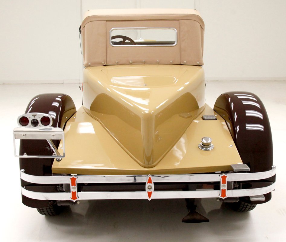 Formally known and referred to as the Blackhawk speedster, this beautiful 2 door coupe convertible is bathed in a light coffee, (tan), steel body and dark coffee, (brown), fenders and the lack of a running board for weight saving. The rockers are wide and also present in dark coffee. Upfront a chromed grille covering wraps the radiator behind and sports the "Ra" Sun god hood ornament/radiator cap. Big round headlights along with smaller high beam running lights just below appear to float in front of the grille and just above the dual flat bar chromed bumper below. A long cowled hood runs to the driver and passenger compartment which has a tan canvas convertible top protecting the seats from the elements. On the rectangular angled rearward front windshield surround is a searchlight, and on either side of the firewall cowl are chromed rear view mirrors. Also attached to the hood cowling is a red painted steel wire spare tire and wheel which is on both sides, and these are belted on to this car. Under the doors is a step to aid in getting what was considered at the time a low slung car! On back is the iconic boattail trunk which has panels on either side that curve downward and help support the boat tail as well as the dark coffee rear rounded fenders. This boattail contains a single seat, but the view is obscured by the trunk lid which opens up from rear to front, so this passenger is not provided with a room with a view. Another dual flat chromed bar bumper is on back and a single flared tip exhaust pipe is peeking out from underneath this bumper. For the wire wheels which are on all 4 corners and painted in a beautiful blazing red are 19-inch steel wires and rims are wrapped on thin treaded tires. Overall paint is still shiny and does show some chips mostly at the seams. This car was completed on its restoration journey in 2011 which is when the painting happened.
