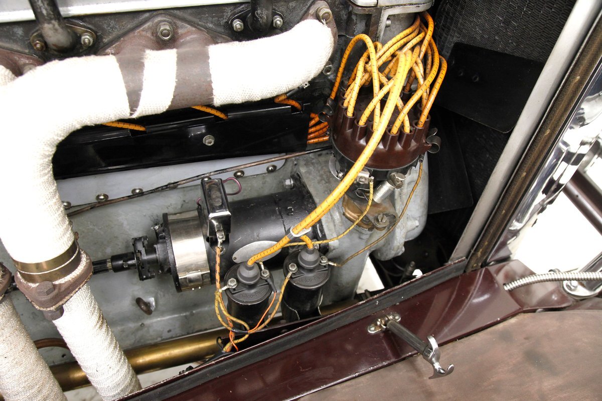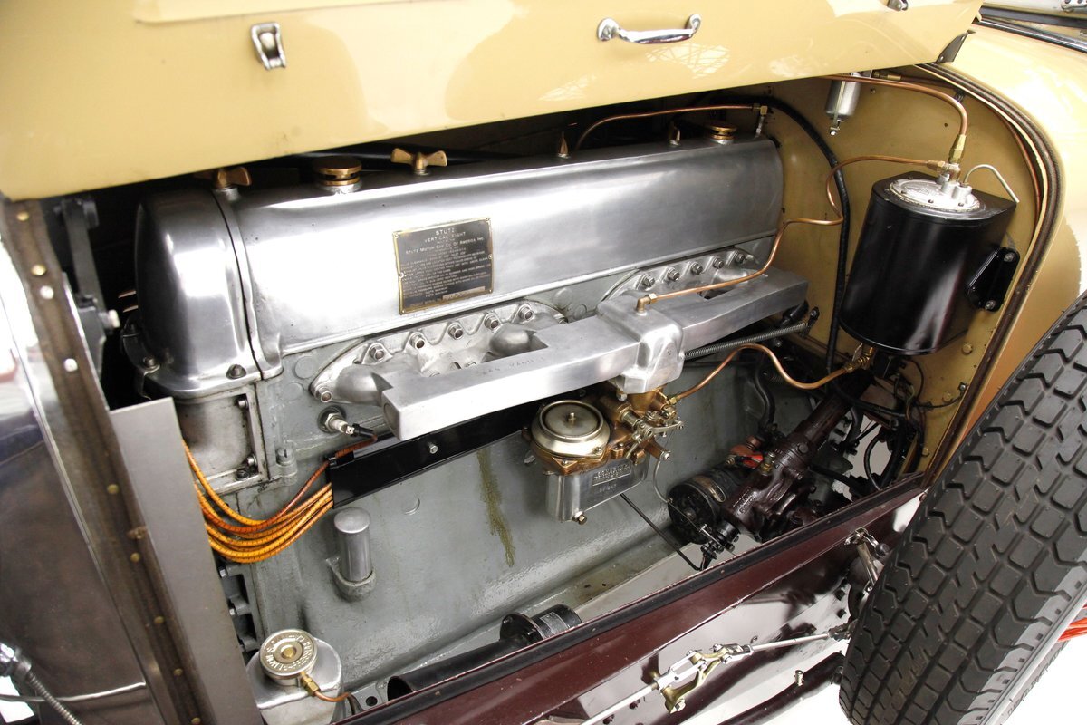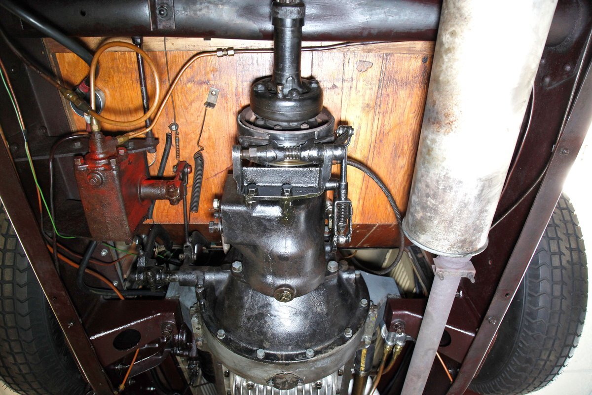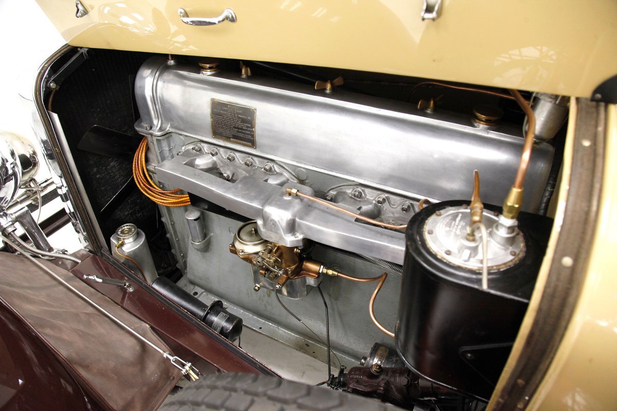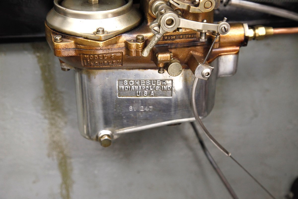 A lift of either side of the long front cowl, reveals a machinists dream with an all polished metal valve cover, stainless steel exhaust manifold and some brass piping running about for the brake fluid. This is a 298.64 ci Inline 8-cylinder with a single overhead cam. This old mill produces 115hp @ 3,600rpm. On back is a 3-speed non synchro gearbox, and there is a 1.5 inch dual choked 1-barrel bronze Shebler carburetor. Also on is twin coil dual plug ignition which can be used as a backup if the first system should fail in any way.