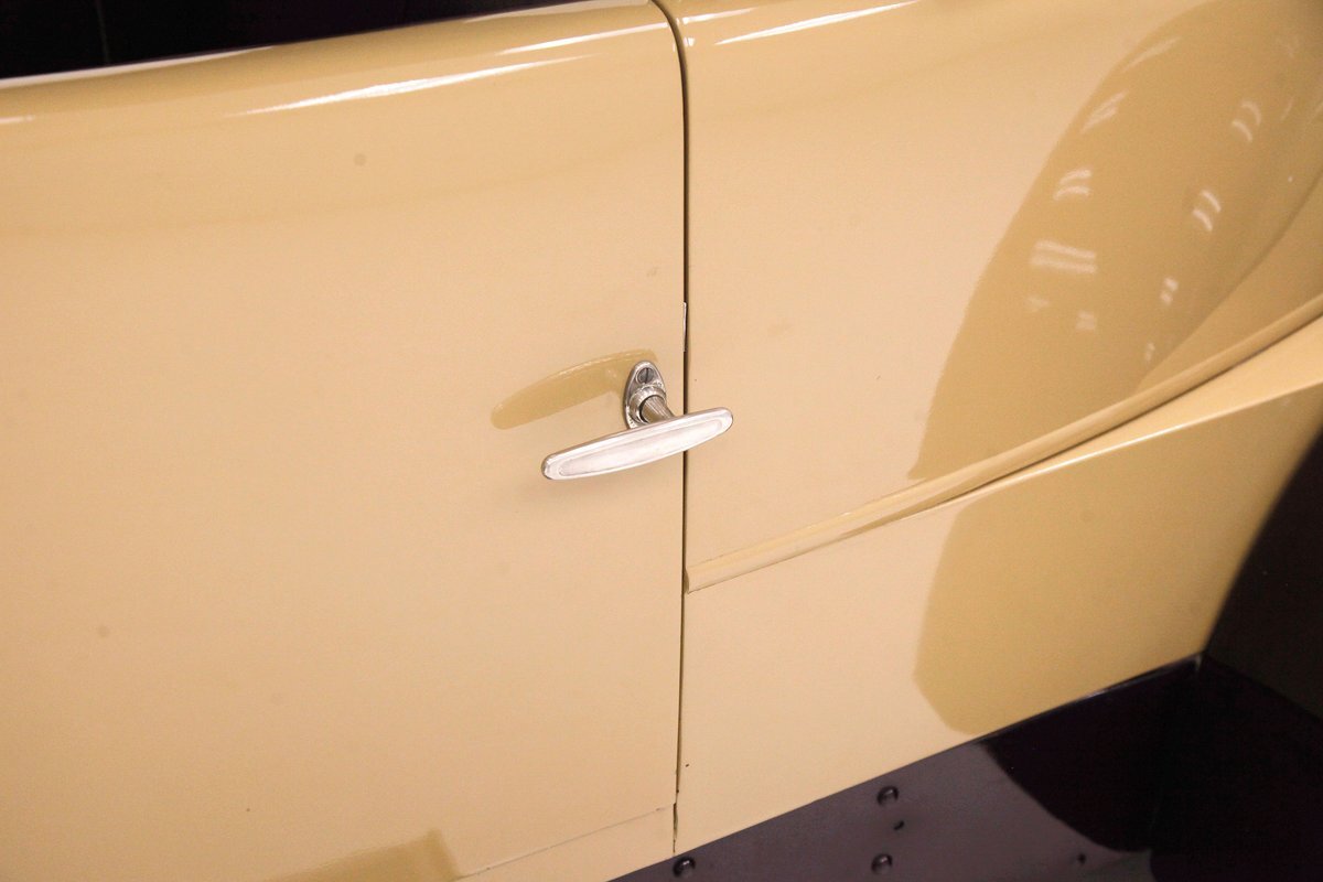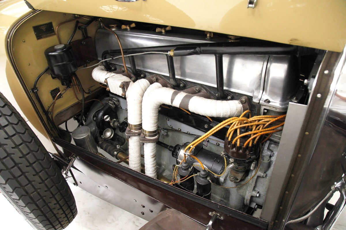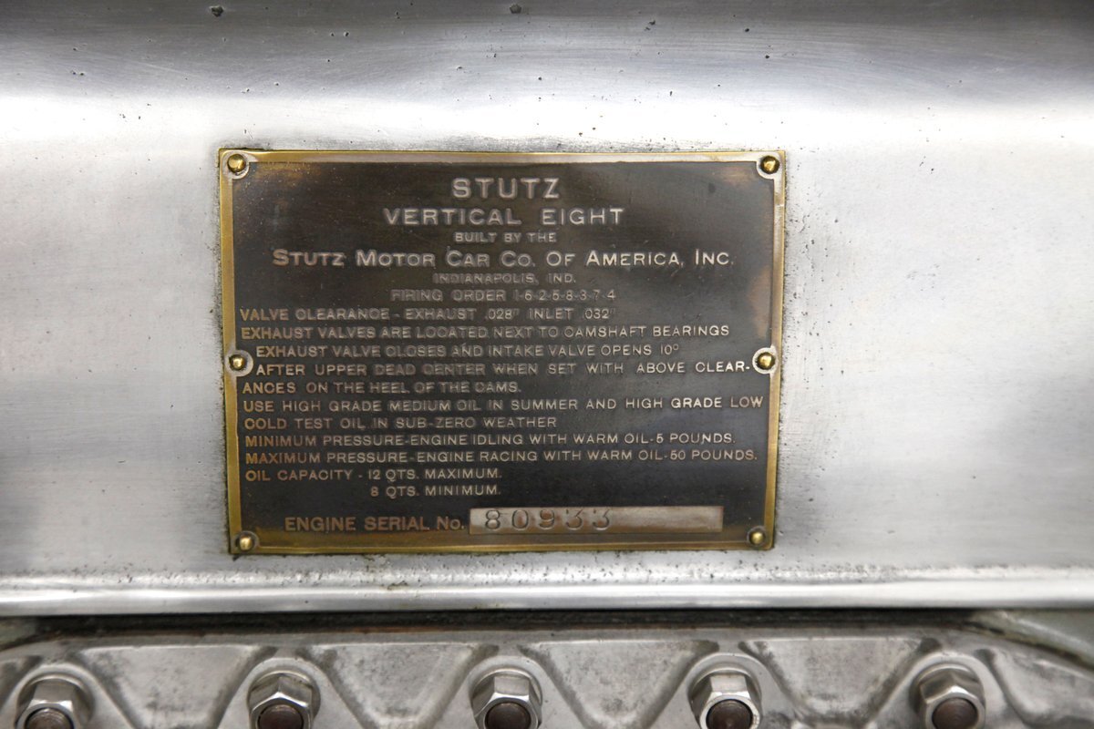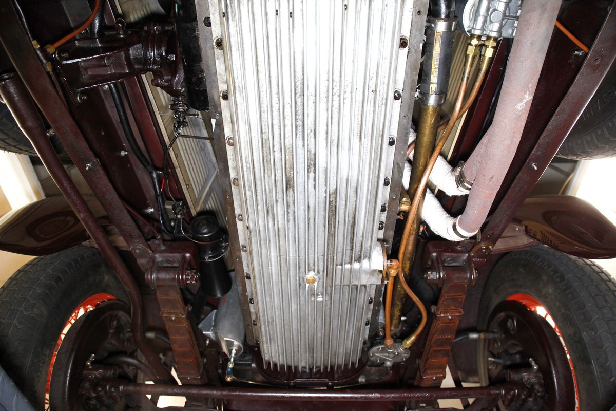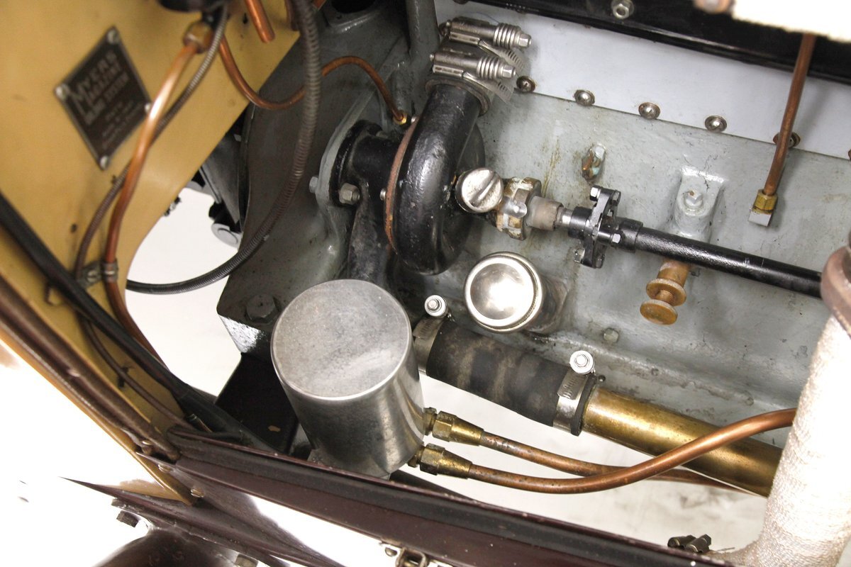 A lift of either side of the long front cowl, reveals a machinists dream with an all polished metal valve cover, stainless steel exhaust manifold and some brass piping running about for the brake fluid. This is a 298.64 ci Inline 8-cylinder with a single overhead cam. This old mill produces 115hp @ 3,600rpm. On back is a 3-speed non synchro gearbox, and there is a 1.5 inch dual choked 1-barrel bronze Shebler carburetor. Also on is twin coil dual plug ignition which can be used as a backup if the first system should fail in any way.