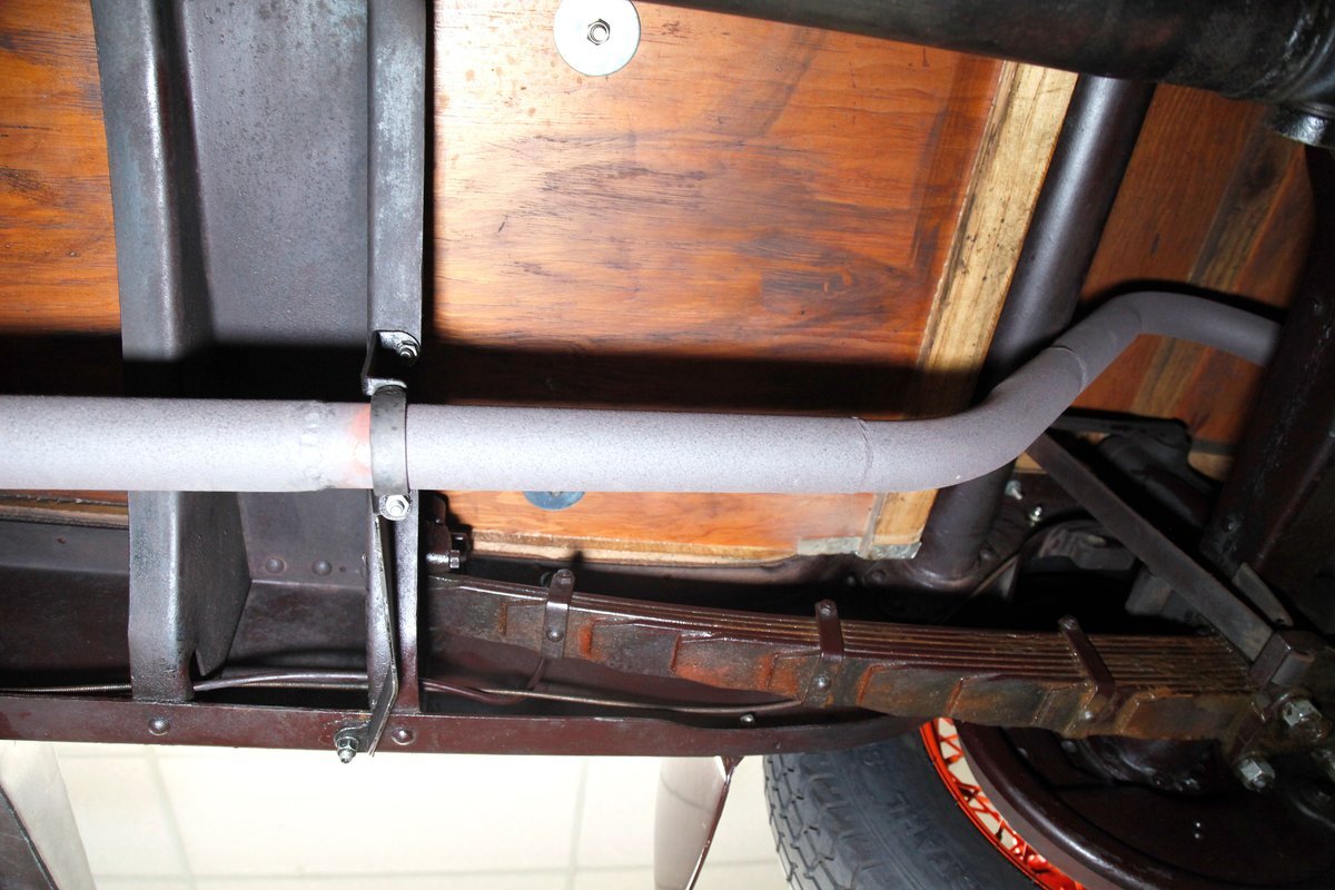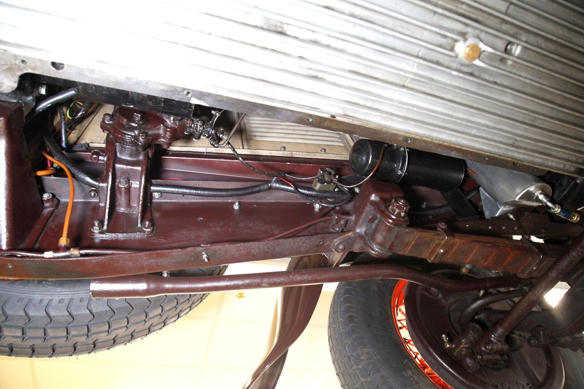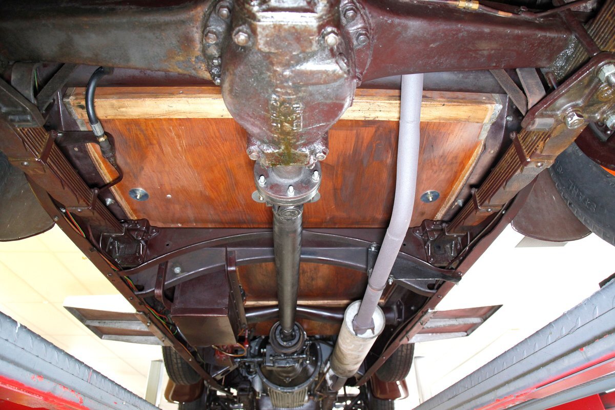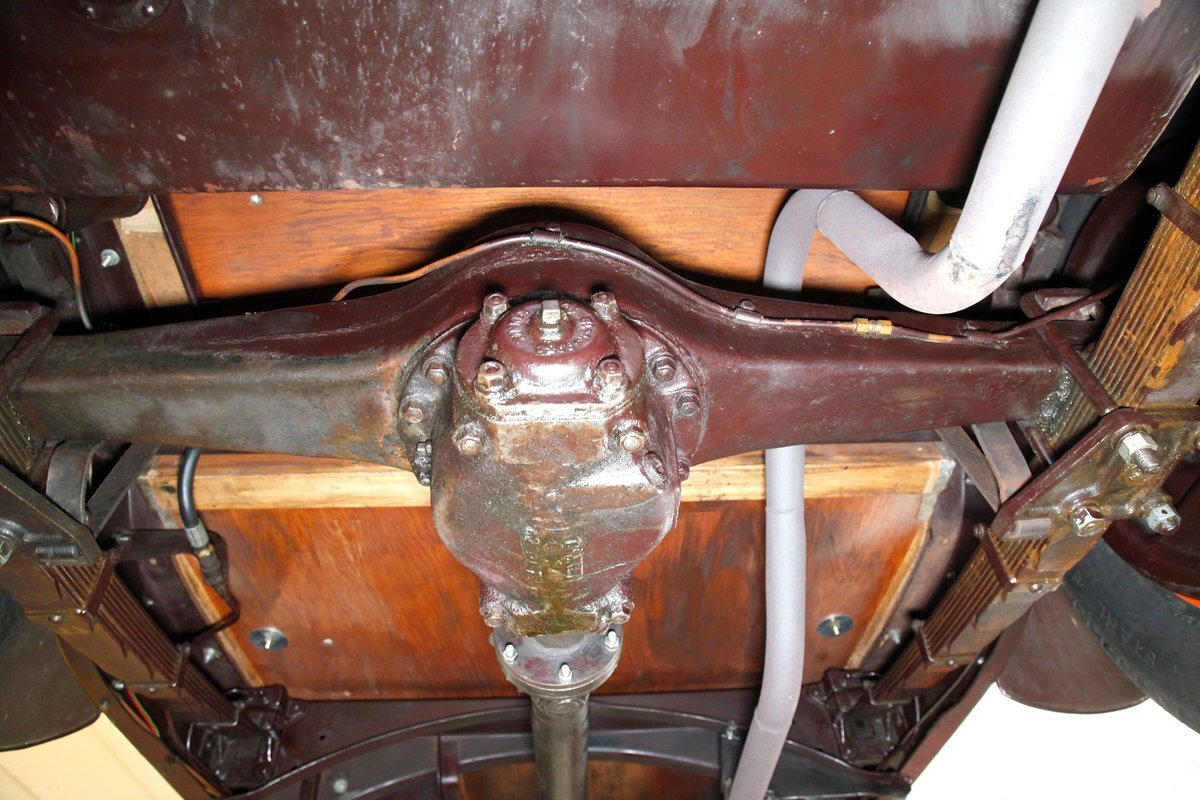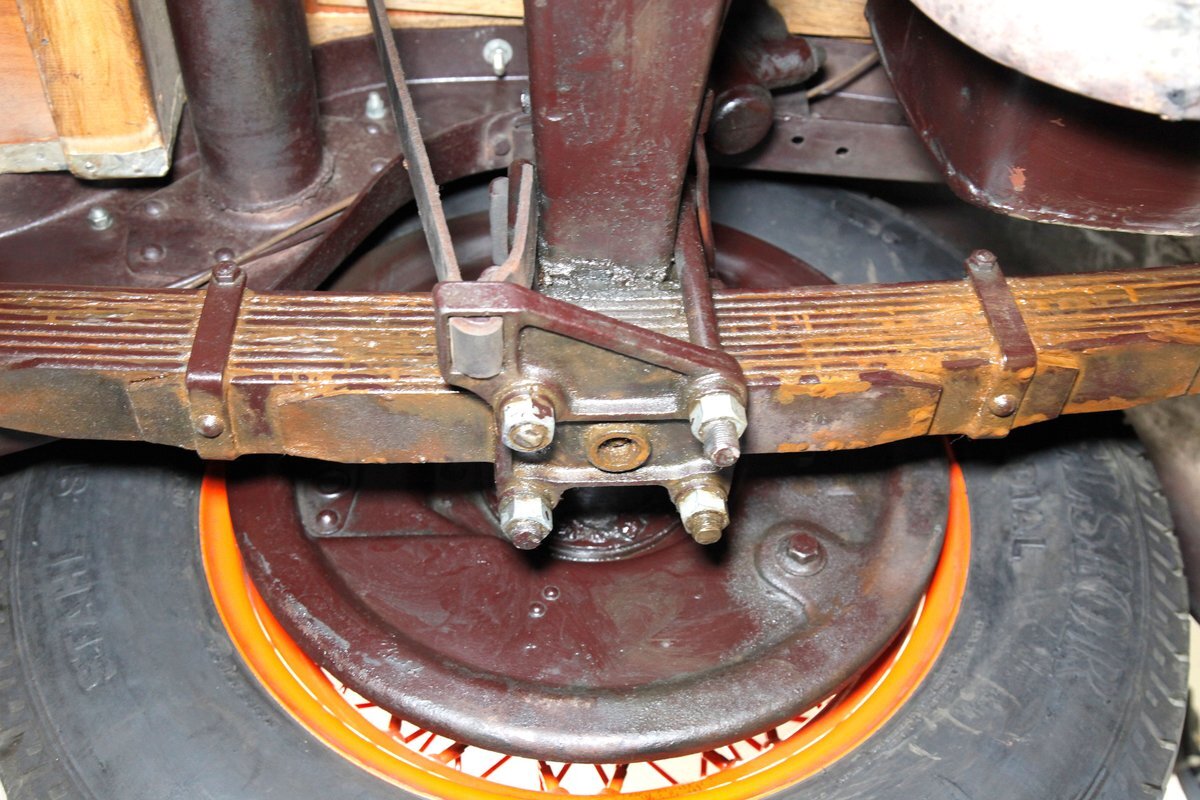 The completed restoration took place in 2011 and was performed by Lee Duran. Within this 131 inch wheelbase are nicely painted brown components: tank, suspension, rear axle, and framing arches. Wood floor pans are in beautiful condition not even showing any contact with water. Leaf spring suspension is all around as well as drum brakes which are Lockheed hydraulic. A worm gear rear drive is on to spin the back tires.