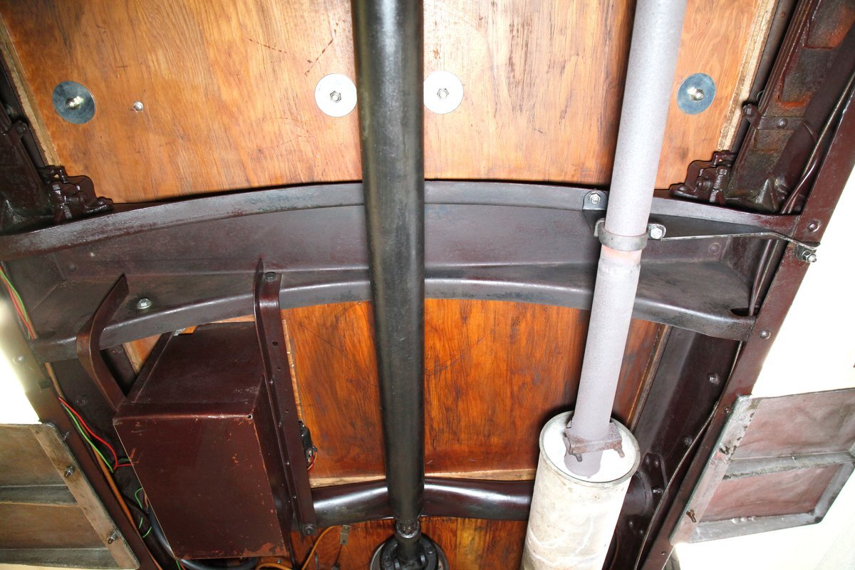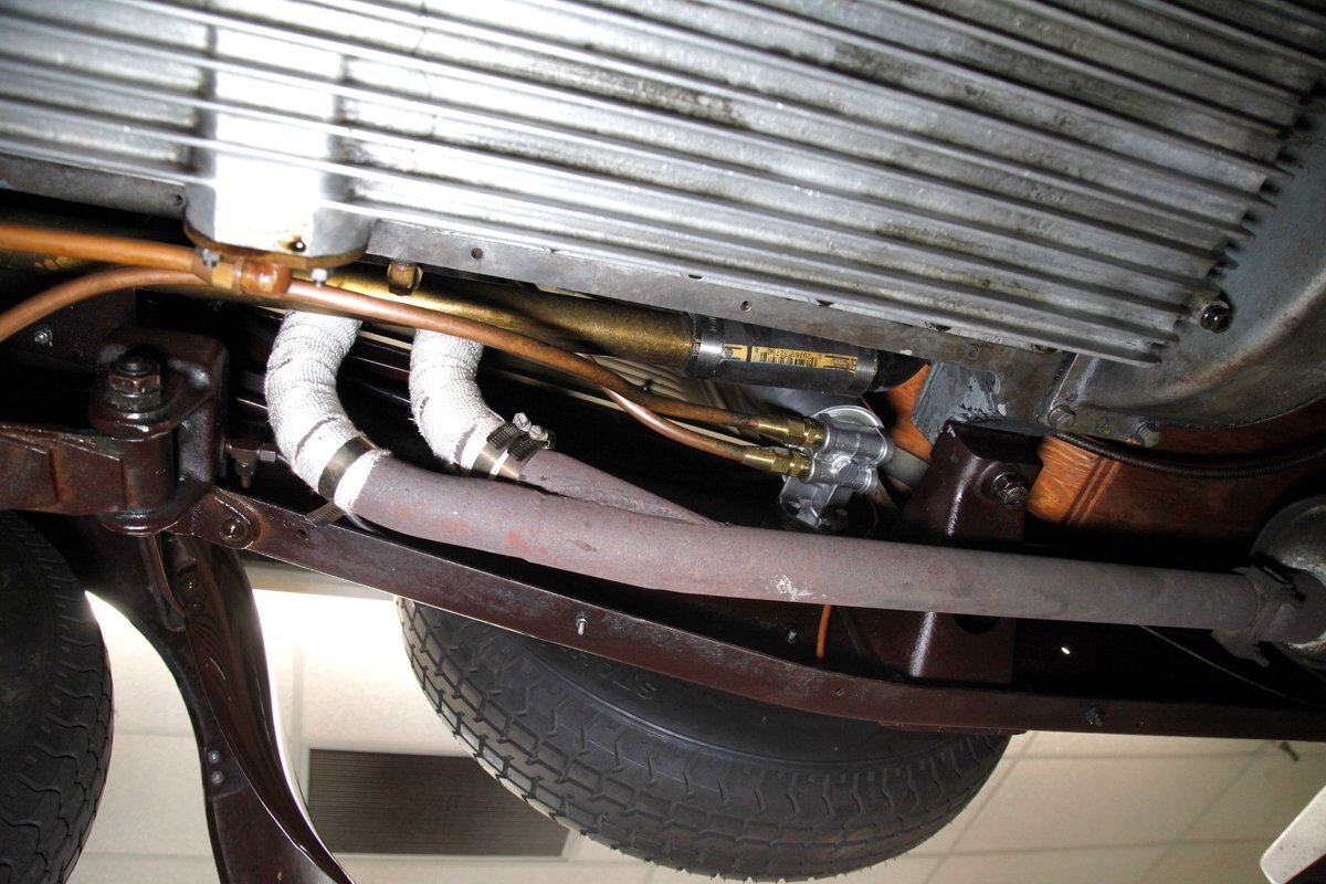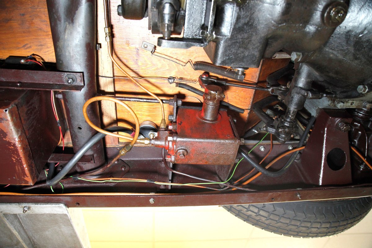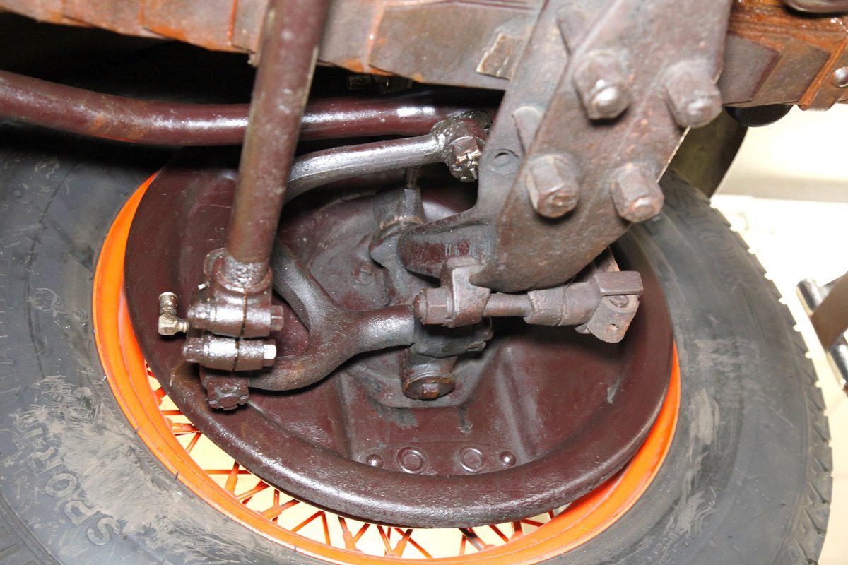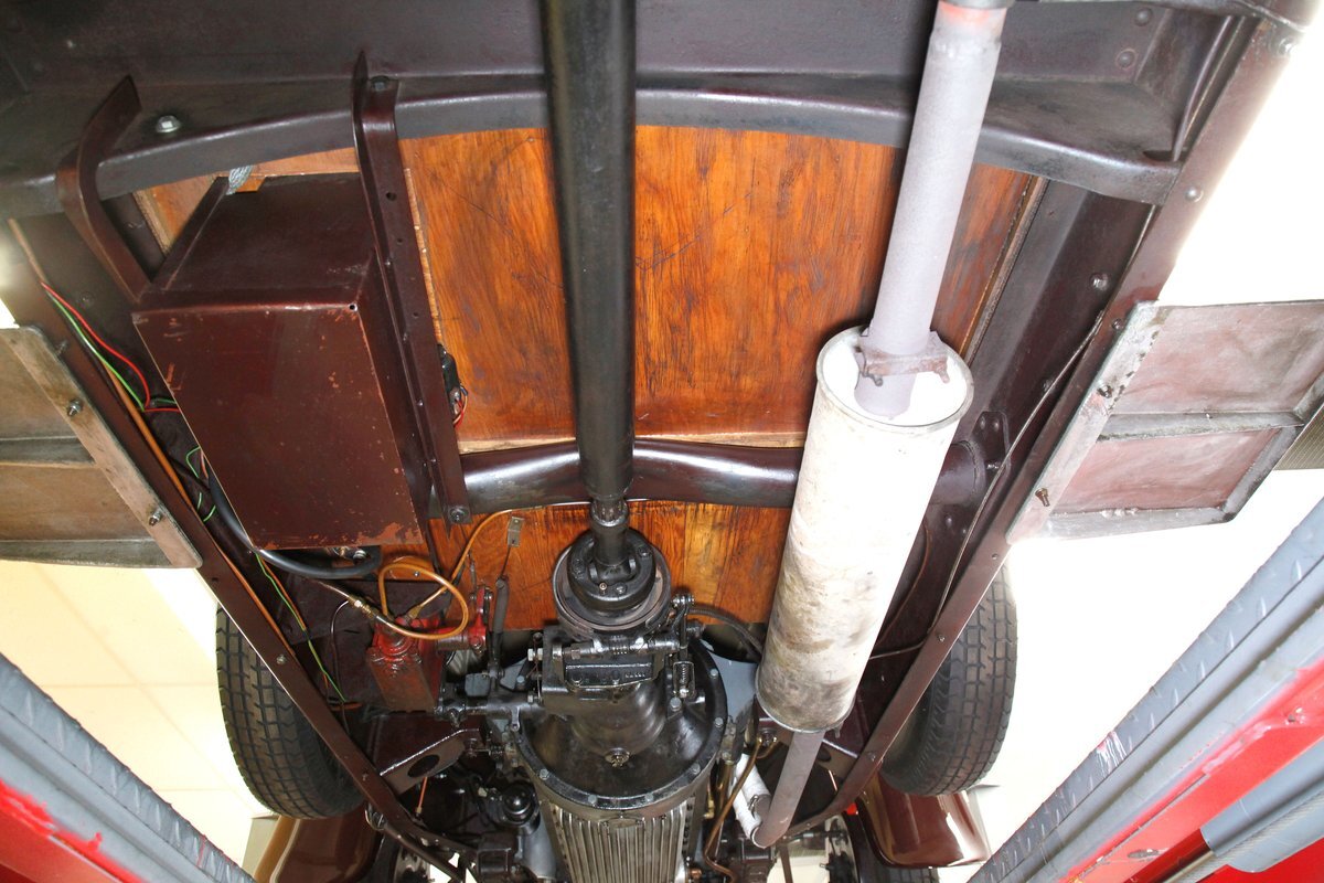 The completed restoration took place in 2011 and was performed by Lee Duran. Within this 131 inch wheelbase are nicely painted brown components: tank, suspension, rear axle, and framing arches. Wood floor pans are in beautiful condition not even showing any contact with water. Leaf spring suspension is all around as well as drum brakes which are Lockheed hydraulic. A worm gear rear drive is on to spin the back tires.