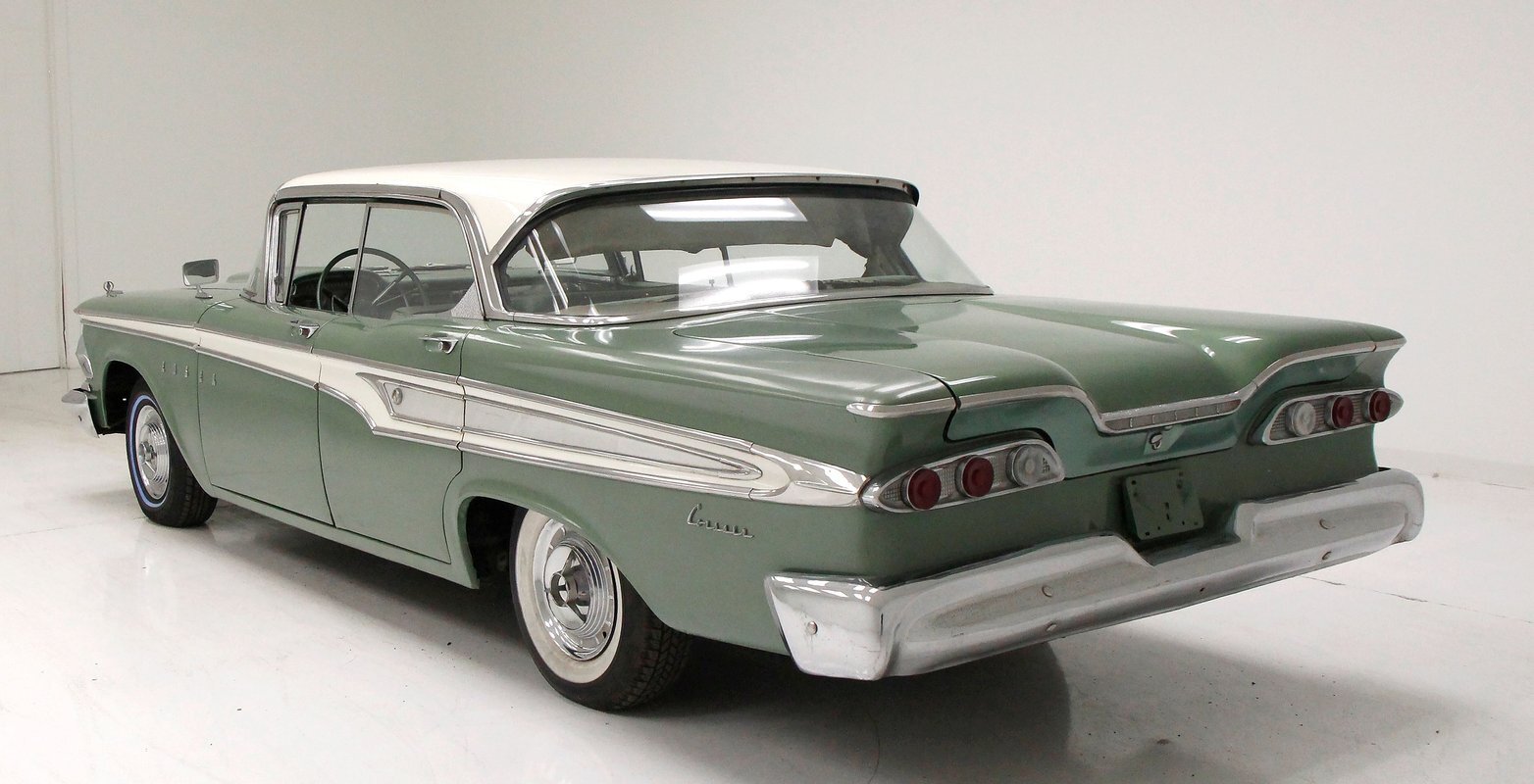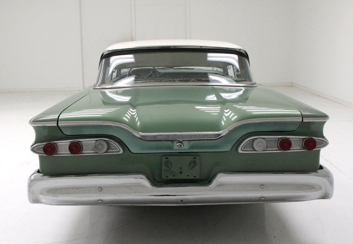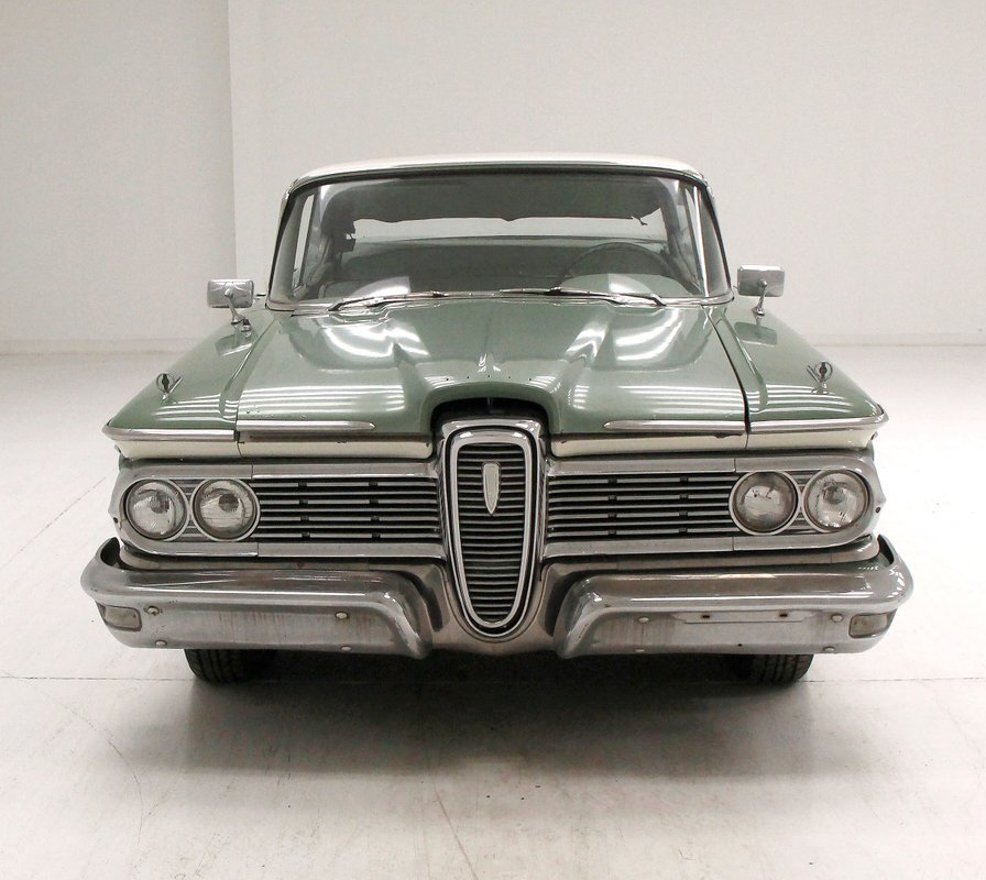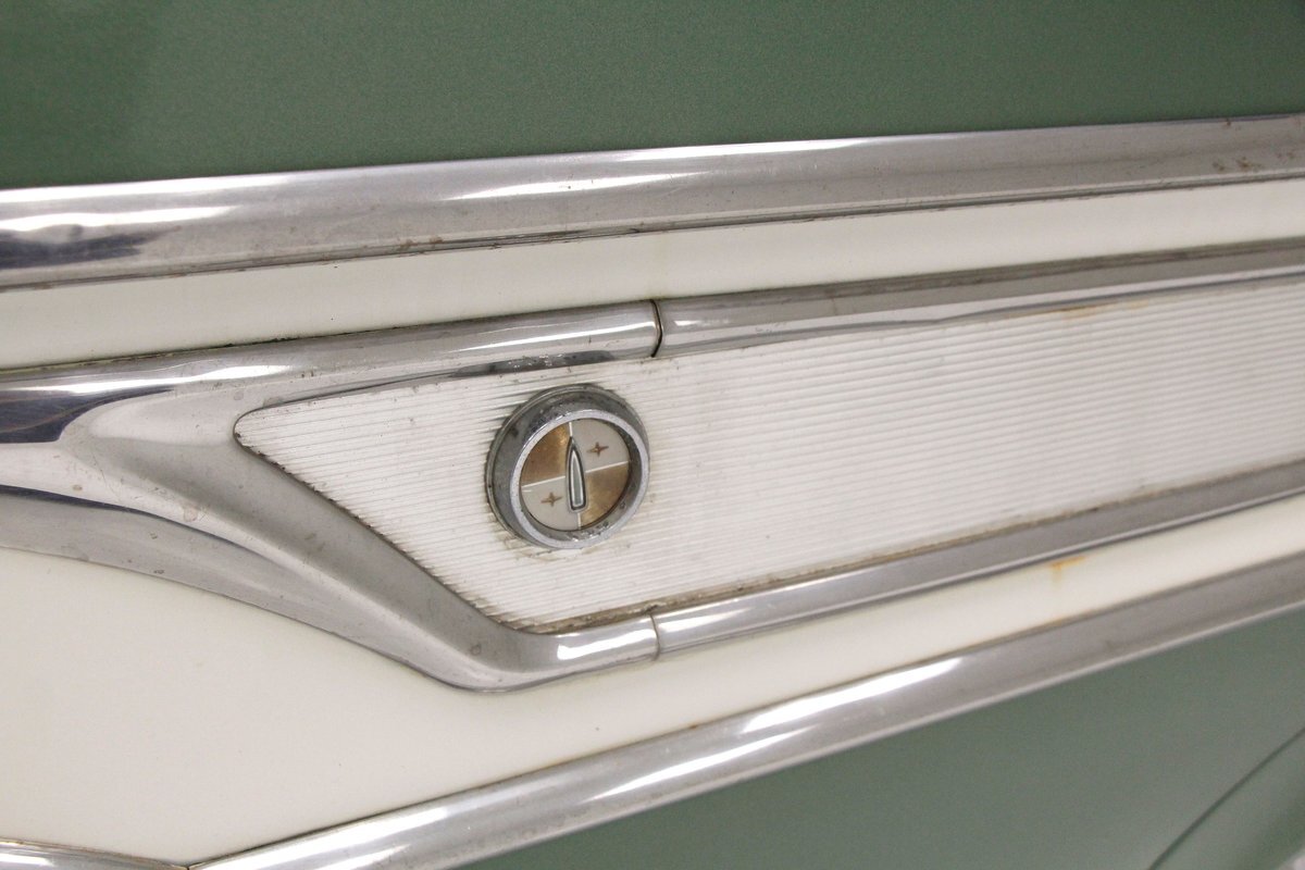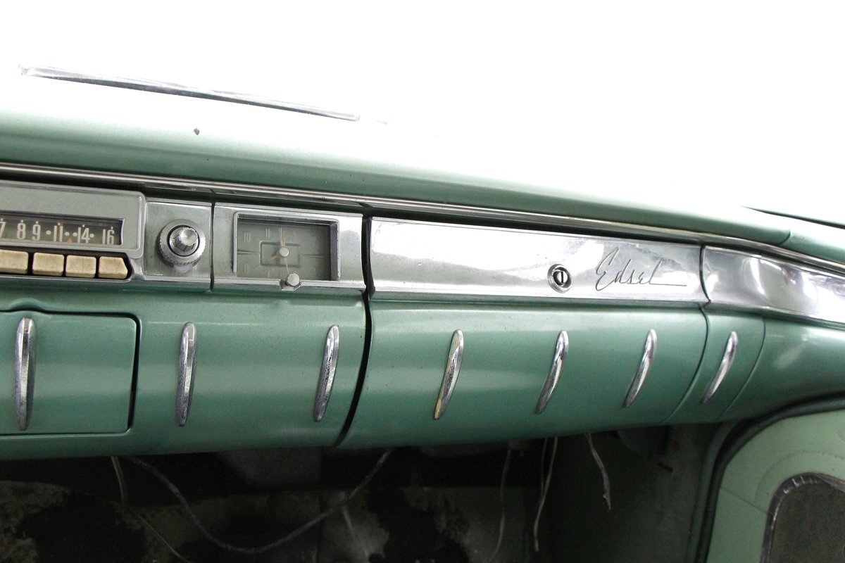 Not perfect but certainly solid as Mist Green and White bathes this long and mighty car, with fairly straight steel panels, and decently minded gaps. A white spear trimline runs the length of the car at the beltline and makes an artistic dip at mid rear door before melting back to a thin spear at the tail of the car. With the dual headlights flanking the horizontal grille ends, and the iconic vertical center known as the "toilet seat" or "vulva" grille, it was either loved or hated. This one presents in good condition with minor pitting and cloudiness of the chrome, as does the grille, and bumpers. A wrap-around windscreen fronts a massive chrome-trimmed greenhouse topped by the white metal roof. The rear of the car sports cat eye style 3 lens tail lights and a swooping Edsel badged spear across the trunk lid. All badging and brite-work is correct and attached and in good condition throughout, as over embellishment abounds, right down to the complex design and the chromed side view mirrors. Some rust bubbling is noted on the lower panels with the worst area being the lower section of the passenger's rear door. Tri-point emblazoned wheel covers are on and like new 14" tires are seen all around.
