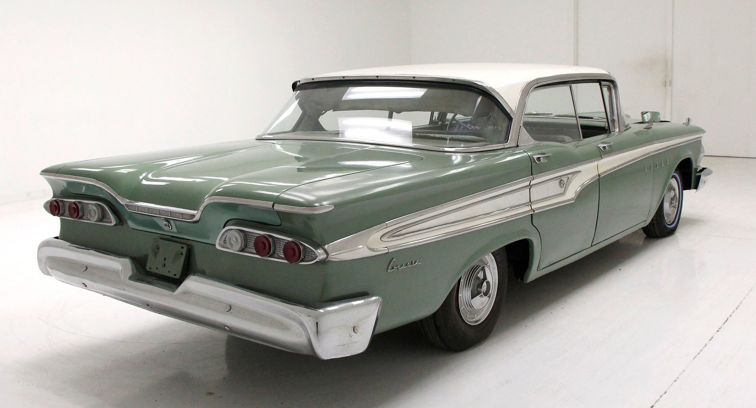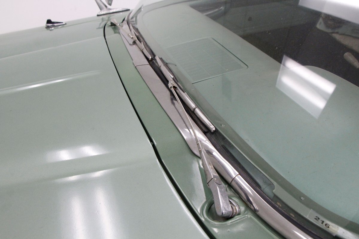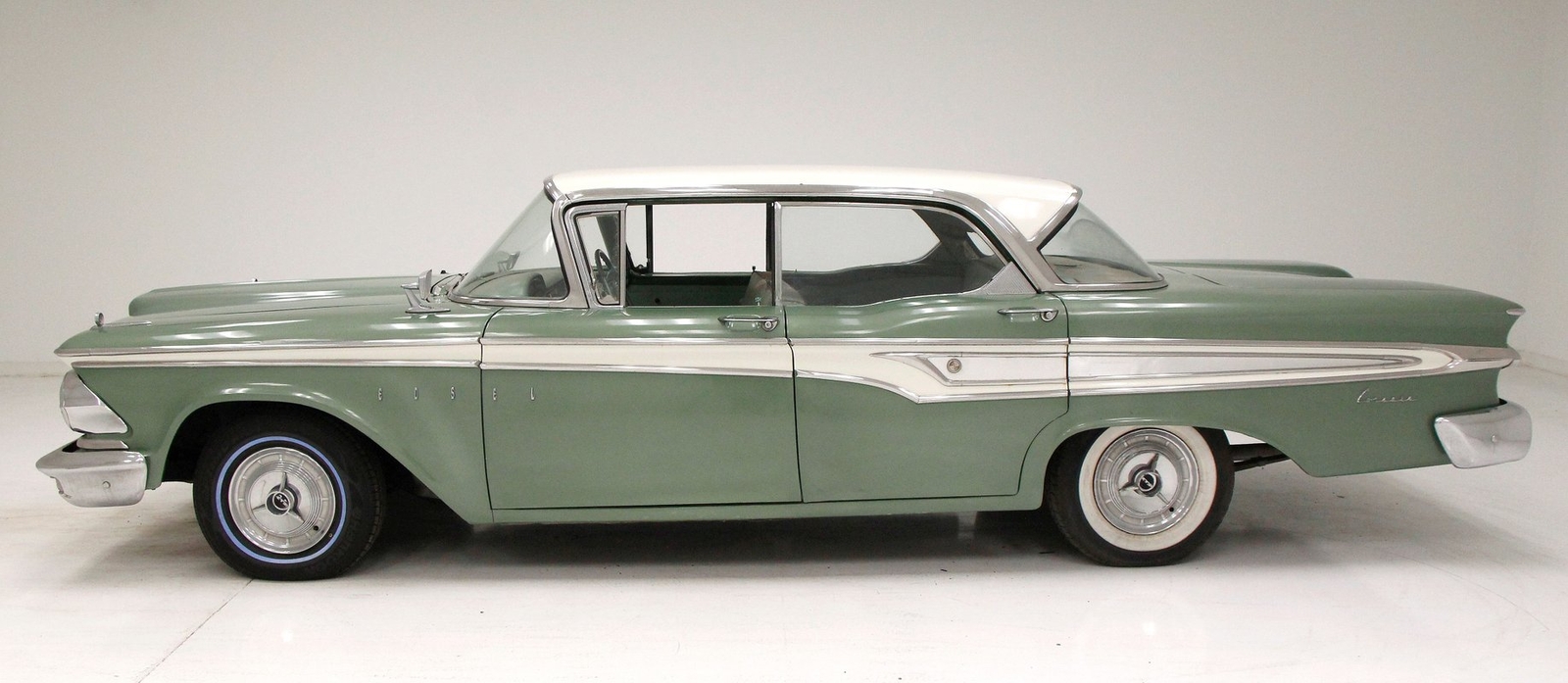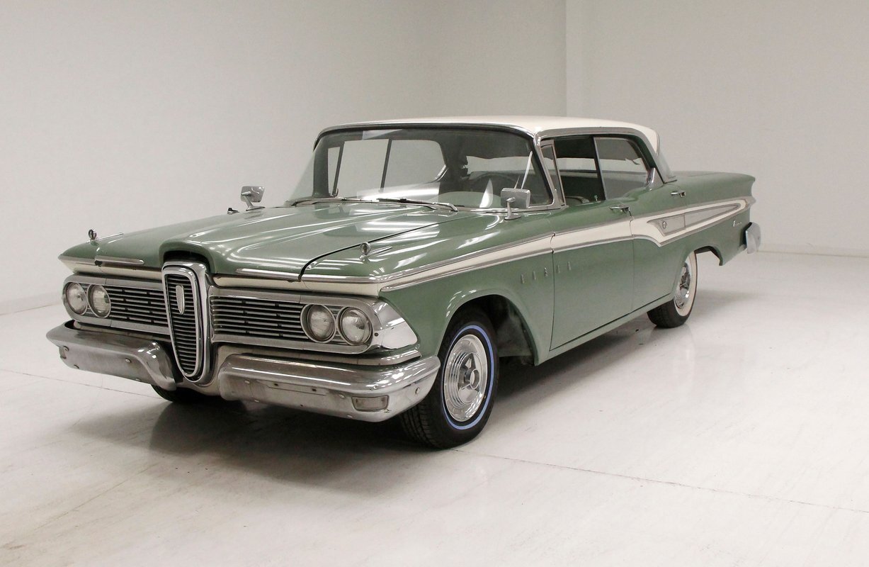 Not perfect but certainly solid as Mist Green and White bathes this long and mighty car, with fairly straight steel panels, and decently minded gaps. A white spear trimline runs the length of the car at the beltline and makes an artistic dip at mid rear door before melting back to a thin spear at the tail of the car. With the dual headlights flanking the horizontal grille ends, and the iconic vertical center known as the "toilet seat" or "vulva" grille, it was either loved or hated. This one presents in good condition with minor pitting and cloudiness of the chrome, as does the grille, and bumpers. A wrap-around windscreen fronts a massive chrome-trimmed greenhouse topped by the white metal roof. The rear of the car sports cat eye style 3 lens tail lights and a swooping Edsel badged spear across the trunk lid. All badging and brite-work is correct and attached and in good condition throughout, as over embellishment abounds, right down to the complex design and the chromed side view mirrors. Some rust bubbling is noted on the lower panels with the worst area being the lower section of the passenger's rear door. Tri-point emblazoned wheel covers are on and like new 14" tires are seen all around.