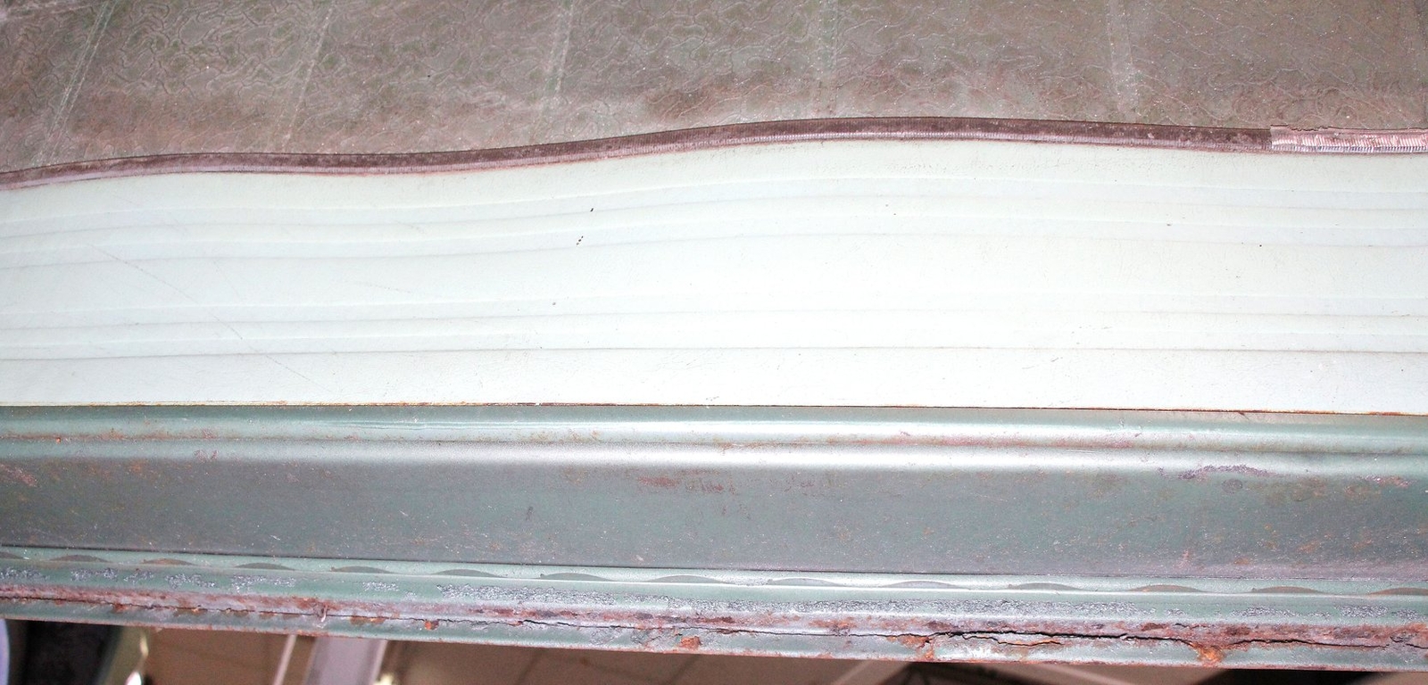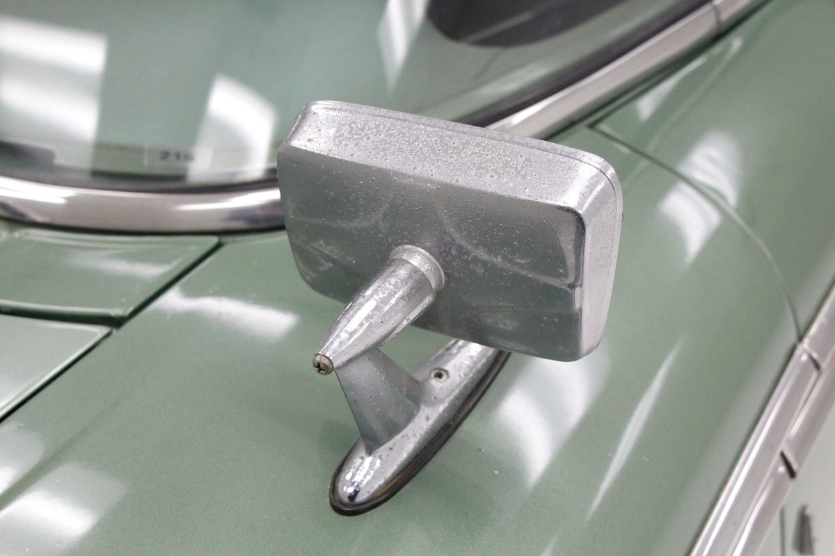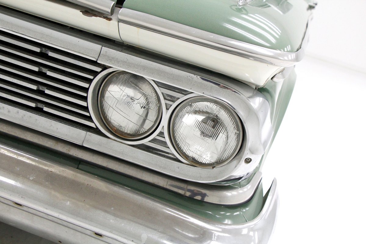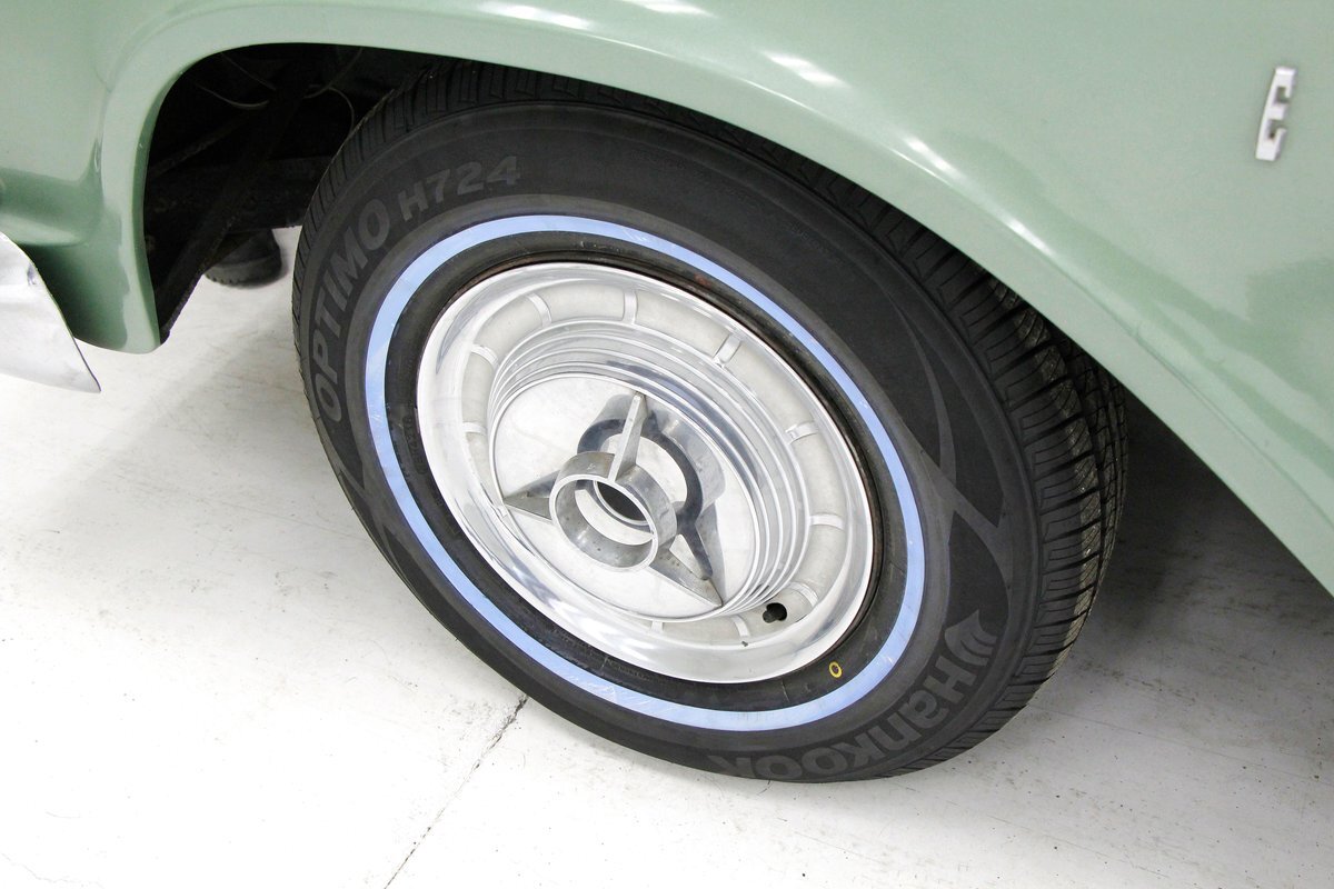 Not perfect but certainly solid as Mist Green and White bathes this long and mighty car, with fairly straight steel panels, and decently minded gaps. A white spear trimline runs the length of the car at the beltline and makes an artistic dip at mid rear door before melting back to a thin spear at the tail of the car. With the dual headlights flanking the horizontal grille ends, and the iconic vertical center known as the "toilet seat" or "vulva" grille, it was either loved or hated. This one presents in good condition with minor pitting and cloudiness of the chrome, as does the grille, and bumpers. A wrap-around windscreen fronts a massive chrome-trimmed greenhouse topped by the white metal roof. The rear of the car sports cat eye style 3 lens tail lights and a swooping Edsel badged spear across the trunk lid. All badging and brite-work is correct and attached and in good condition throughout, as over embellishment abounds, right down to the complex design and the chromed side view mirrors. Some rust bubbling is noted on the lower panels with the worst area being the lower section of the passenger's rear door. Tri-point emblazoned wheel covers are on and like new 14" tires are seen all around.