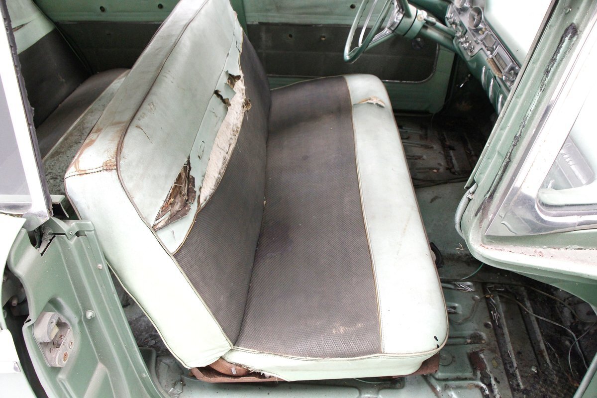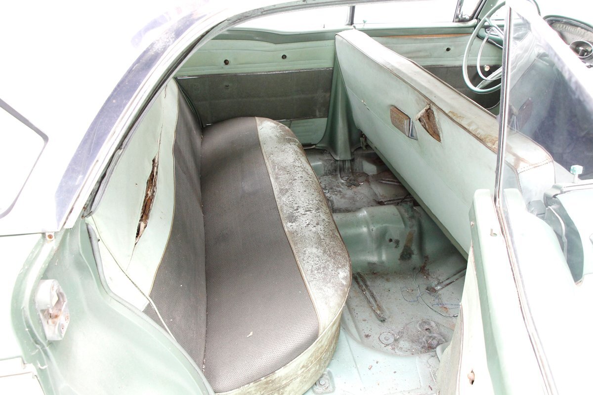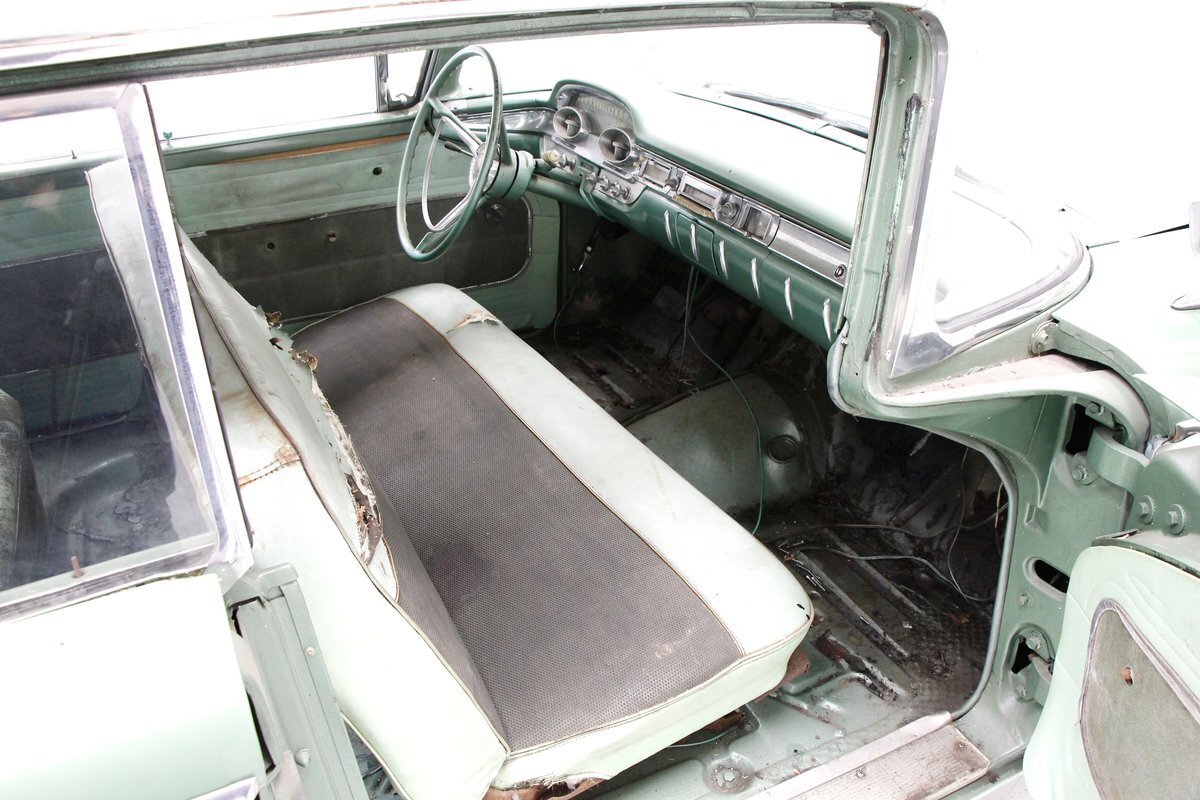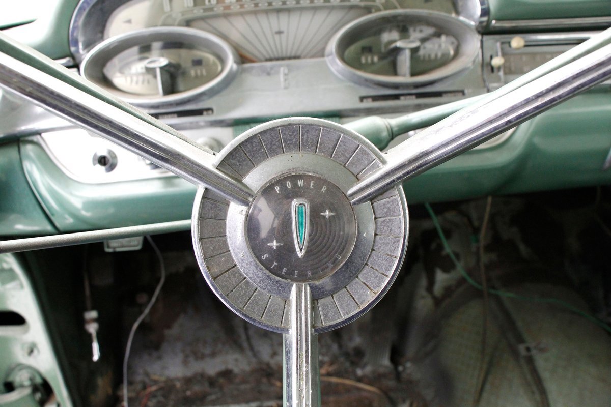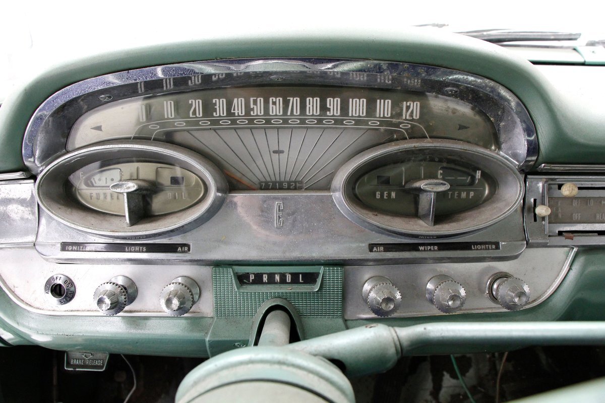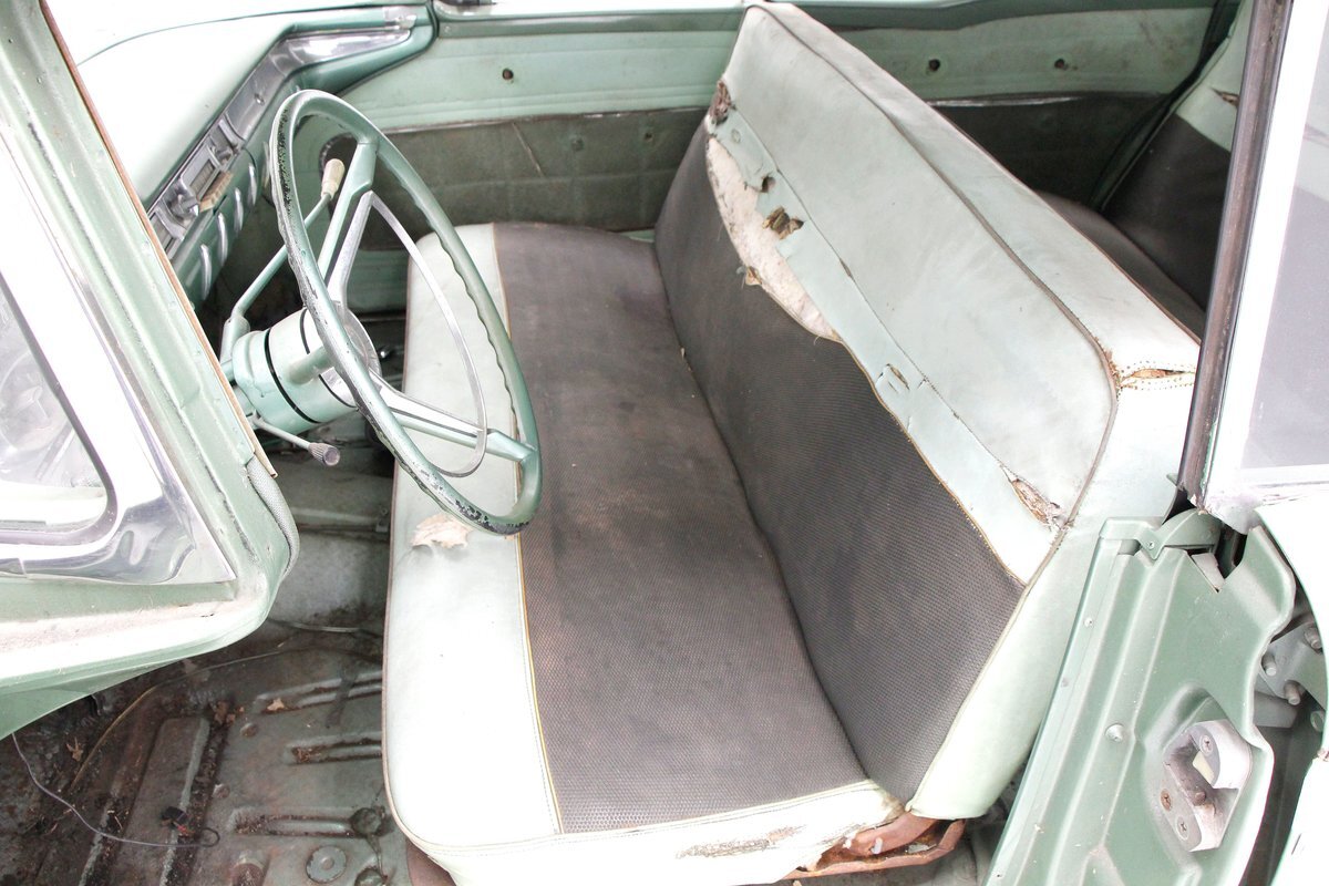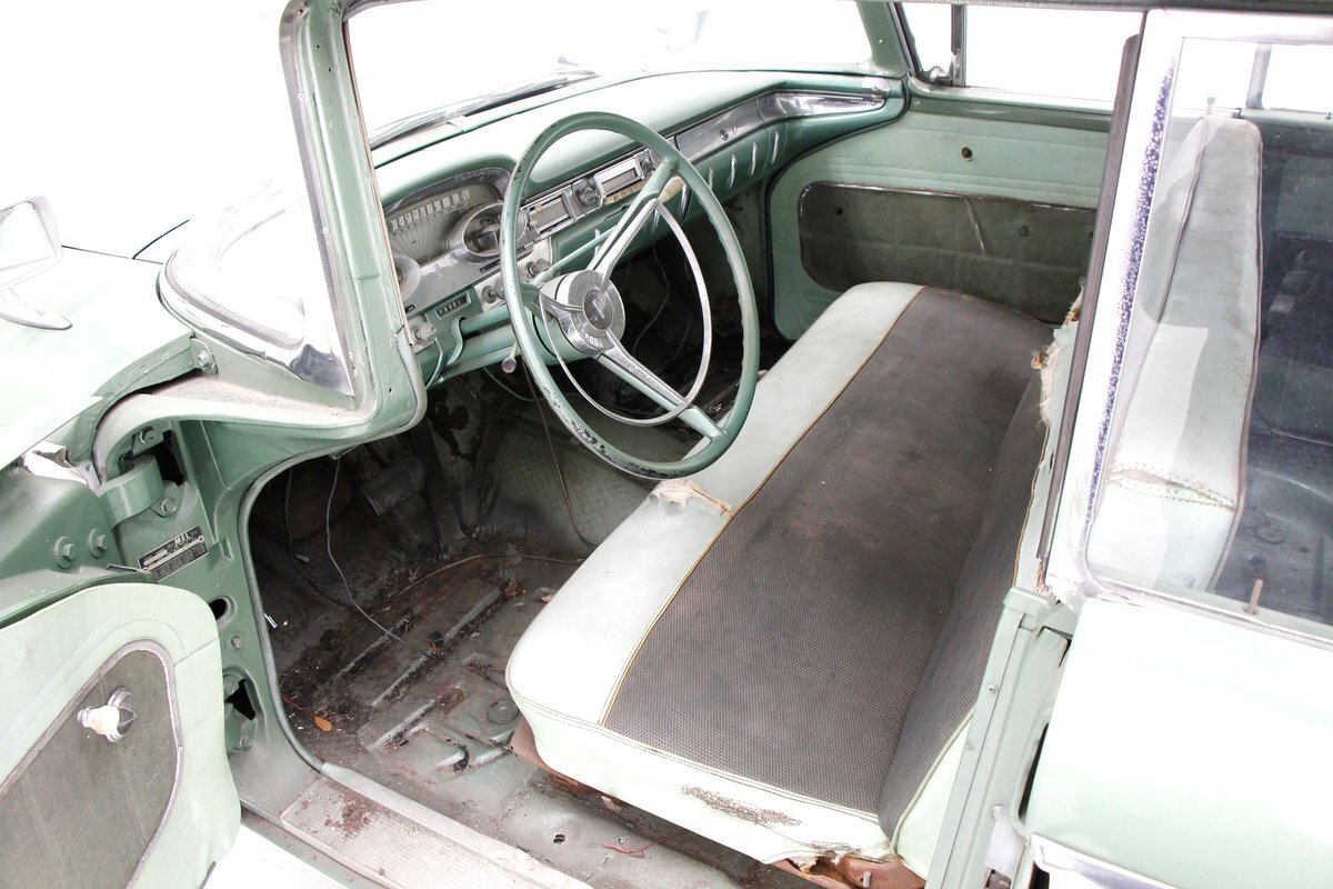 Speaking of 50s styling, it continues in earnest with the interior and a swing of the doors. Here we see town tone green with a light green on the stitched and embroidered vinyl top and a darker green reception cloth panel below in which has been stripped of its armrest and chrome actuators. The inside seating reveals some tattered and torn but complete split back benches with lighter green vinyl bolsters and green tweed broadcloth just a bit darker for the inserts. A soiled light green headliner hangs above and below is just painted steel flooring. I feel like this car may have an identity crisis with all the shades of green seen on all the different surfaces. The original green dash is showing in good condition with lightly tarnished chrome, along with pulls, dials and bakelite buttons for the heater slides and radio pushbuttons. We have to give an A for effort though as it is futuristic with its highlight being chrome and LOTS OF IT! The original steering wheel is present and accounted for but gone this year is the teletouch shifter, a simple column shifter has taken its place.