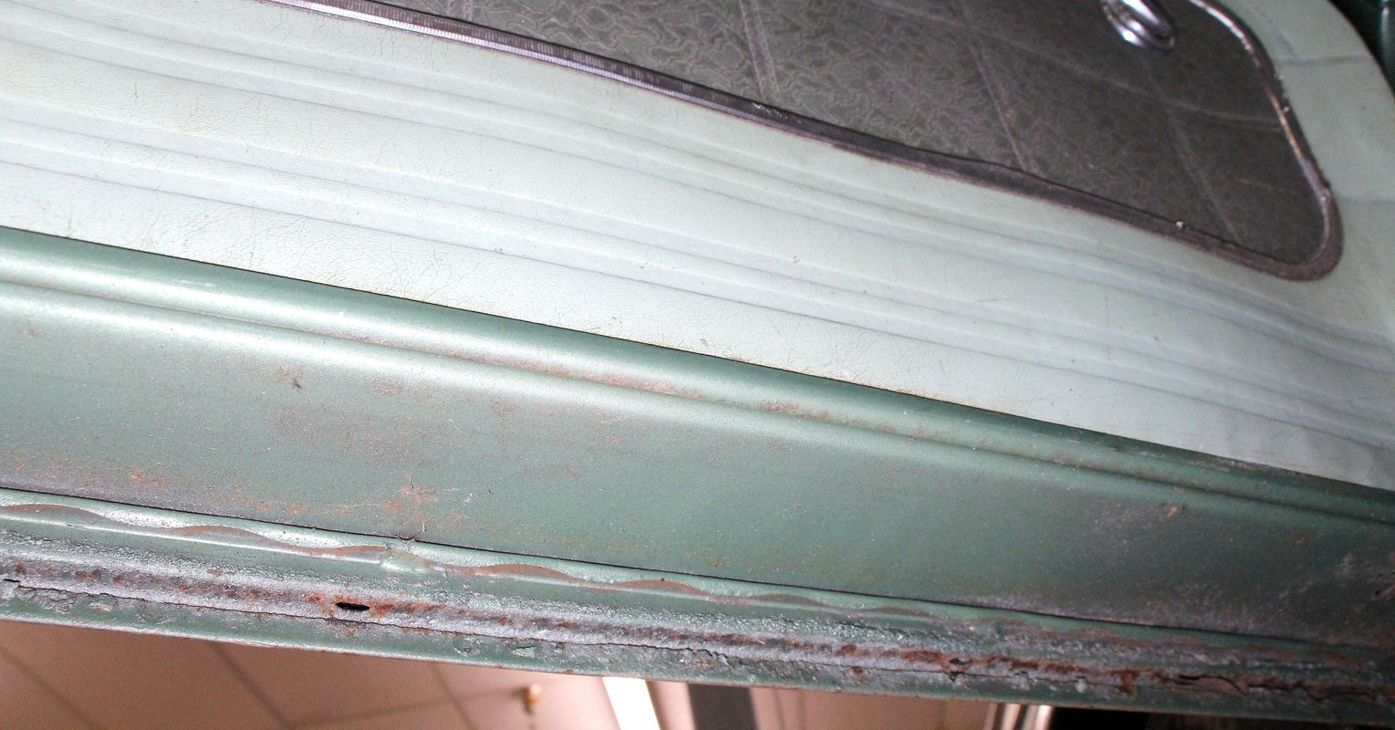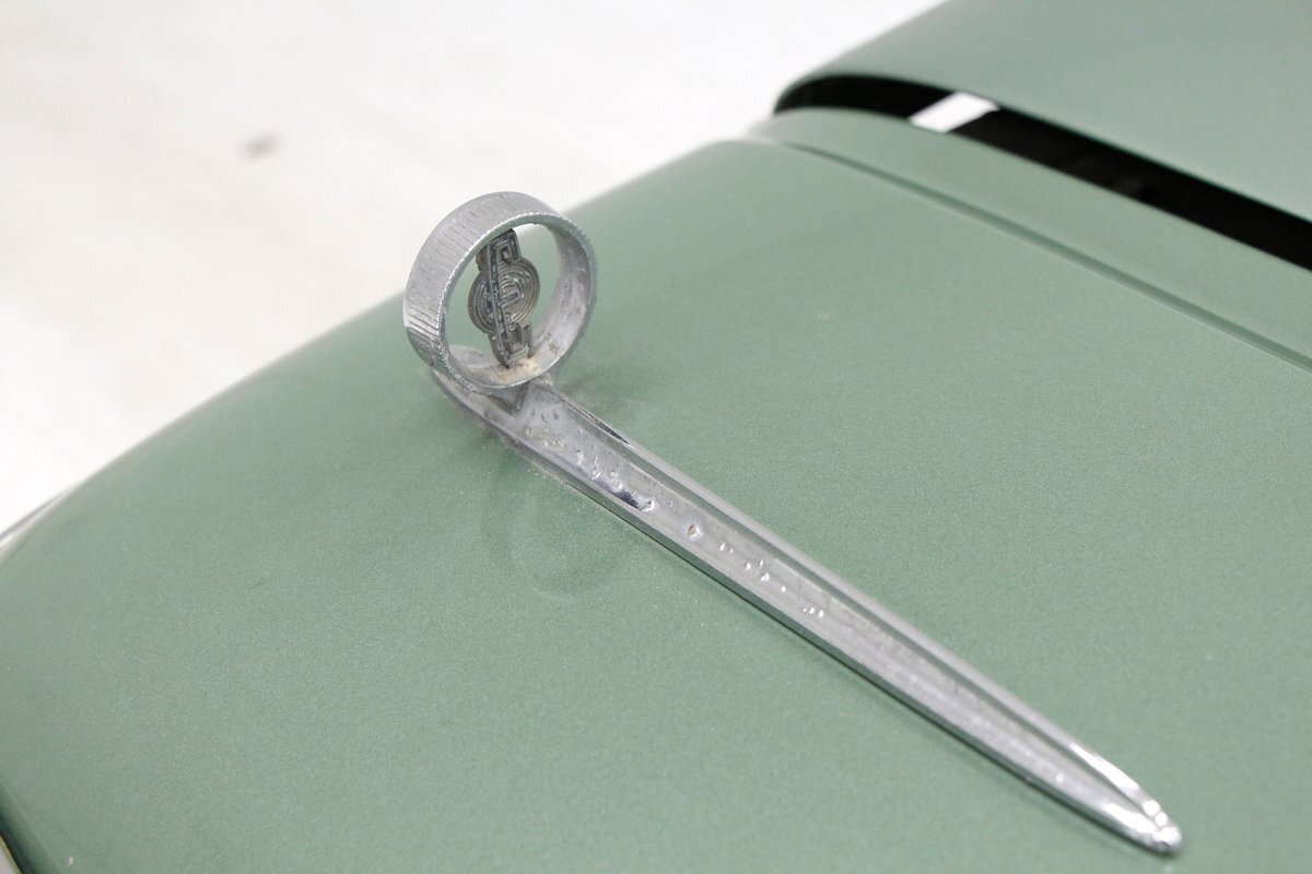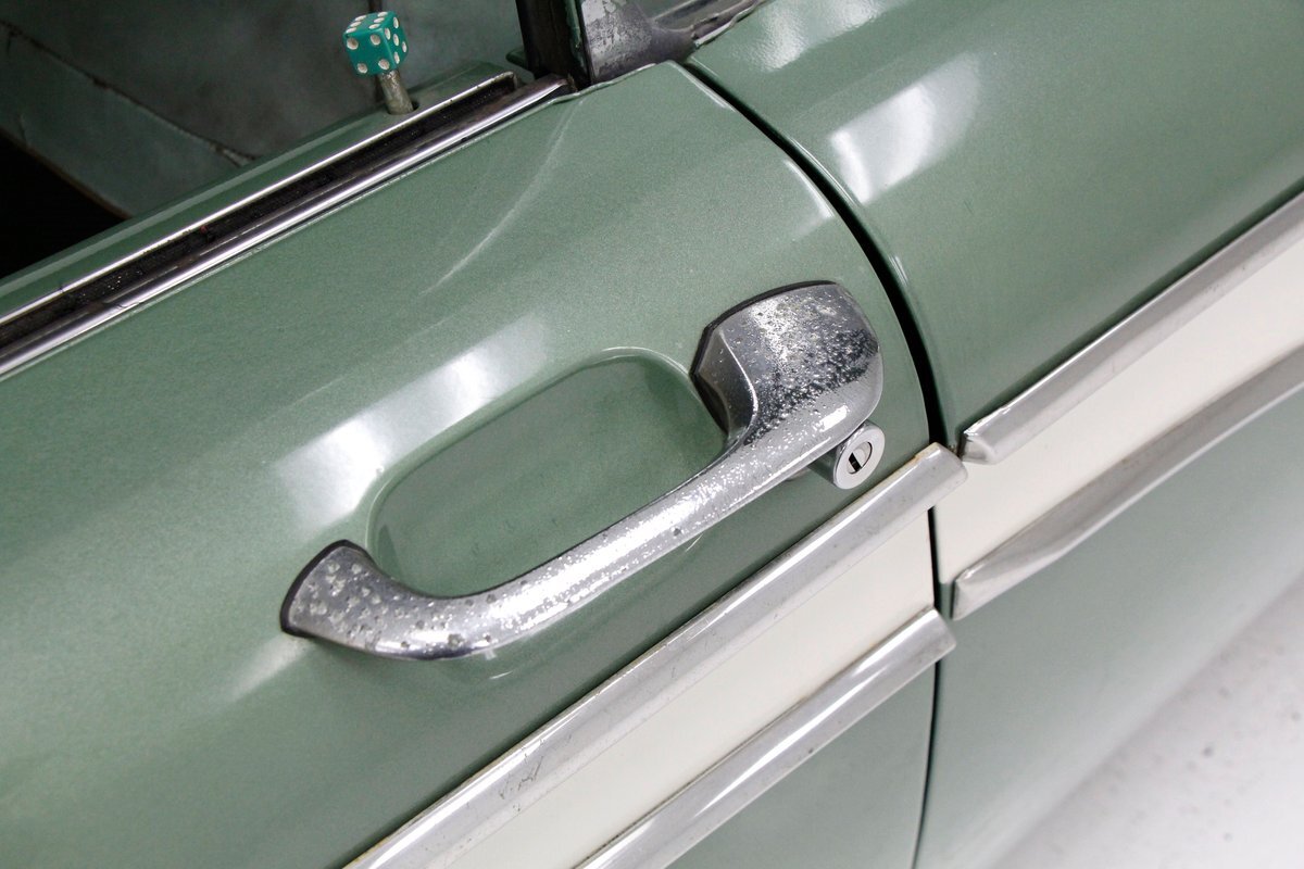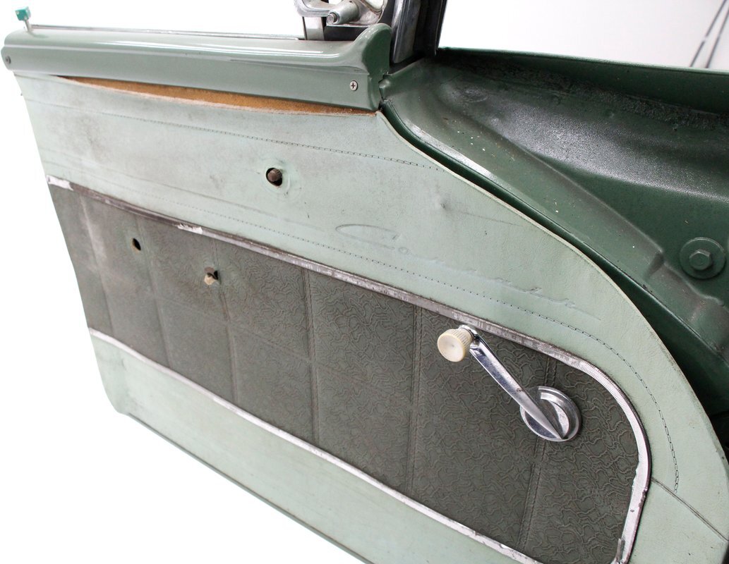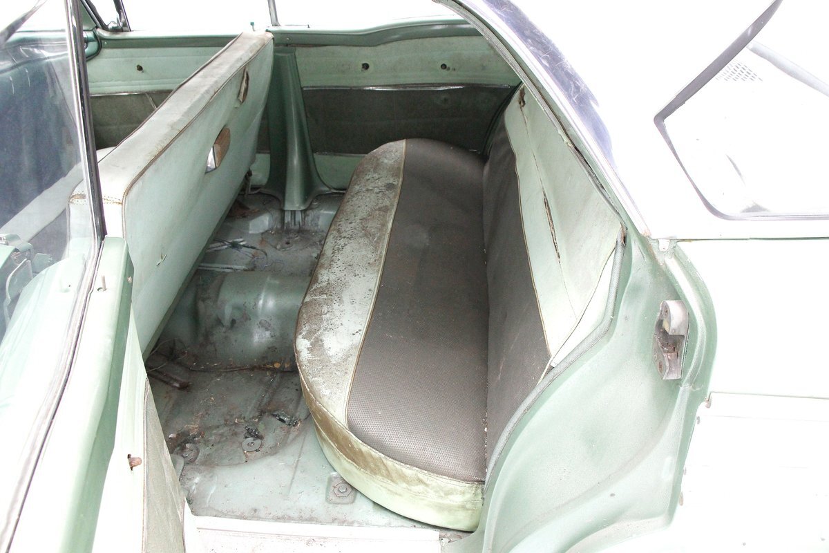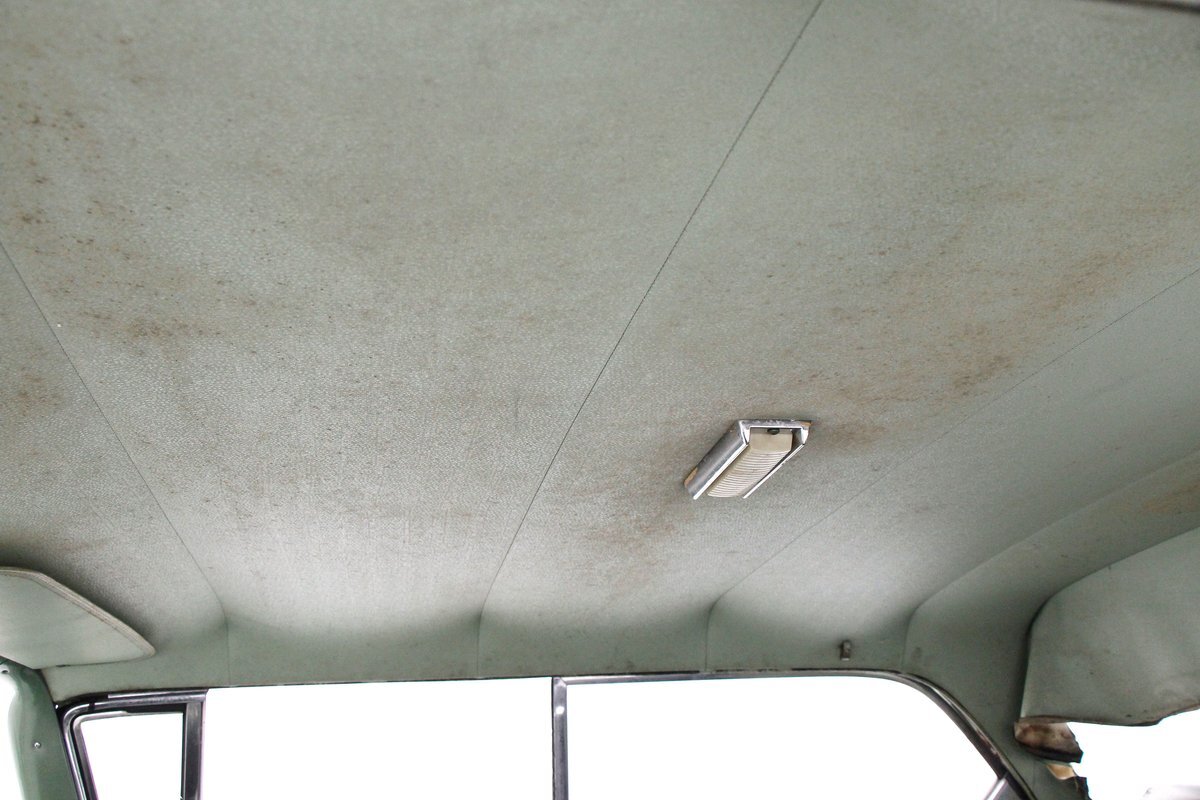 Speaking of 50s styling, it continues in earnest with the interior and a swing of the doors. Here we see town tone green with a light green on the stitched and embroidered vinyl top and a darker green reception cloth panel below in which has been stripped of its armrest and chrome actuators. The inside seating reveals some tattered and torn but complete split back benches with lighter green vinyl bolsters and green tweed broadcloth just a bit darker for the inserts. A soiled light green headliner hangs above and below is just painted steel flooring. I feel like this car may have an identity crisis with all the shades of green seen on all the different surfaces. The original green dash is showing in good condition with lightly tarnished chrome, along with pulls, dials and bakelite buttons for the heater slides and radio pushbuttons. We have to give an A for effort though as it is futuristic with its highlight being chrome and LOTS OF IT! The original steering wheel is present and accounted for but gone this year is the teletouch shifter, a simple column shifter has taken its place.