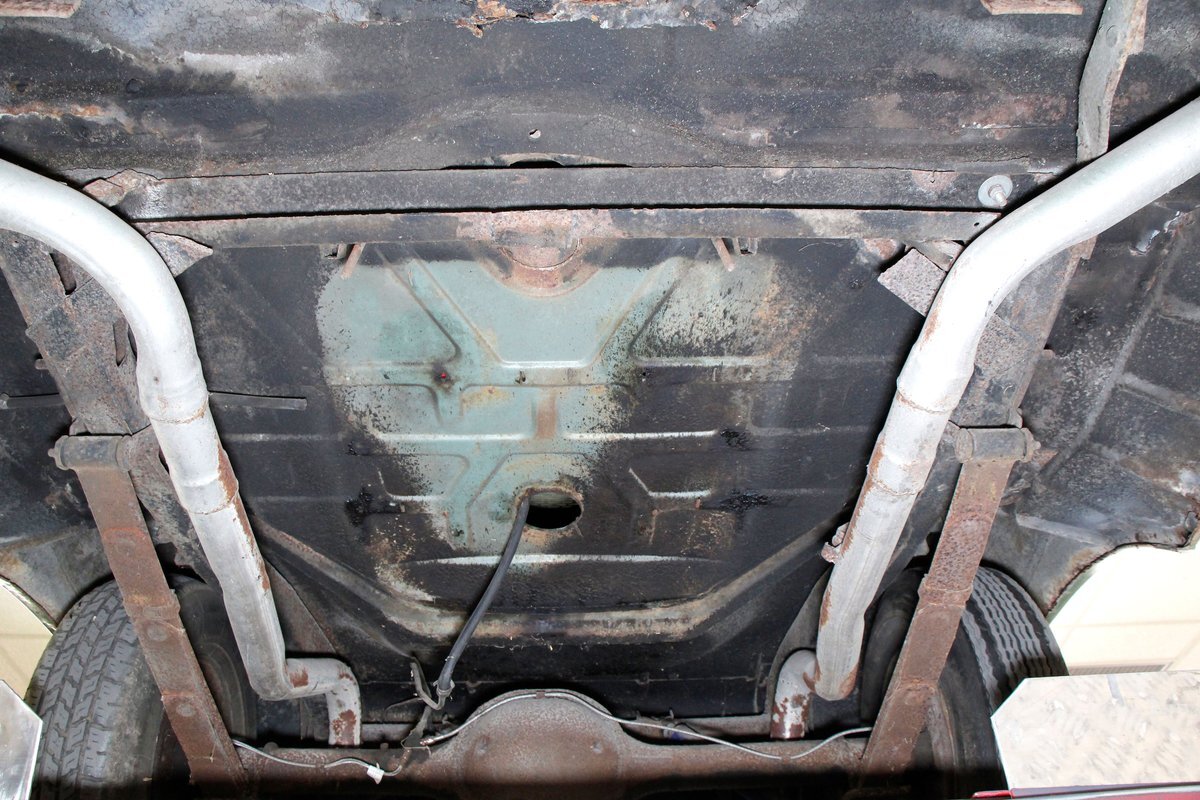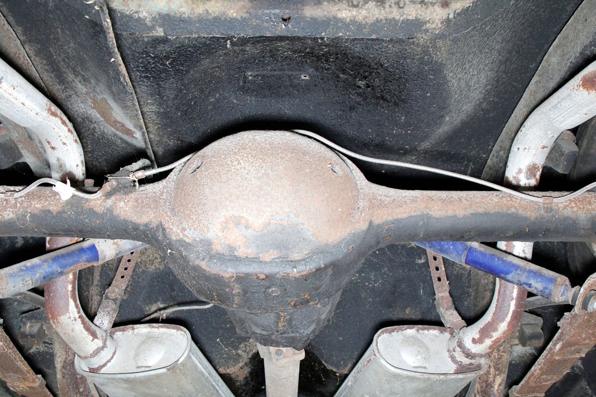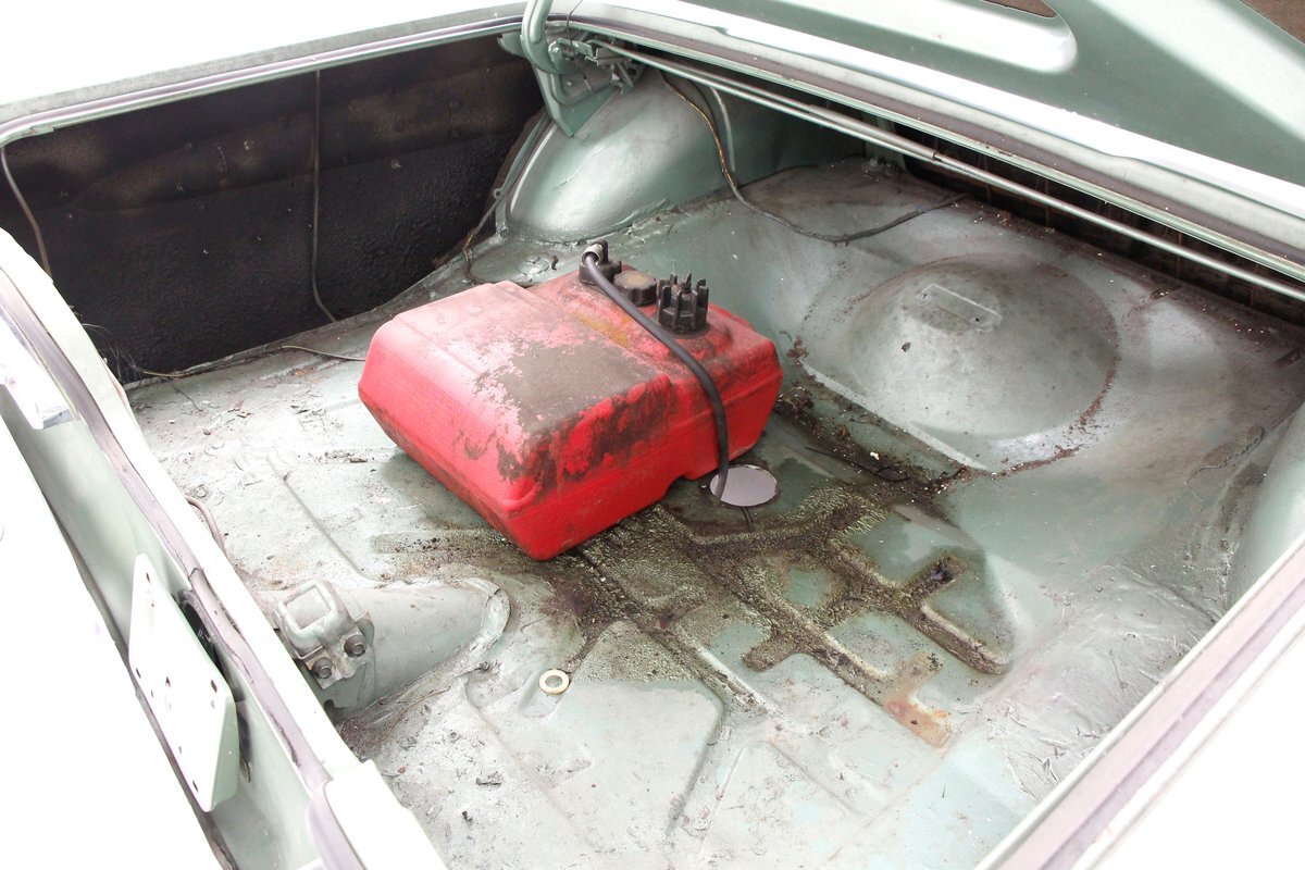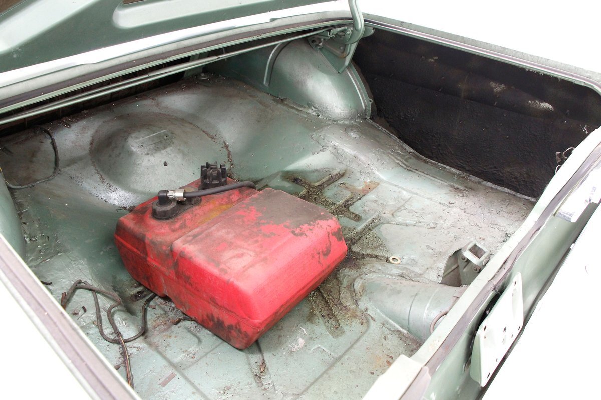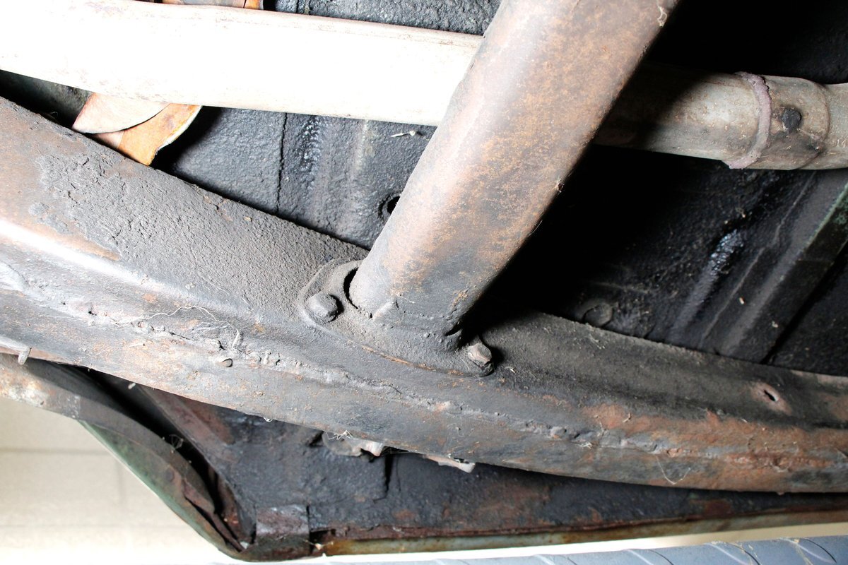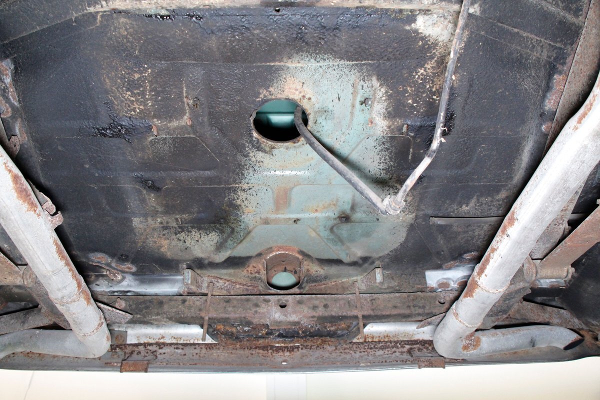 Underneath looking quite good with some surface rust, a solid frame as well as floor pans. Some rot on the rockers can be noted throughout the sides where they greet the frame. This car sports drum braking all around as well as independent front suspension and rear leaf springs. We note the fuel tank has been removed and the engine now is fed from a jug in the trunk.