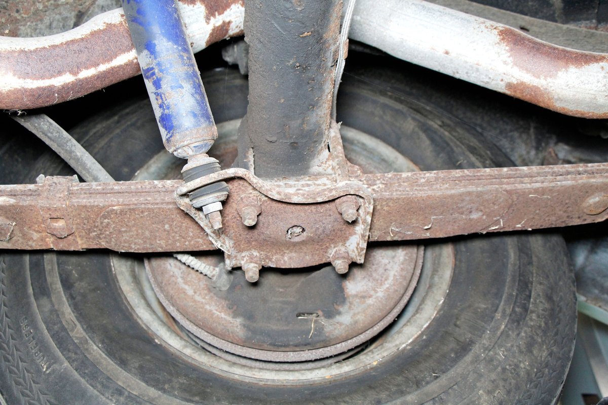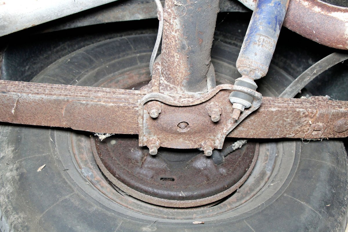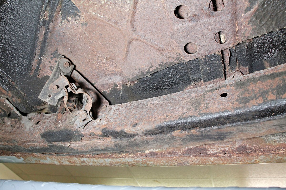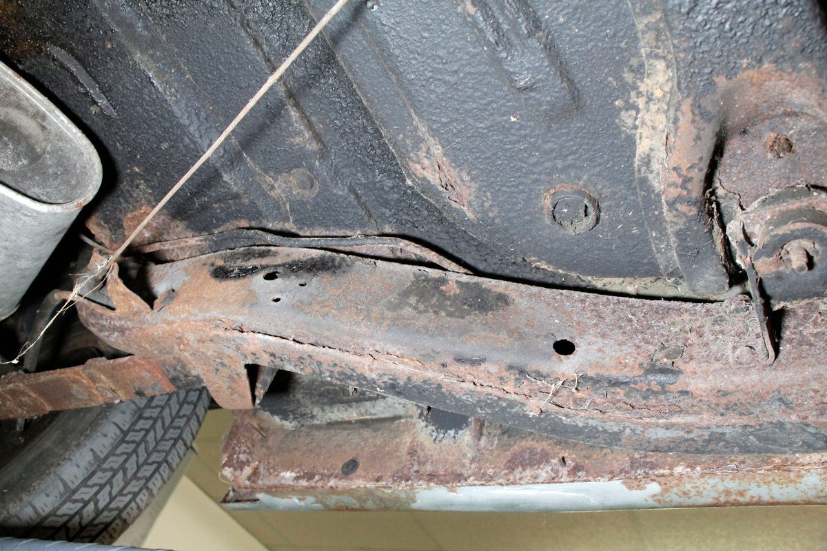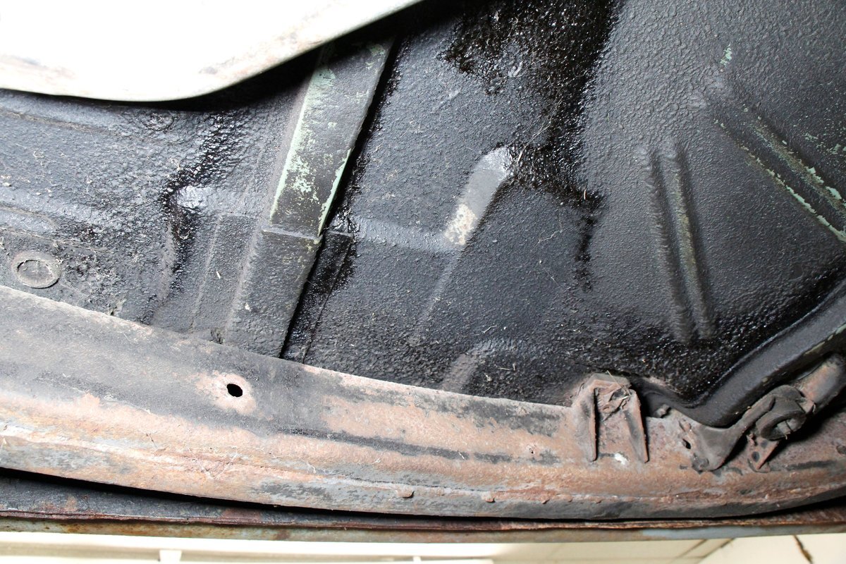 Underneath looking quite good with some surface rust, a solid frame as well as floor pans. Some rot on the rockers can be noted throughout the sides where they greet the frame. This car sports drum braking all around as well as independent front suspension and rear leaf springs. We note the fuel tank has been removed and the engine now is fed from a jug in the trunk.