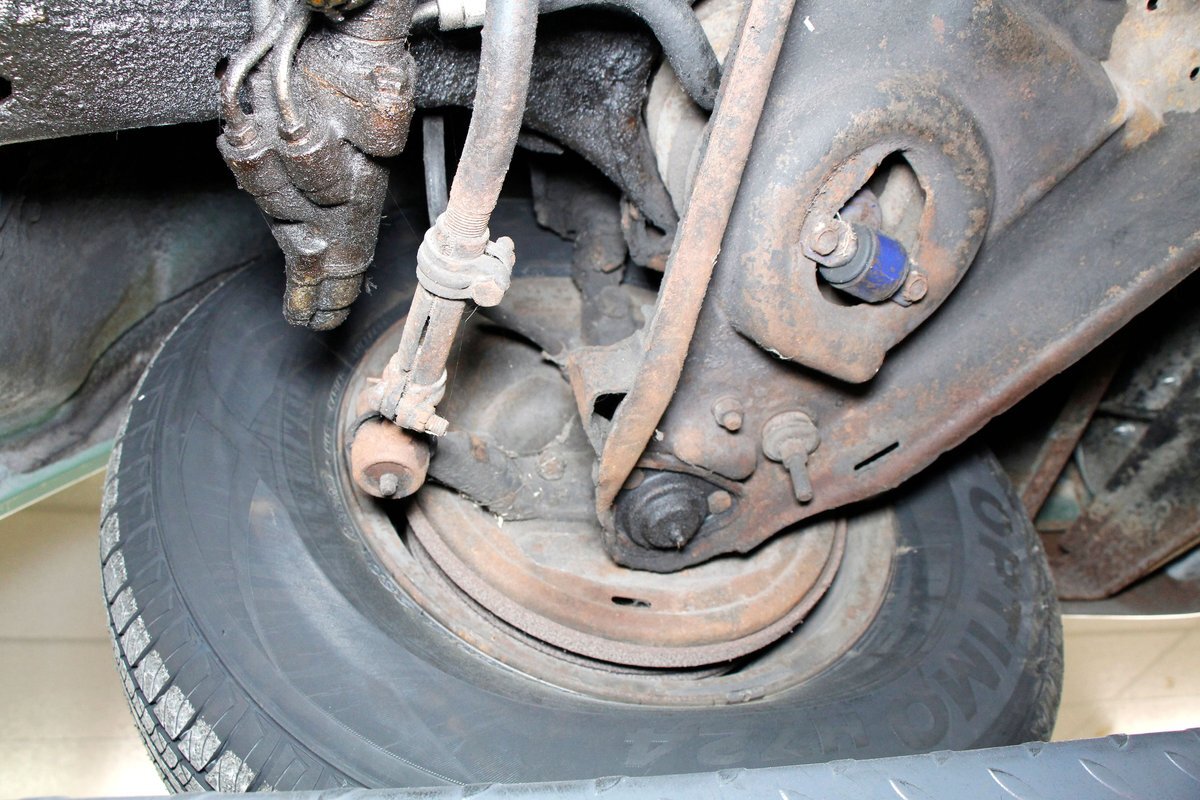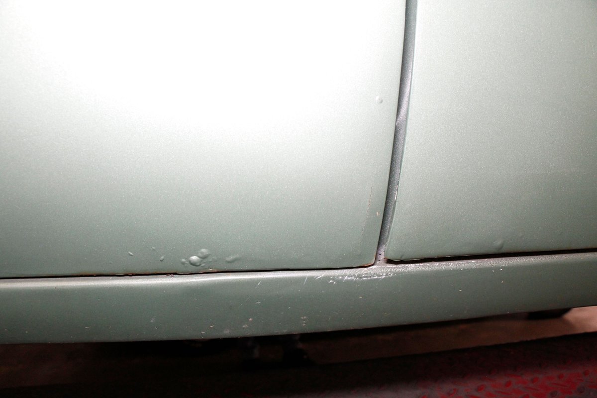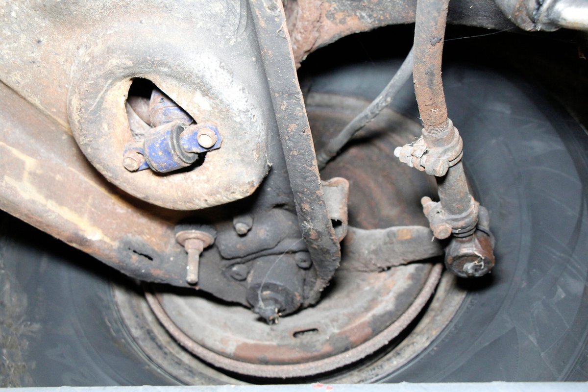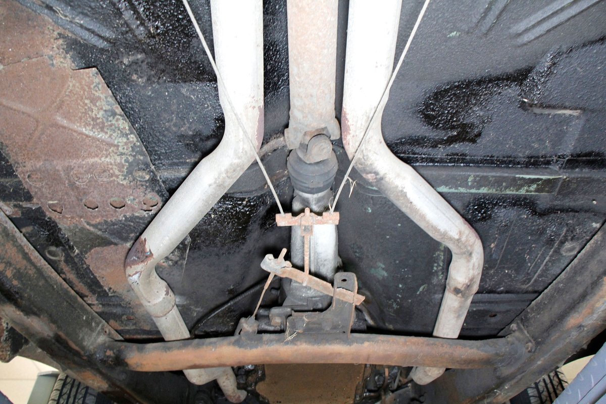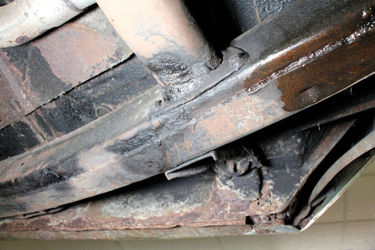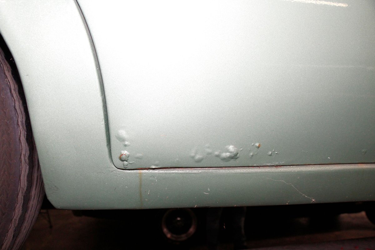 Underneath looking quite good with some surface rust, a solid frame as well as floor pans. Some rot on the rockers can be noted throughout the sides where they greet the frame. This car sports drum braking all around as well as independent front suspension and rear leaf springs. We note the fuel tank has been removed and the engine now is fed from a jug in the trunk.
