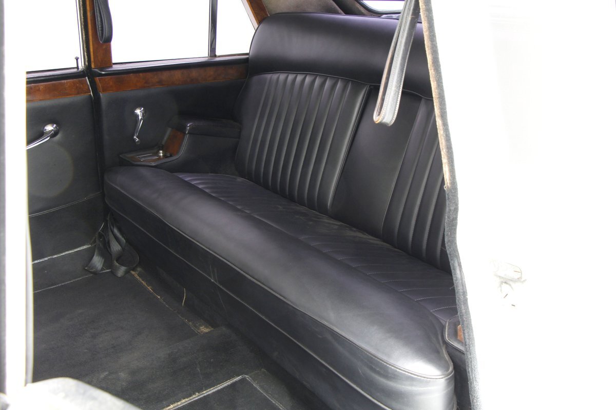 2 separate compartments basically make up the interior. Up front we note the drivers compartment which is a right-hand drive setup. A large black bench stretches from door to door and is very nicely preserved. A burl veneer dash also stretches the width of this car, and contains numerous gauges inserted, temperature controls, and a litany of toggles. The burl has lost some of its lacquer and shows some wear. Separating the two areas of this car is a burl covered partition with a sliding plastic window for extra privacy. In this space we note another luxurious black bench with side arms that contain essential controls and a full cigarette/cigar lighting and ashtray capabilities. Next to the partition are dual footrests that can become extras jump seats if needed. Black clean carpet floods all the floors and a fuzzy broadcloth in off white makes up the headliner.