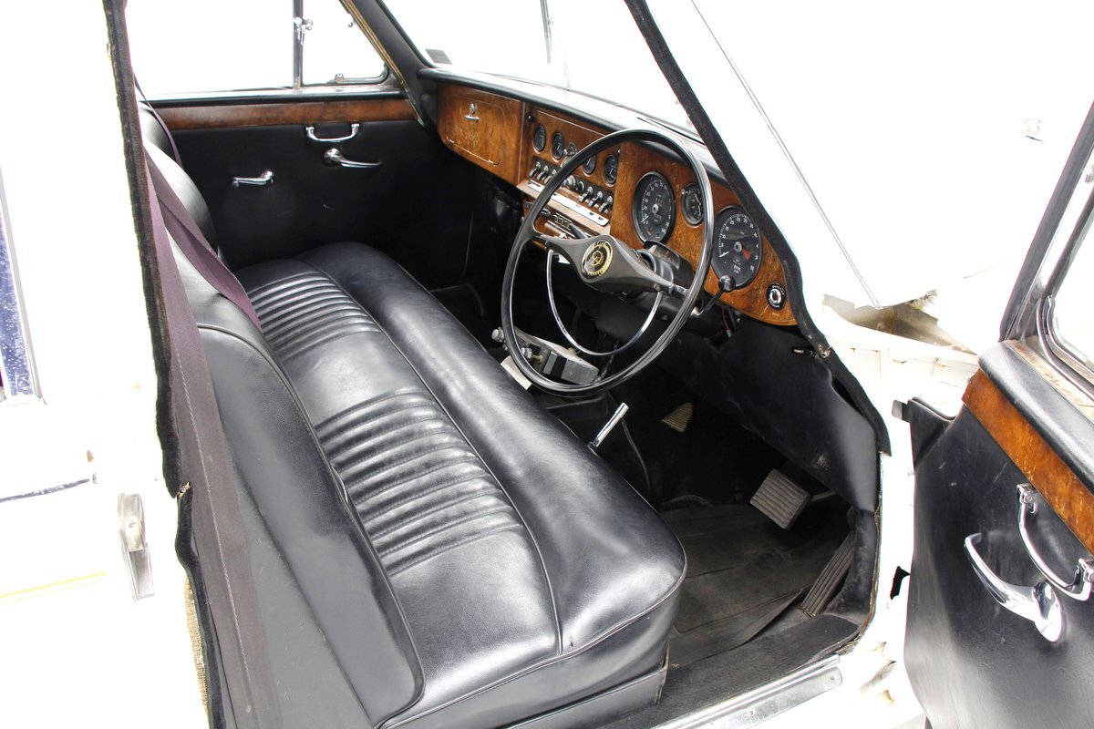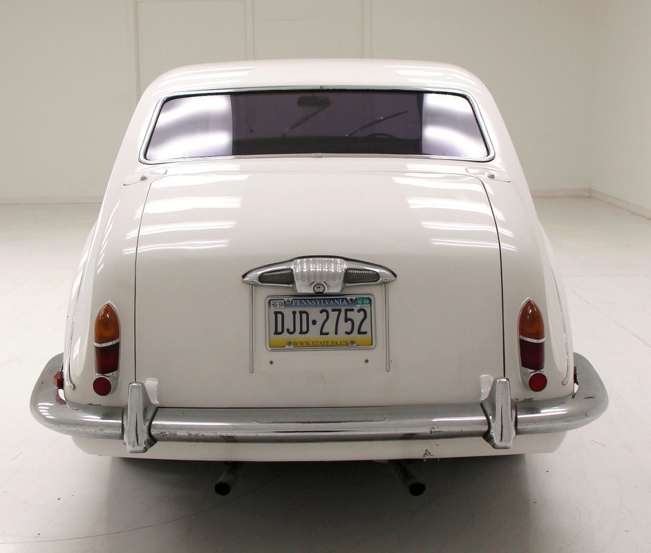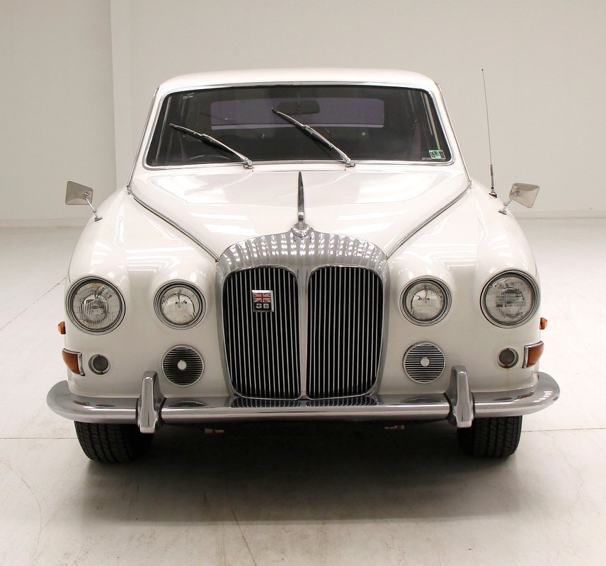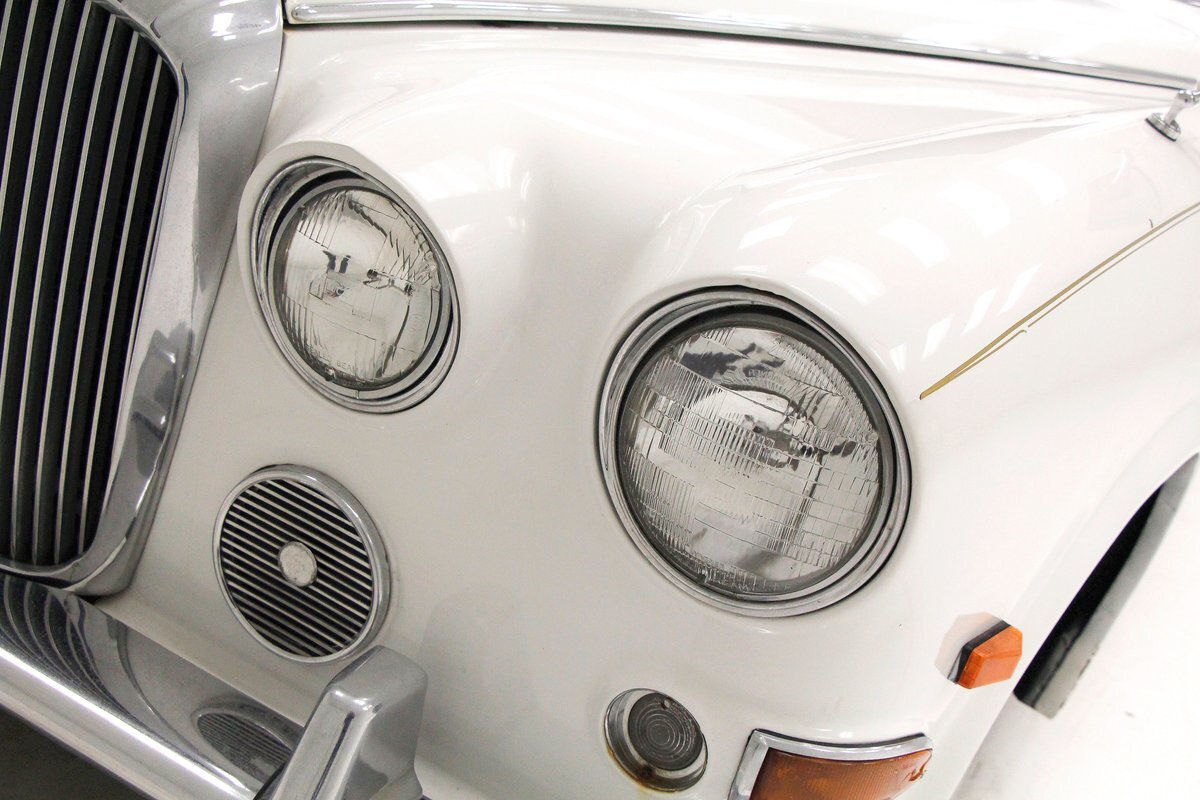 With its Jaguar-esque 4 round light setup which flanks a centrally mounted grille and radiator surround, and framing by a lower thin front bumper, one can see the influences of the two companies (Daimler and Jaguar) coming together in the design of this car. It is bathed in white paint with steel panels showing some minor rust spots and scratches, but still retaining its shine. The chrome accoutrements have a nice patina and dulling and are showing signs of some early dimpling. This is true for the front and the rear of this limousine. The driver's door up front is the same width as the rear passengers, but due to the hinging into the front quarter panel, the side glass area is markedly less than the rear passengers. The rear glass has been tinted and has an extra window and triangular vent window which starts to follow the downward swooping curve of the trunk area. A very graceful trim spear runs through the door handles and helps frame the rear downward swoop of the body. In back, we note a large bulbous trunk another thin bumper below and dual exhaust tips hanging below. 15-inch wheels are all around with standard hubcaps.