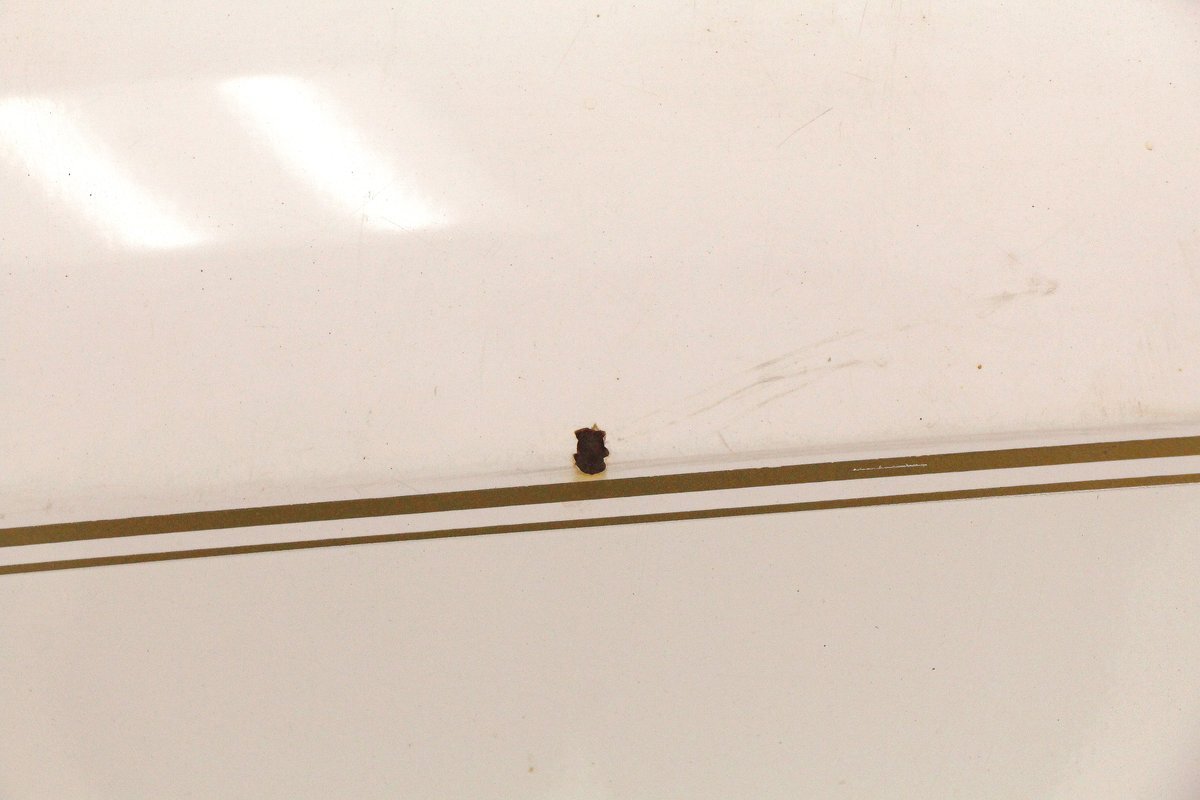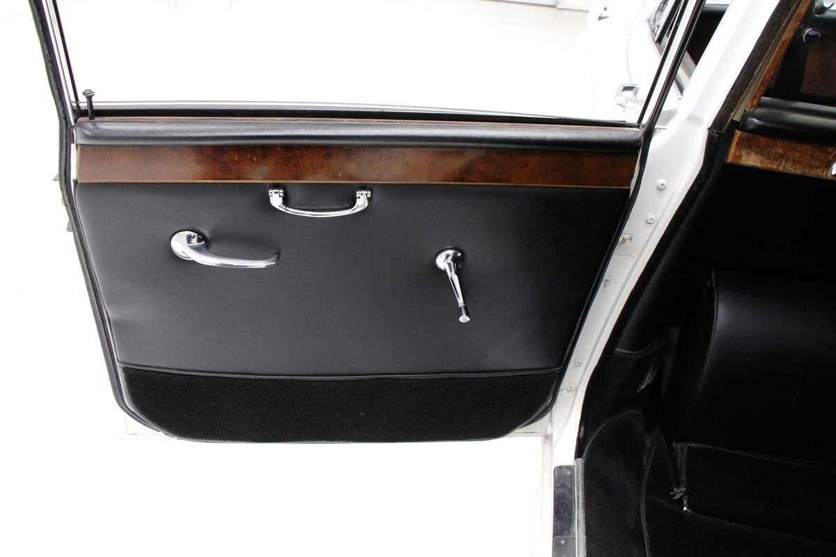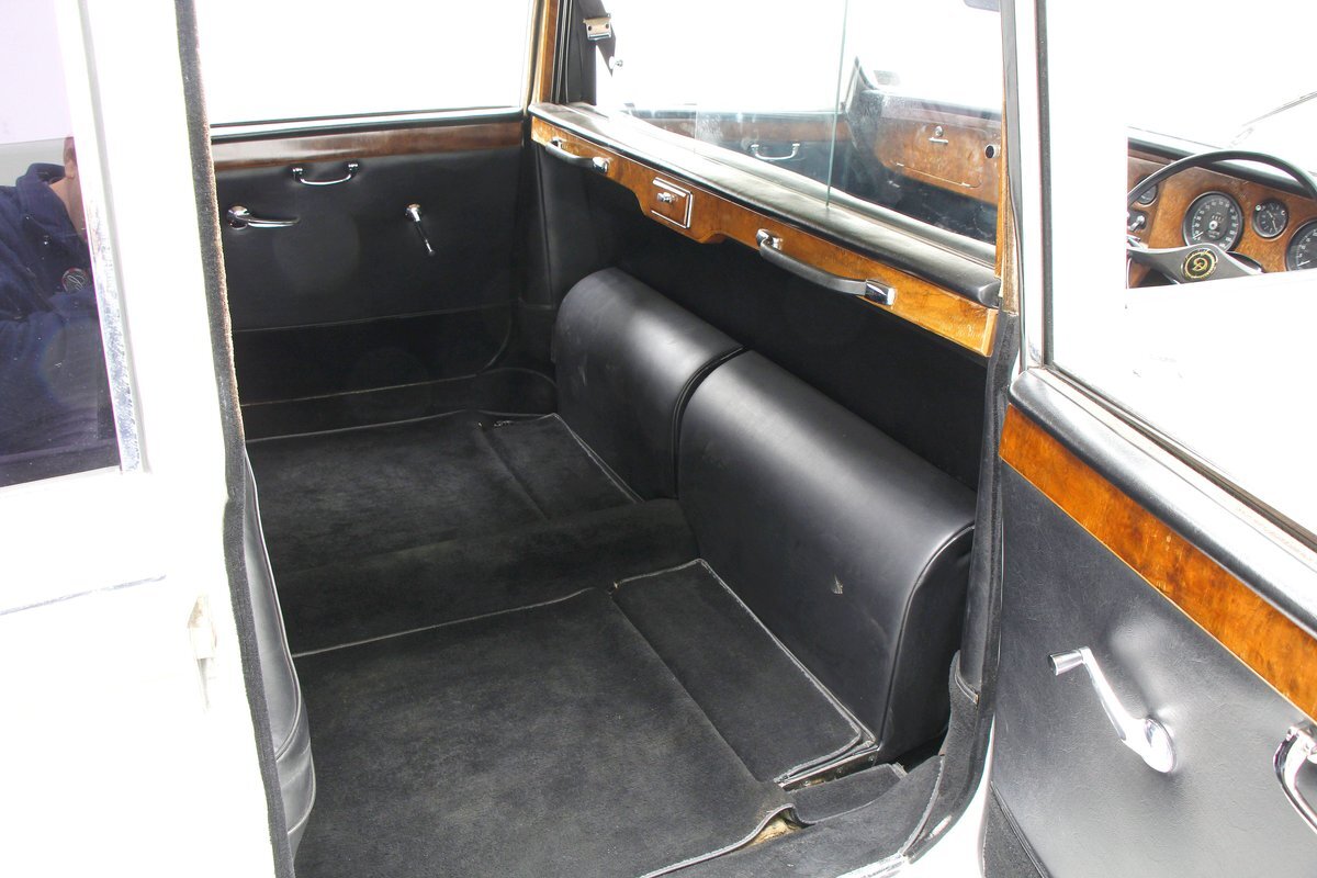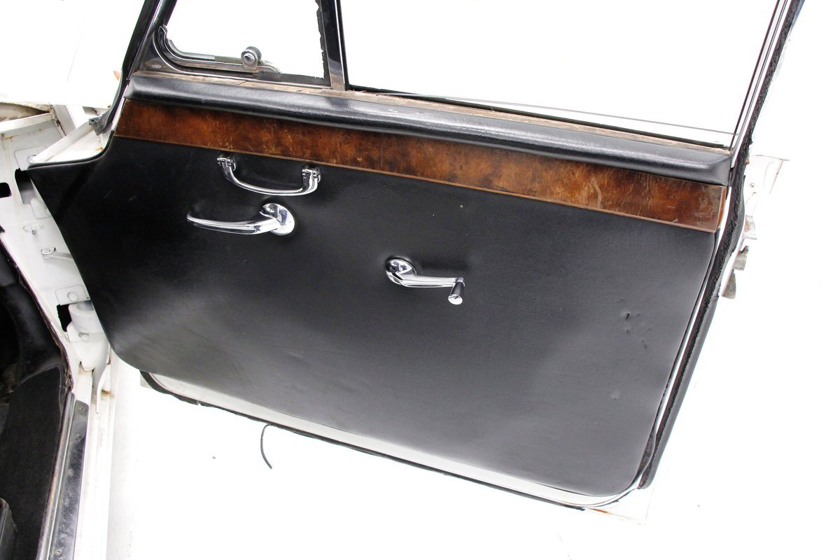 With its Jaguar-esque 4 round light setup which flanks a centrally mounted grille and radiator surround, and framing by a lower thin front bumper, one can see the influences of the two companies (Daimler and Jaguar) coming together in the design of this car. It is bathed in white paint with steel panels showing some minor rust spots and scratches, but still retaining its shine. The chrome accoutrements have a nice patina and dulling and are showing signs of some early dimpling. This is true for the front and the rear of this limousine. The driver's door up front is the same width as the rear passengers, but due to the hinging into the front quarter panel, the side glass area is markedly less than the rear passengers. The rear glass has been tinted and has an extra window and triangular vent window which starts to follow the downward swooping curve of the trunk area. A very graceful trim spear runs through the door handles and helps frame the rear downward swoop of the body. In back, we note a large bulbous trunk another thin bumper below and dual exhaust tips hanging below. 15-inch wheels are all around with standard hubcaps.