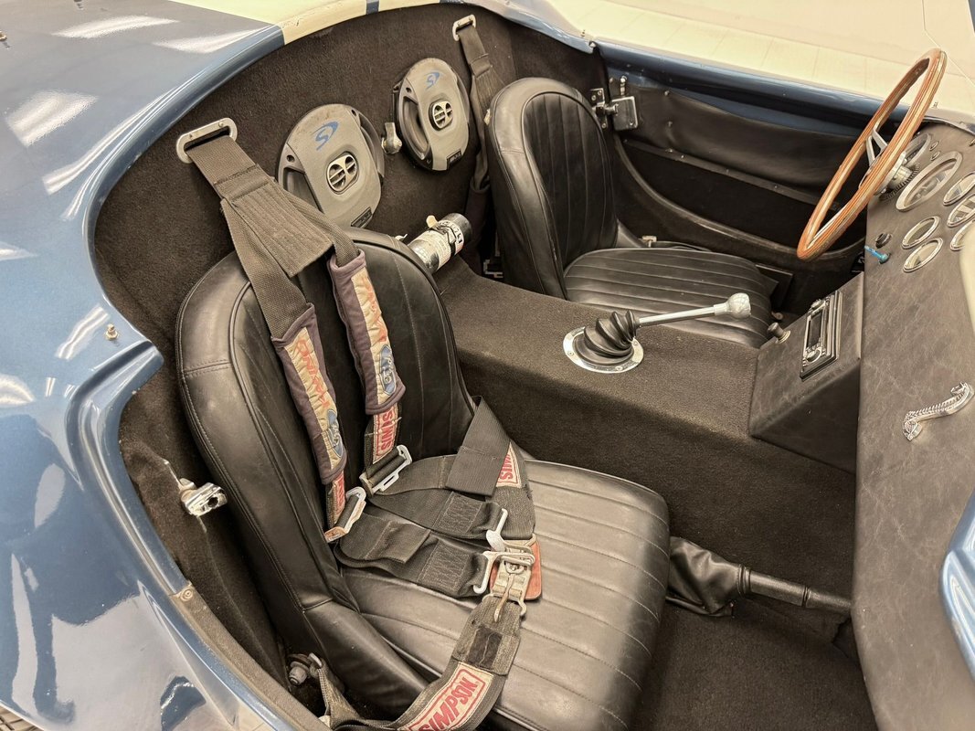 As a purpose built race car, Cobras never featured many creature comforts on the inside, and that's part of the appeal. A basic vinyl cover and saddle leather hinge limiters make up the ingredients of the door, with the metal actuator close to the door jamb. The black vinyl bucket seats are low and lack any bolster whatsoever. Again, part of the mystique but augmented by the racing harness that is a requisite part of these cars. The steering wheel is a close replica of the original with three spokes and a wood rim. The vinyl covered dash has all the critical gauges, lights, and toggle switches and is pleasantly simple. An AM/FM/CD radio represents the only creature comfort added. The stick is mounted in the center console and tracing the transmission tunnel back, we find a fire extinguisher and a pair of Alpine speakers on the back wall, along with a fuel shut off switch. Low pile black carpet meets a diamond steel plate under the race pedals. The trunk is lined in molded aluminum and houses an amplifier for the stereo.