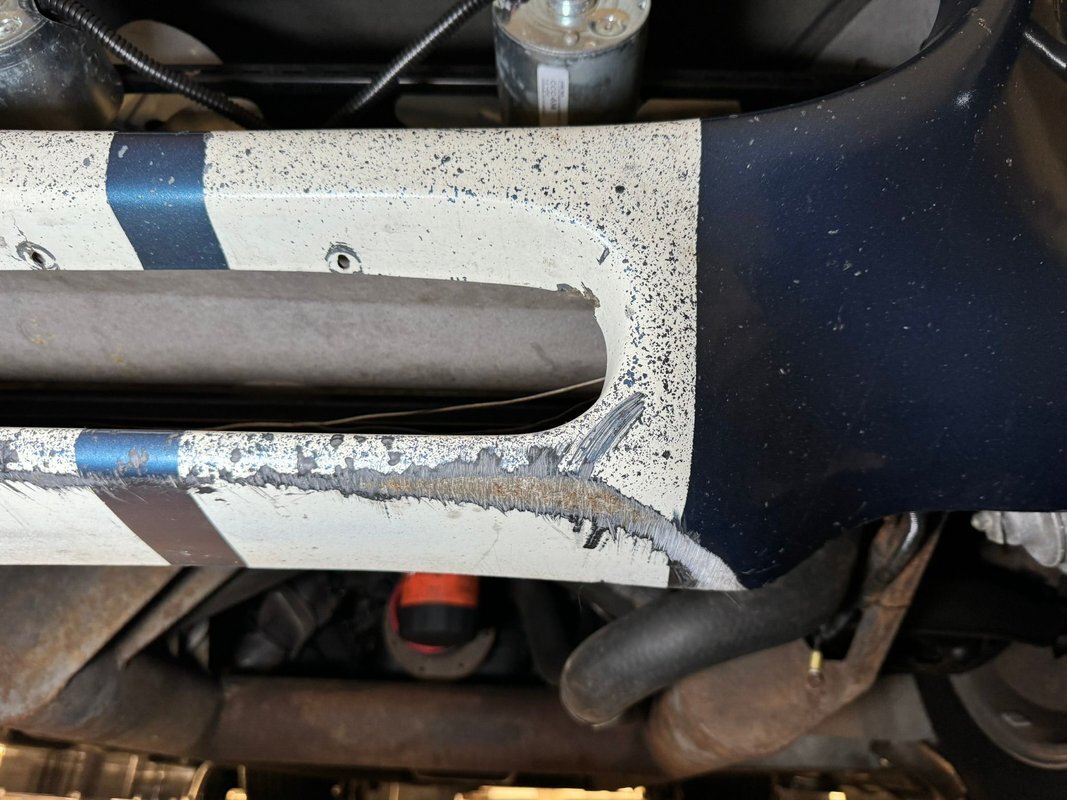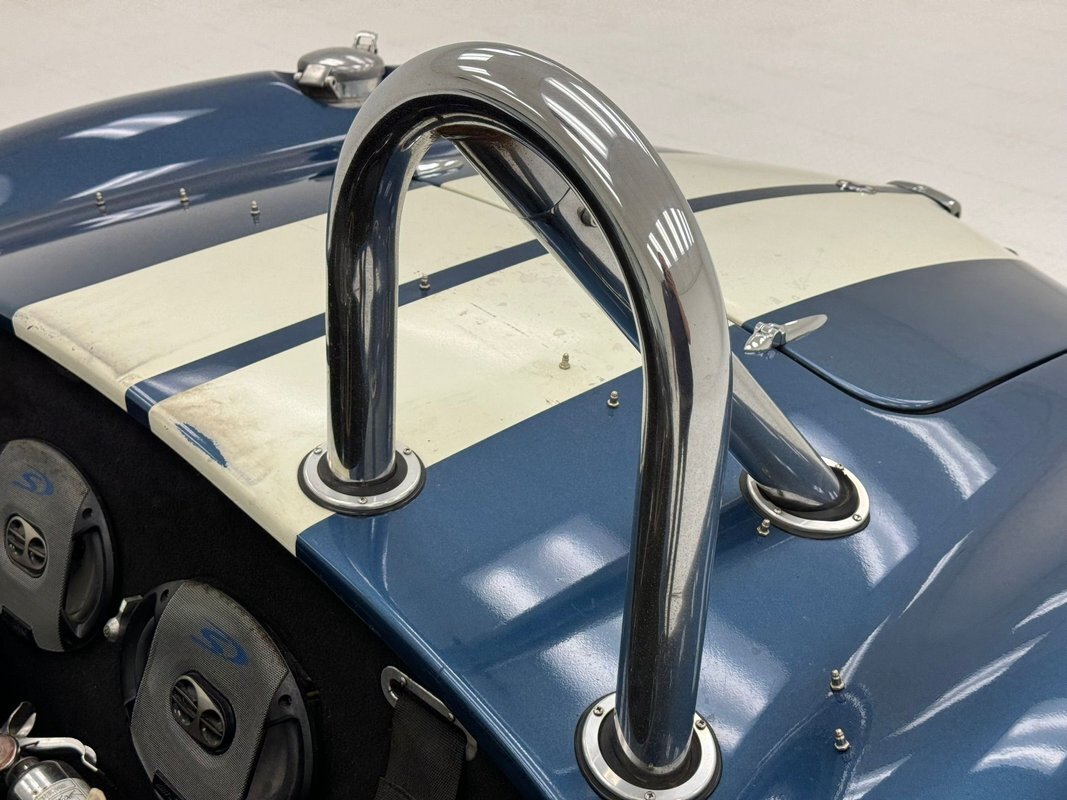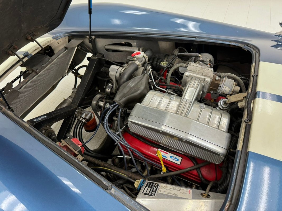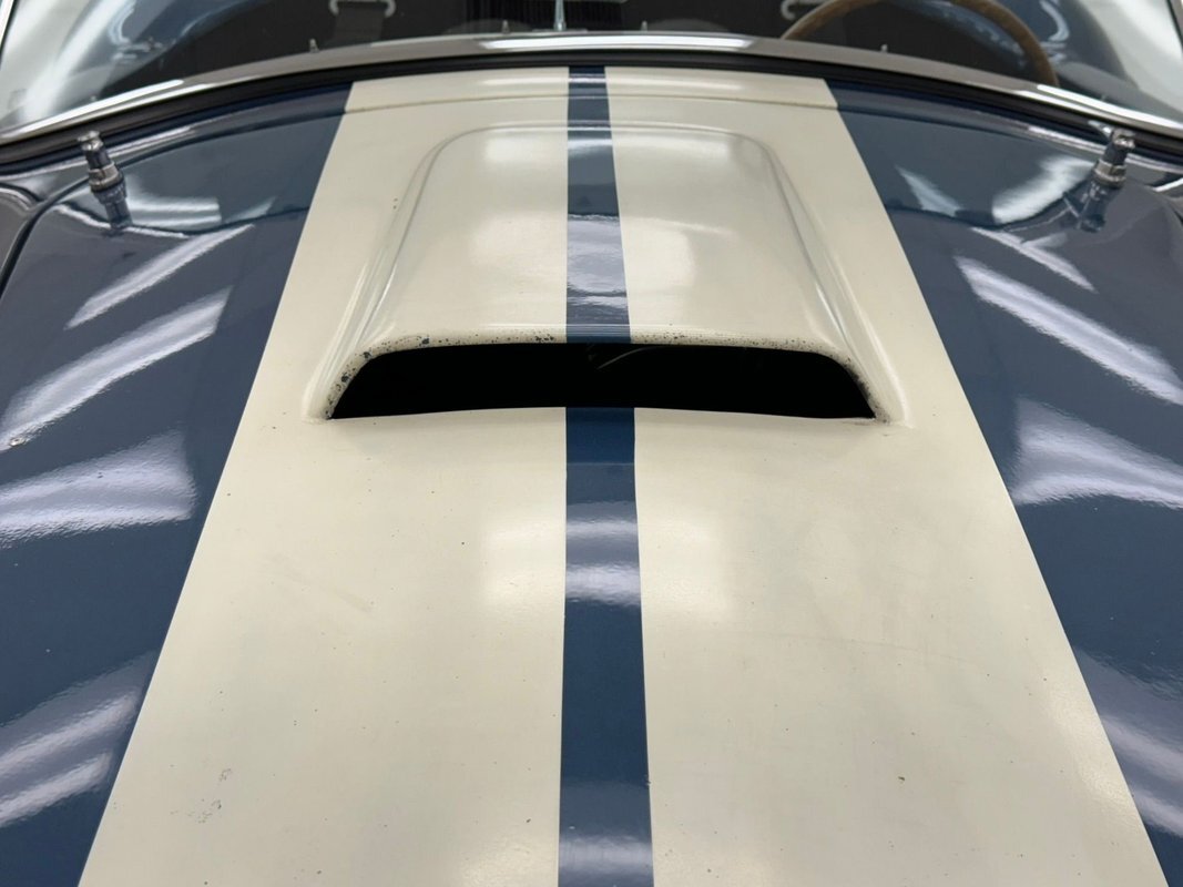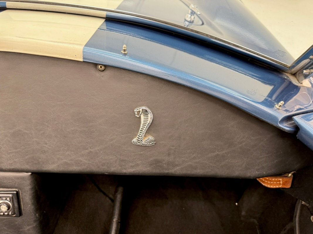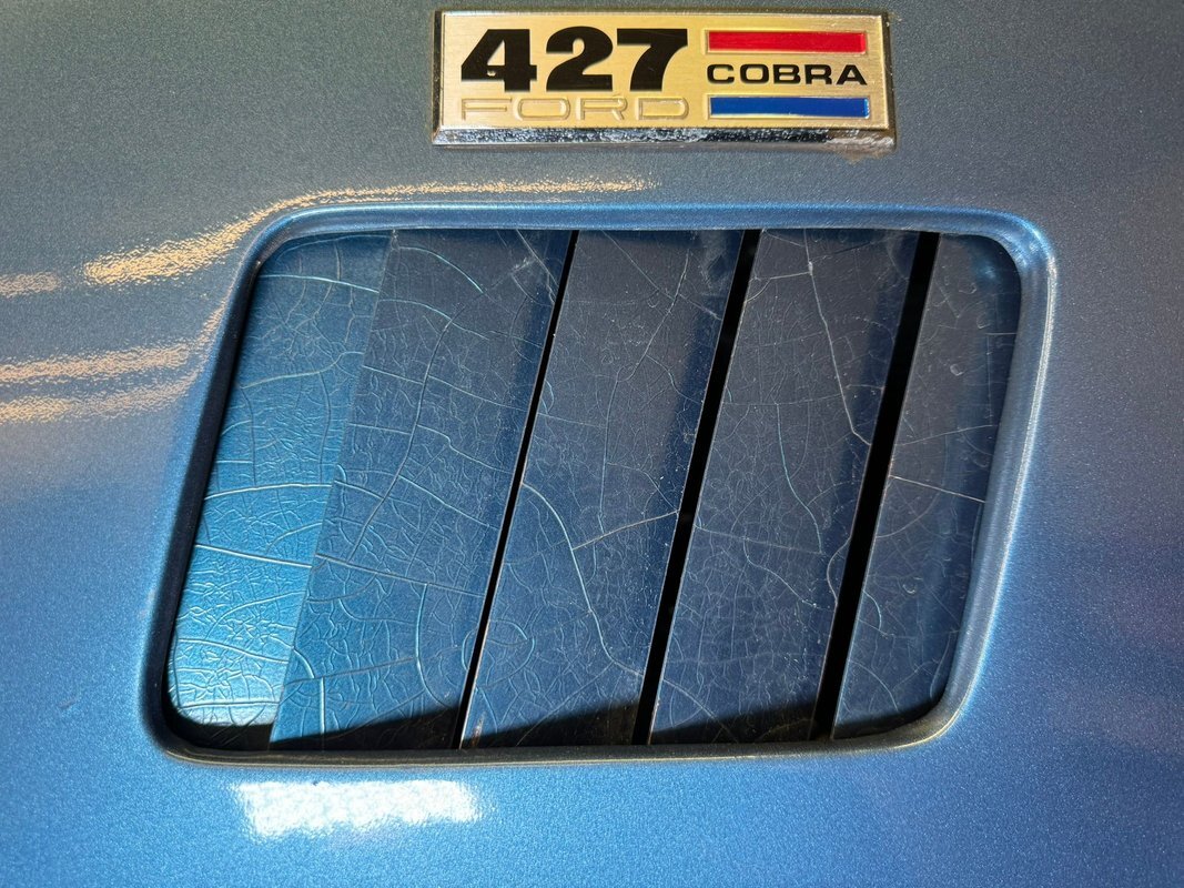 Some people don't like to stray from tradition, and Guardsman Blue with white stripes is a traditional Cobra and Shelby color combo. It's well done on this car, you don't want it overly glossy, but you want enough shine for it to show well, and this car fits the bill. A gaping, grille less opening in the front gulps air through the twin fans and is flanked by chrome bumperettes. There are noticeable rock chips on the chin, fascia and hood scoop meaning this car has been driven and enjoyed! The 427 emblem has some patina, and the gill slats also show some cracking paint. The metalwork including the roll bar, mirrors and window trim are in nice condition. The epic gas filler cap and side pipes could use some restoration if that is the route the next owner desires to go. The gold 15-inch American Racing Shelby pin drive wheels look great.