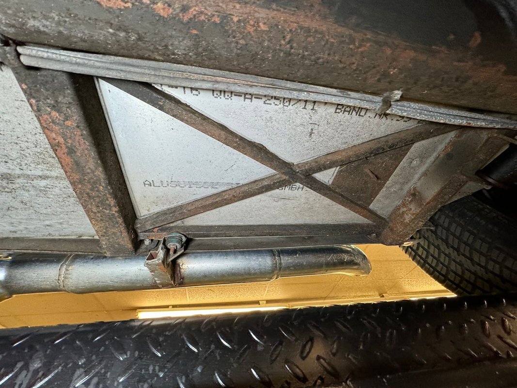 Driver quality underneath with some scrapes and surface rust on the tubular frame. Everything is intact and this car is equipped with coil springs in the front and a 4-link with coil springs in the back. We note oil coasting the oil pan and transmission as well as oil on the rear diff, and some surface rust on brake parts.