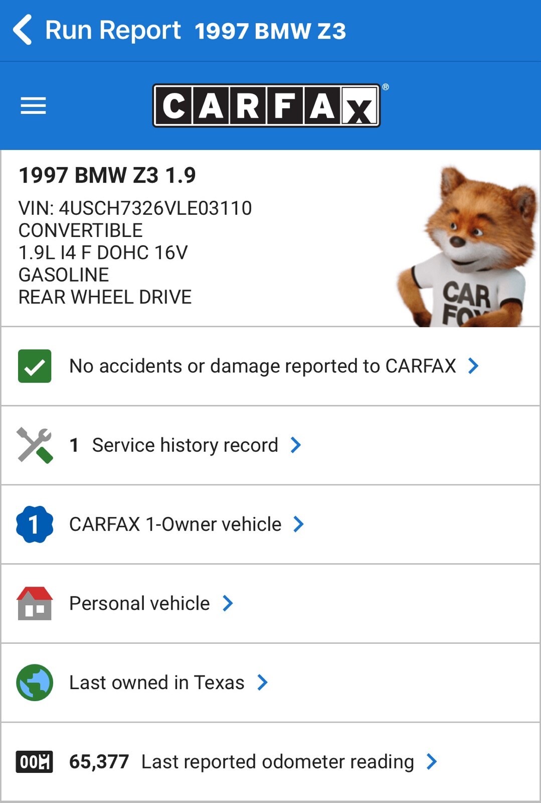 1997 BMW Z3 Roadster 1.9i 4USCH7326VLE03110 RWD 1.9L 4 Cyl Gas Manual Leather Miles now 65891Seller's Notes