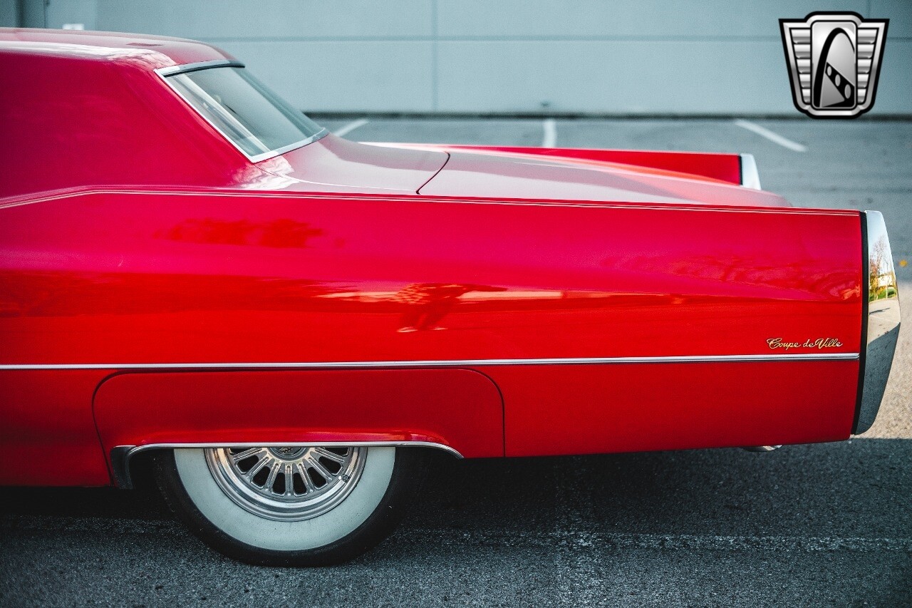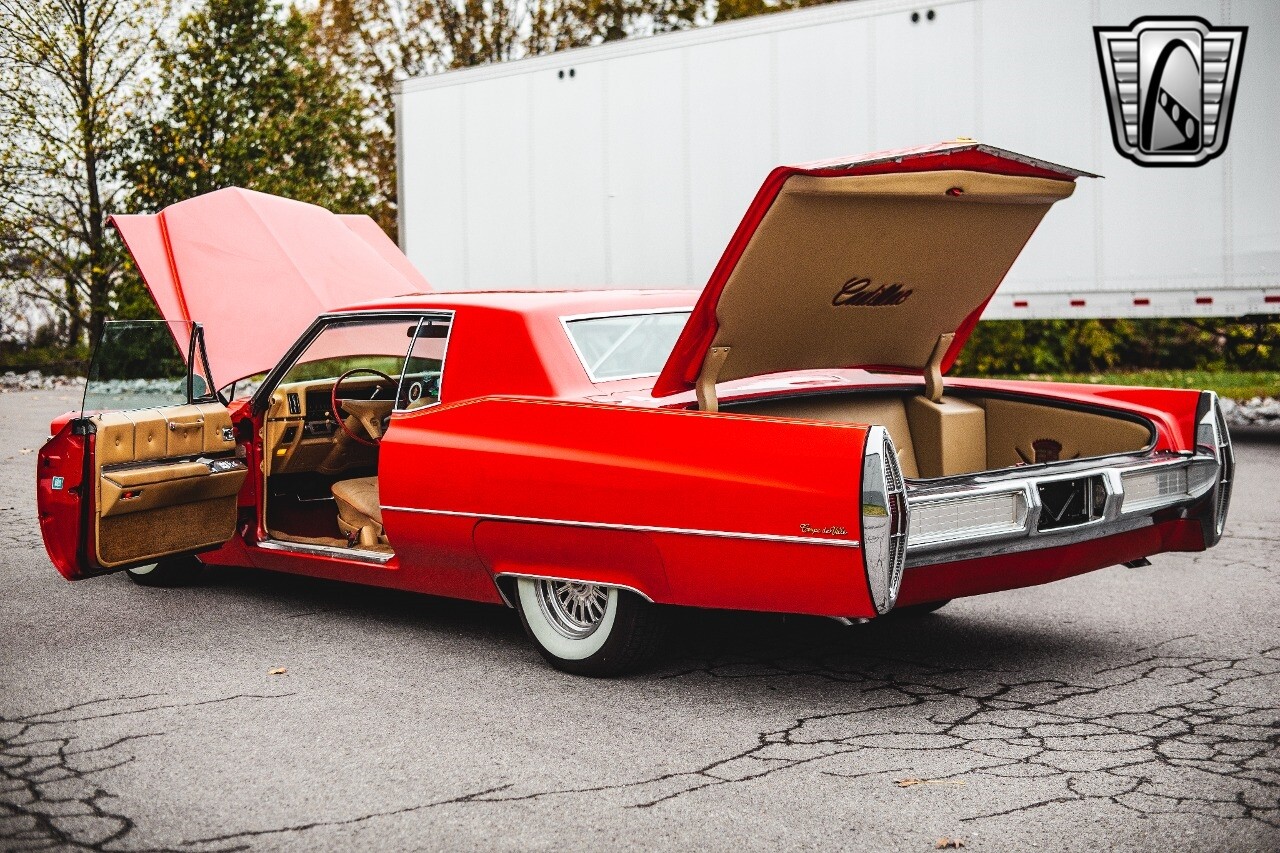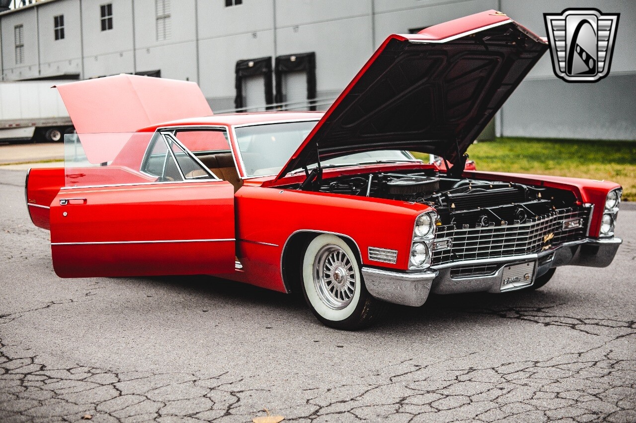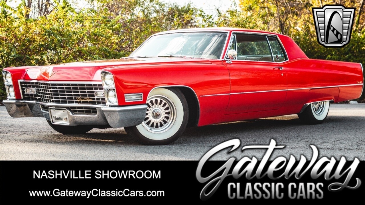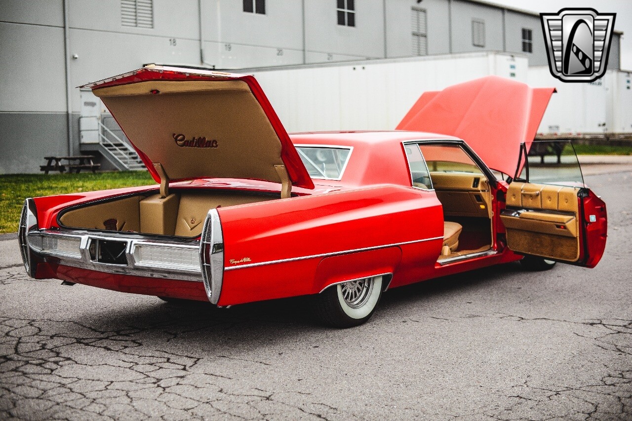 Gateway Classic Cars of Nashville is proud to be digitally presenting this red hot 1967 Cadillac Coupe Deville. This 1967 Cadillac is equipped with a 429 CI V8 engine and a Turbo 400 automatic transmission. The exterior of this car is done in 2000 Viper Red with Gold Dupont mini flake. The interior has been reupholstered in OEM vinyl from OPG I. It is Tan with red accents and piping. One of the highlights of the car is the custom design work that was done in the trunk. It includes a remote-controlled light show that is sure to be a hit at car shows. The Cadillac was ceramic coated in 2019. This Cadillac rides on a set of 3 piece polished aluminum wheels that are wrapped with American Standard 235.70.15 tires with 3 1/8th wide whitewalls. The engine and transmission have both been rebuilt. The engine looks great with Cadillac valve covers and some chrome dress up items. The ignition has been upgraded to electronic. An Edelbrock 850 cfm carburetor replaced the original Rochester and a set of Sanderson ceramic headers with Flowmaster 50 series mufflers and stainless dual exhaust produce a deep exhaust tone. Both front and rear drop spring kits have been installed. All the exterior emblems have been Gold electroplated for a little extra class. This Cadillac looks and runs great. [ omitted ].