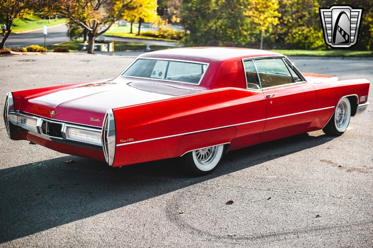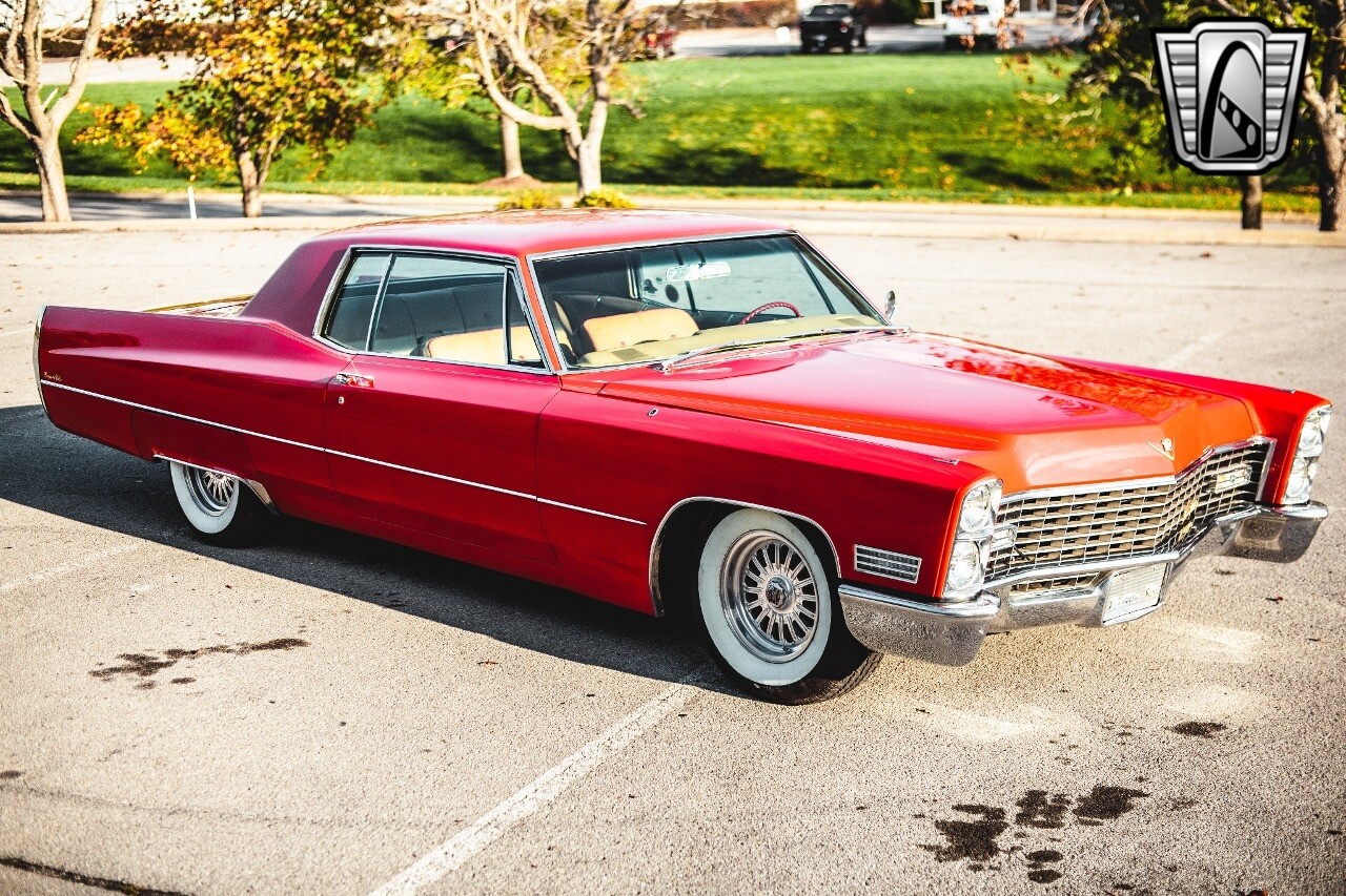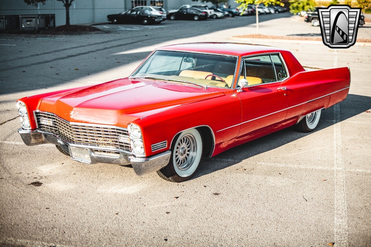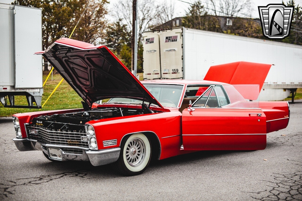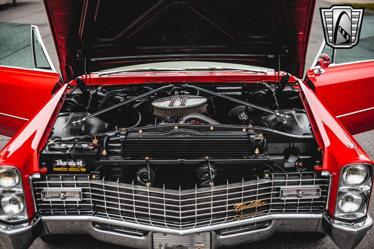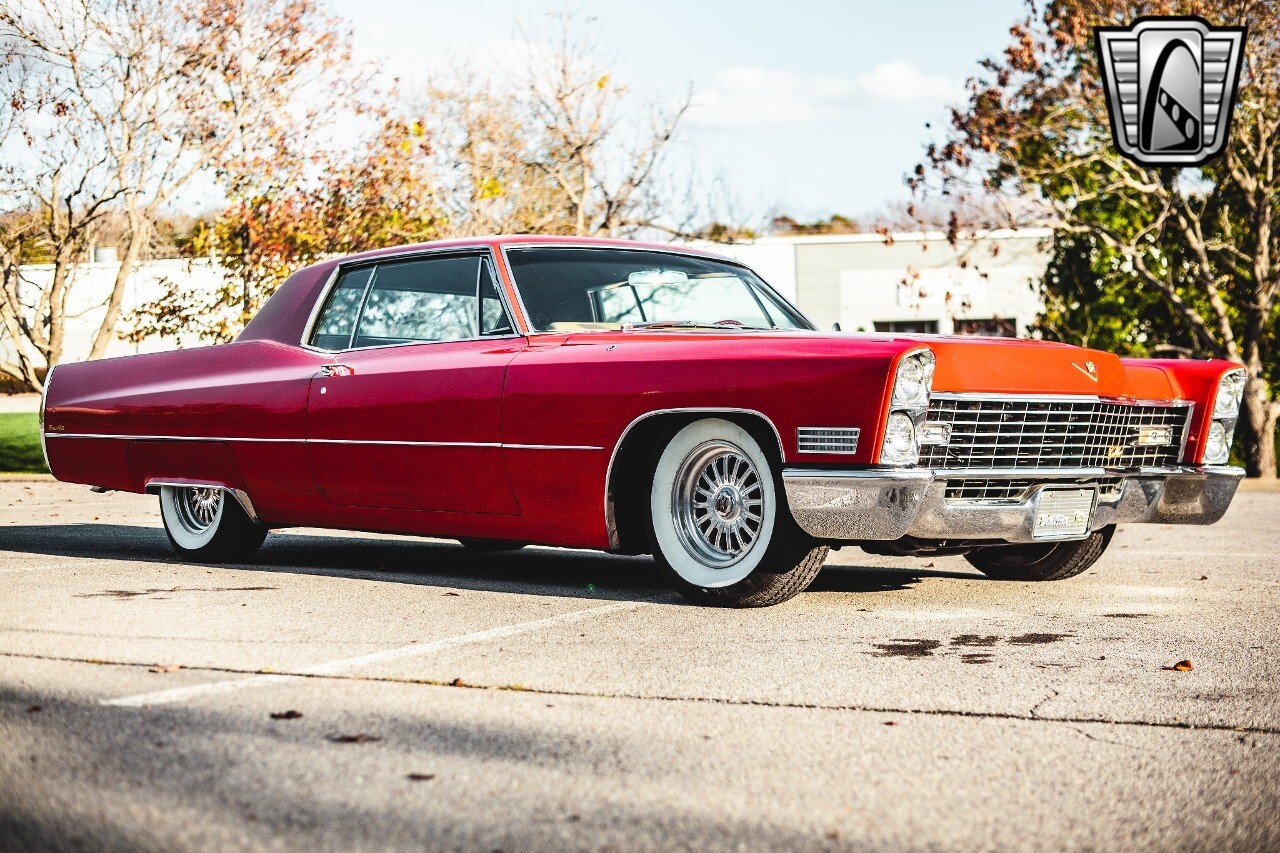 Gateway Classic Cars of Nashville is proud to be digitally presenting this red hot 1967 Cadillac Coupe Deville. This 1967 Cadillac is equipped with a 429 CI V8 engine and a Turbo 400 automatic transmission. The exterior of this car is done in 2000 Viper Red with Gold Dupont mini flake. The interior has been reupholstered in OEM vinyl from OPG I. It is Tan with red accents and piping. One of the highlights of the car is the custom design work that was done in the trunk. It includes a remote-controlled light show that is sure to be a hit at car shows. The Cadillac was ceramic coated in 2019. This Cadillac rides on a set of 3 piece polished aluminum wheels that are wrapped with American Standard 235.70.15 tires with 3 1/8th wide whitewalls. The engine and transmission have both been rebuilt. The engine looks great with Cadillac valve covers and some chrome dress up items. The ignition has been upgraded to electronic. An Edelbrock 850 cfm carburetor replaced the original Rochester and a set of Sanderson ceramic headers with Flowmaster 50 series mufflers and stainless dual exhaust produce a deep exhaust tone. Both front and rear drop spring kits have been installed. All the exterior emblems have been Gold electroplated for a little extra class. This Cadillac looks and runs great. [ omitted ].