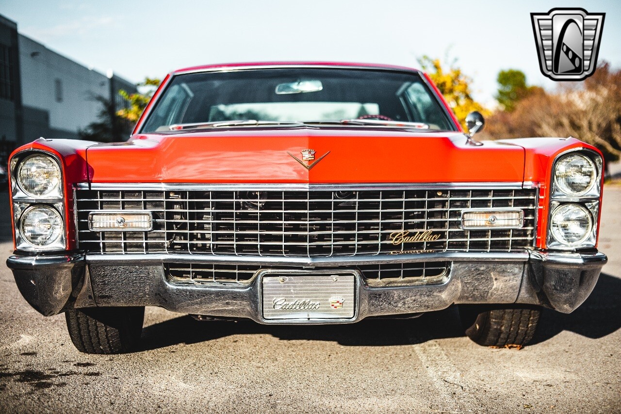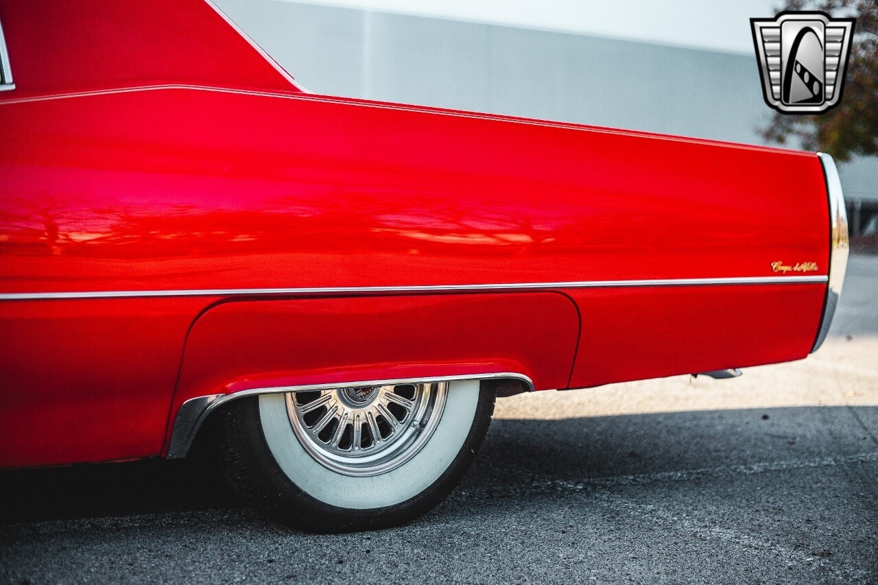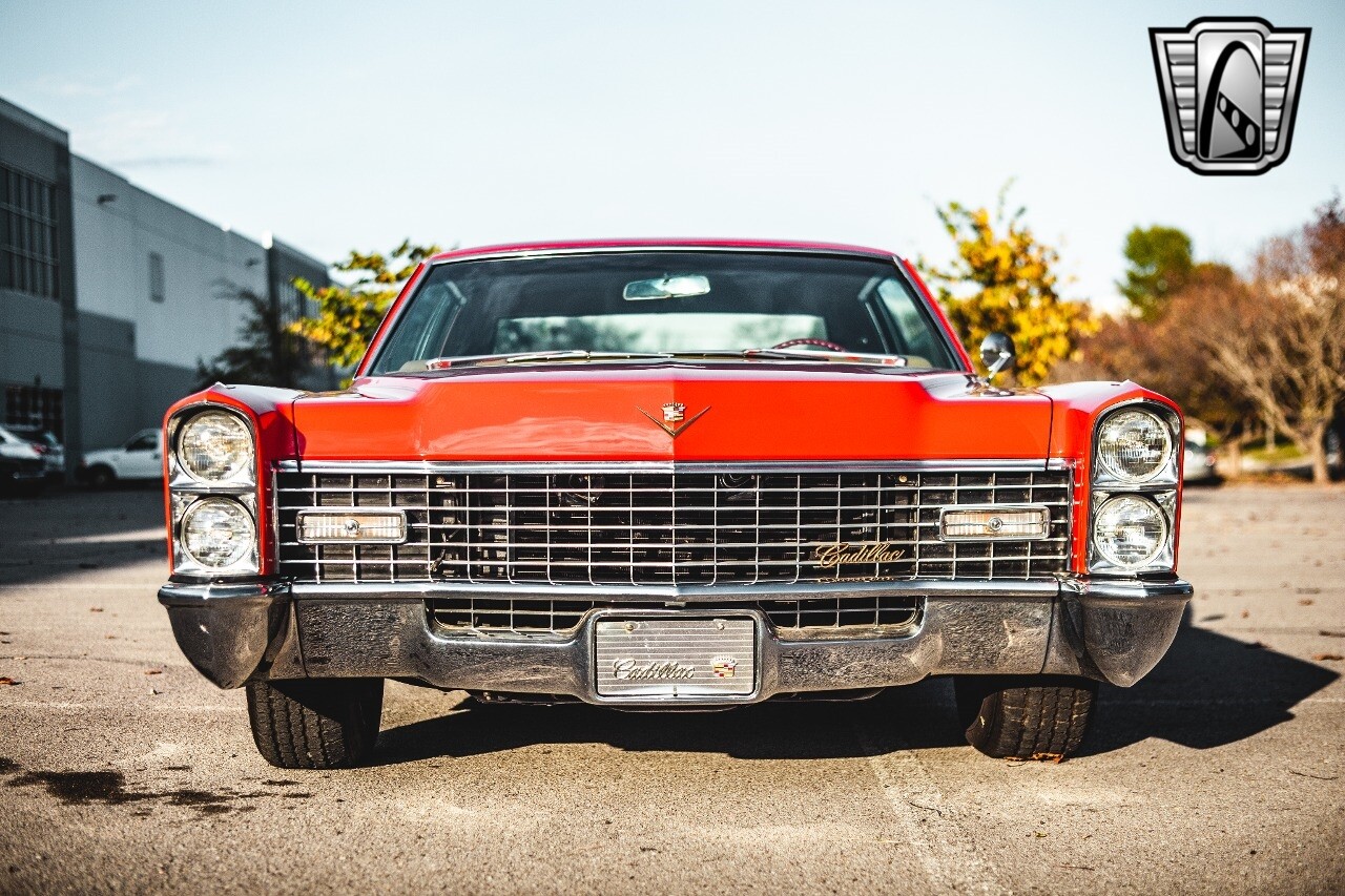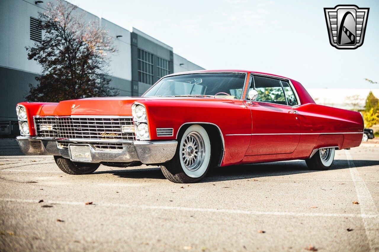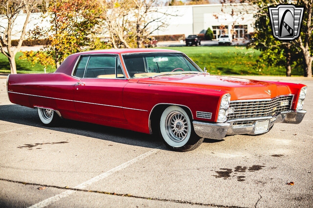 Gateway Classic Cars of Nashville is proud to be digitally presenting this red hot 1967 Cadillac Coupe Deville. This 1967 Cadillac is equipped with a 429 CI V8 engine and a Turbo 400 automatic transmission. The exterior of this car is done in 2000 Viper Red with Gold Dupont mini flake. The interior has been reupholstered in OEM vinyl from OPG I. It is Tan with red accents and piping. One of the highlights of the car is the custom design work that was done in the trunk. It includes a remote-controlled light show that is sure to be a hit at car shows. The Cadillac was ceramic coated in 2019. This Cadillac rides on a set of 3 piece polished aluminum wheels that are wrapped with American Standard 235.70.15 tires with 3 1/8th wide whitewalls. The engine and transmission have both been rebuilt. The engine looks great with Cadillac valve covers and some chrome dress up items. The ignition has been upgraded to electronic. An Edelbrock 850 cfm carburetor replaced the original Rochester and a set of Sanderson ceramic headers with Flowmaster 50 series mufflers and stainless dual exhaust produce a deep exhaust tone. Both front and rear drop spring kits have been installed. All the exterior emblems have been Gold electroplated for a little extra class. This Cadillac looks and runs great. [ omitted ].