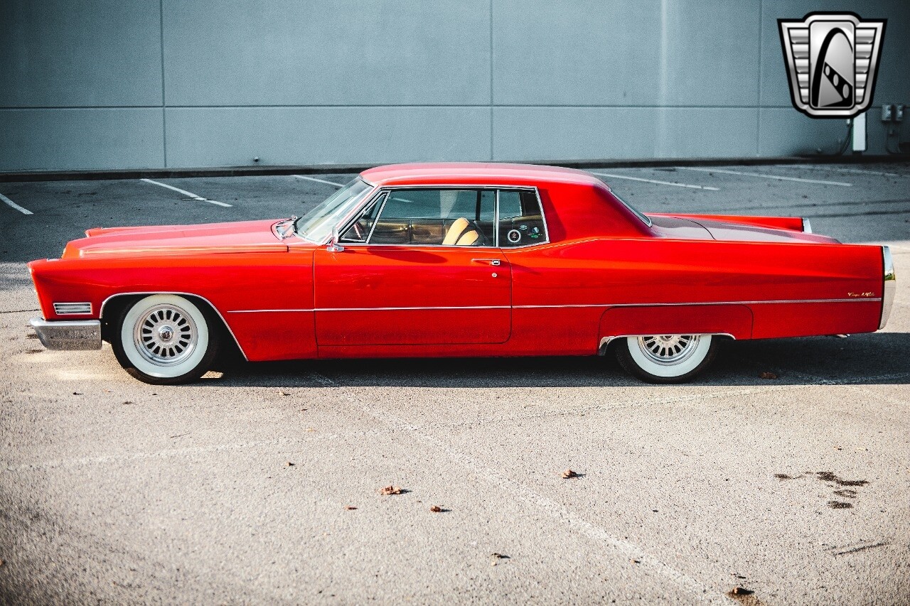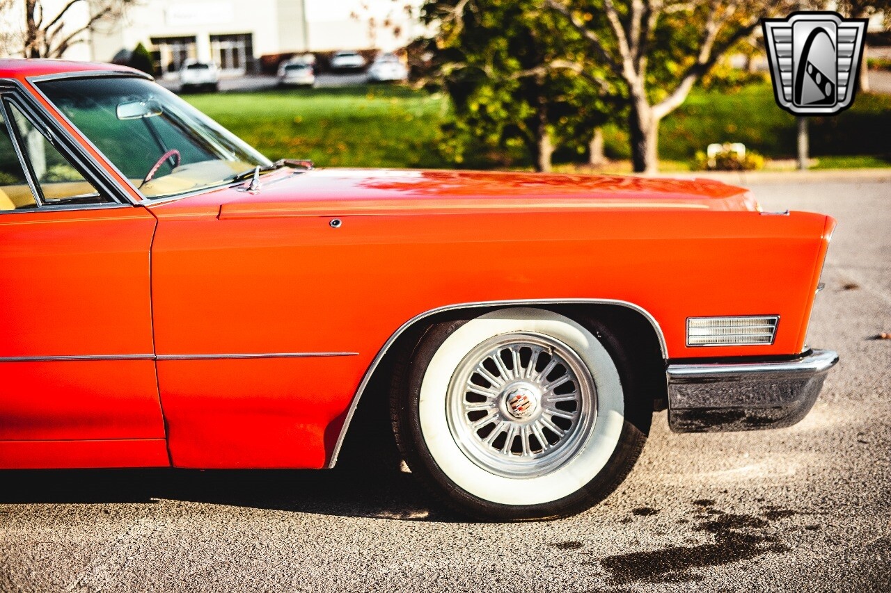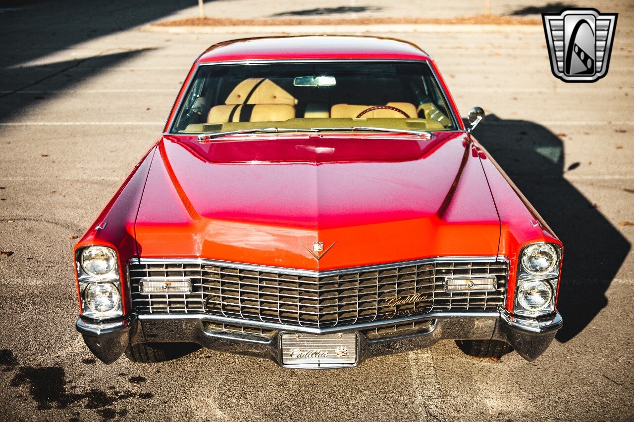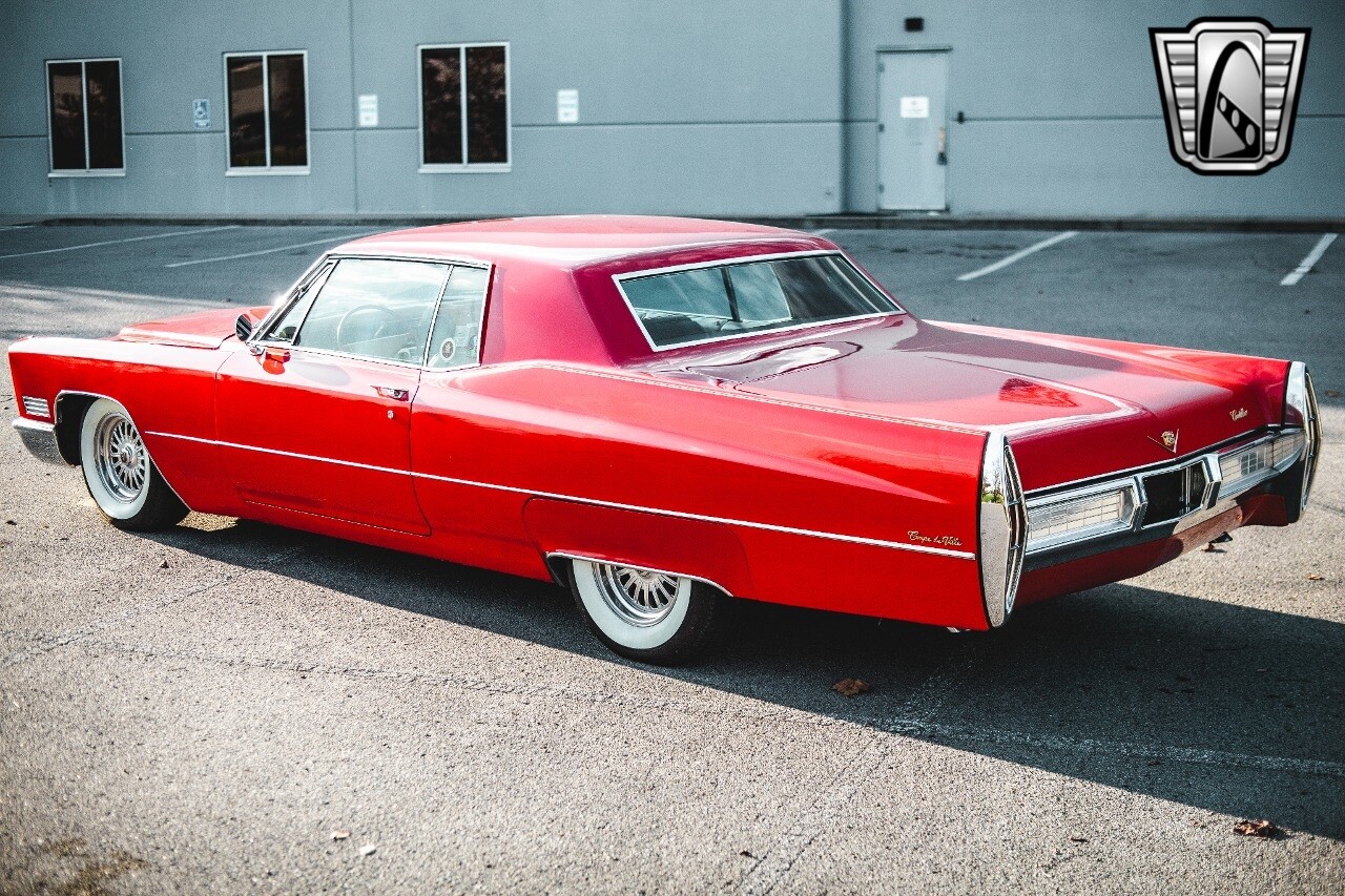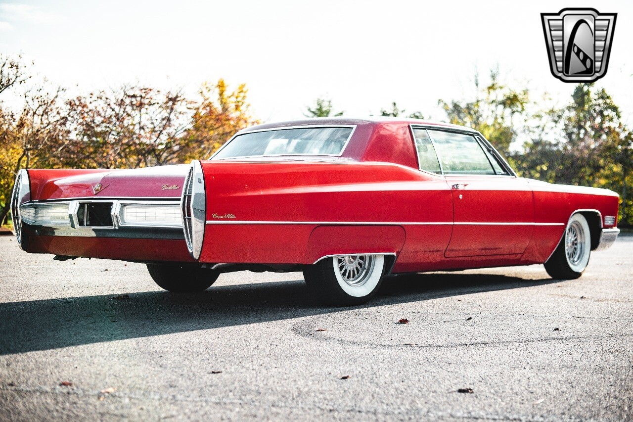 Gateway Classic Cars of Nashville is proud to be digitally presenting this red hot 1967 Cadillac Coupe Deville. This 1967 Cadillac is equipped with a 429 CI V8 engine and a Turbo 400 automatic transmission. The exterior of this car is done in 2000 Viper Red with Gold Dupont mini flake. The interior has been reupholstered in OEM vinyl from OPG I. It is Tan with red accents and piping. One of the highlights of the car is the custom design work that was done in the trunk. It includes a remote-controlled light show that is sure to be a hit at car shows. The Cadillac was ceramic coated in 2019. This Cadillac rides on a set of 3 piece polished aluminum wheels that are wrapped with American Standard 235.70.15 tires with 3 1/8th wide whitewalls. The engine and transmission have both been rebuilt. The engine looks great with Cadillac valve covers and some chrome dress up items. The ignition has been upgraded to electronic. An Edelbrock 850 cfm carburetor replaced the original Rochester and a set of Sanderson ceramic headers with Flowmaster 50 series mufflers and stainless dual exhaust produce a deep exhaust tone. Both front and rear drop spring kits have been installed. All the exterior emblems have been Gold electroplated for a little extra class. This Cadillac looks and runs great. [ omitted ].