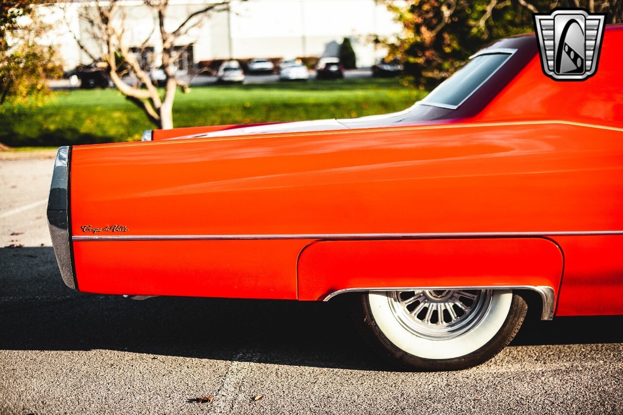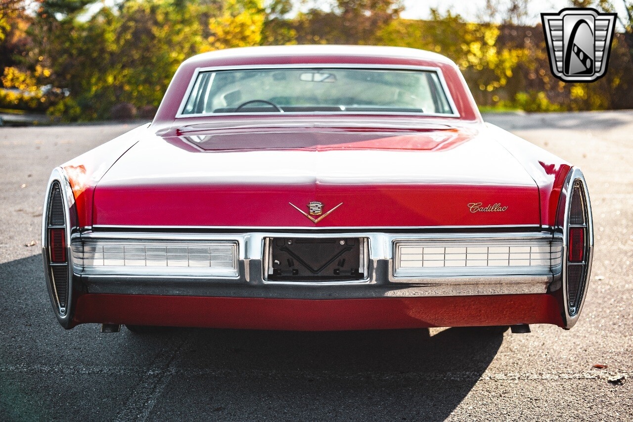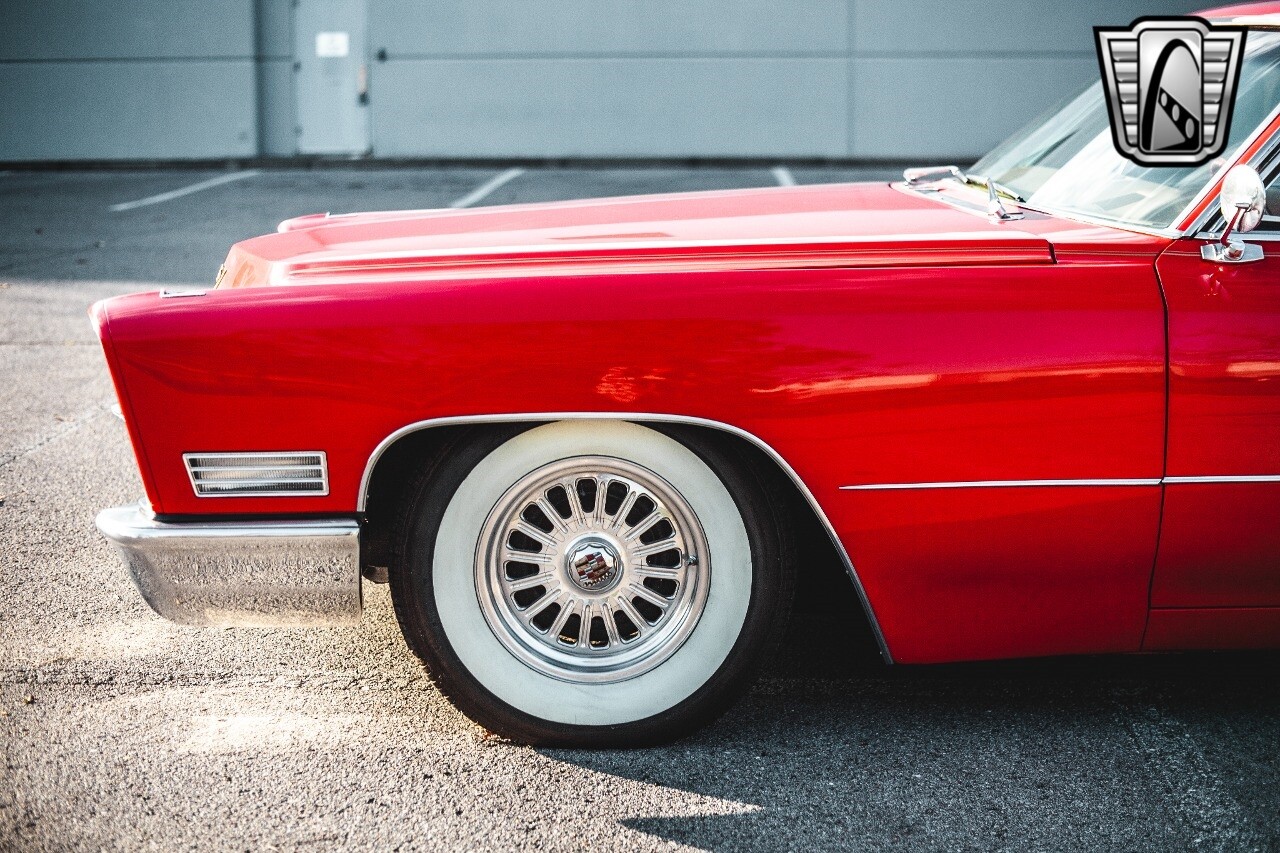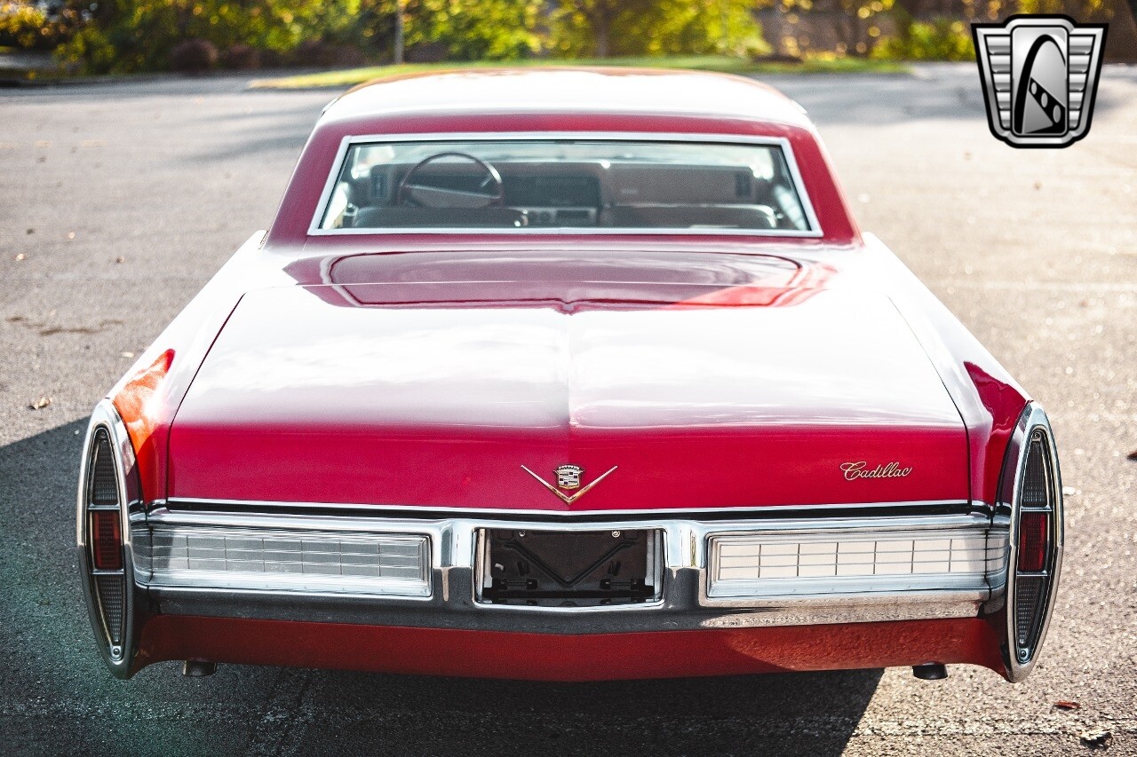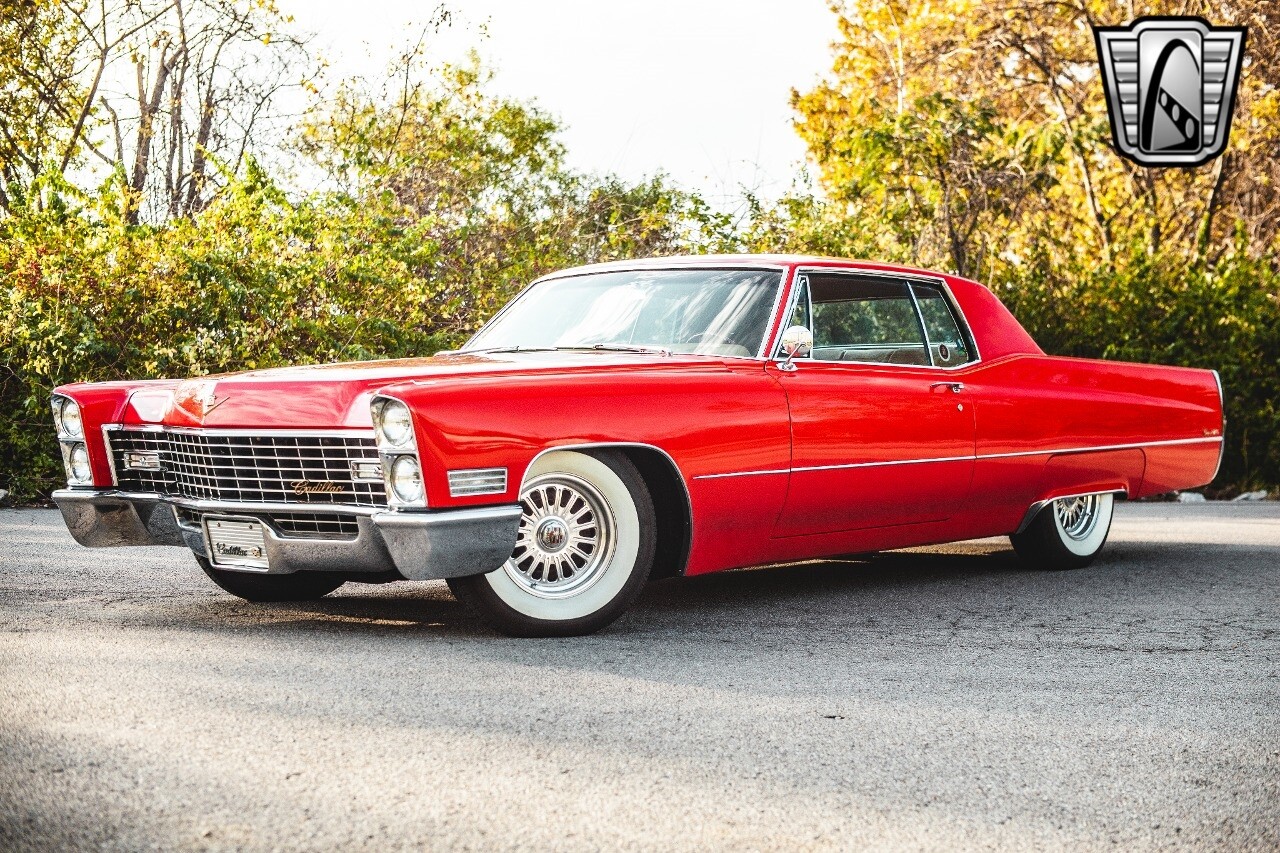 Gateway Classic Cars of Nashville is proud to be digitally presenting this red hot 1967 Cadillac Coupe Deville. This 1967 Cadillac is equipped with a 429 CI V8 engine and a Turbo 400 automatic transmission. The exterior of this car is done in 2000 Viper Red with Gold Dupont mini flake. The interior has been reupholstered in OEM vinyl from OPG I. It is Tan with red accents and piping. One of the highlights of the car is the custom design work that was done in the trunk. It includes a remote-controlled light show that is sure to be a hit at car shows. The Cadillac was ceramic coated in 2019. This Cadillac rides on a set of 3 piece polished aluminum wheels that are wrapped with American Standard 235.70.15 tires with 3 1/8th wide whitewalls. The engine and transmission have both been rebuilt. The engine looks great with Cadillac valve covers and some chrome dress up items. The ignition has been upgraded to electronic. An Edelbrock 850 cfm carburetor replaced the original Rochester and a set of Sanderson ceramic headers with Flowmaster 50 series mufflers and stainless dual exhaust produce a deep exhaust tone. Both front and rear drop spring kits have been installed. All the exterior emblems have been Gold electroplated for a little extra class. This Cadillac looks and runs great. [ omitted ].
