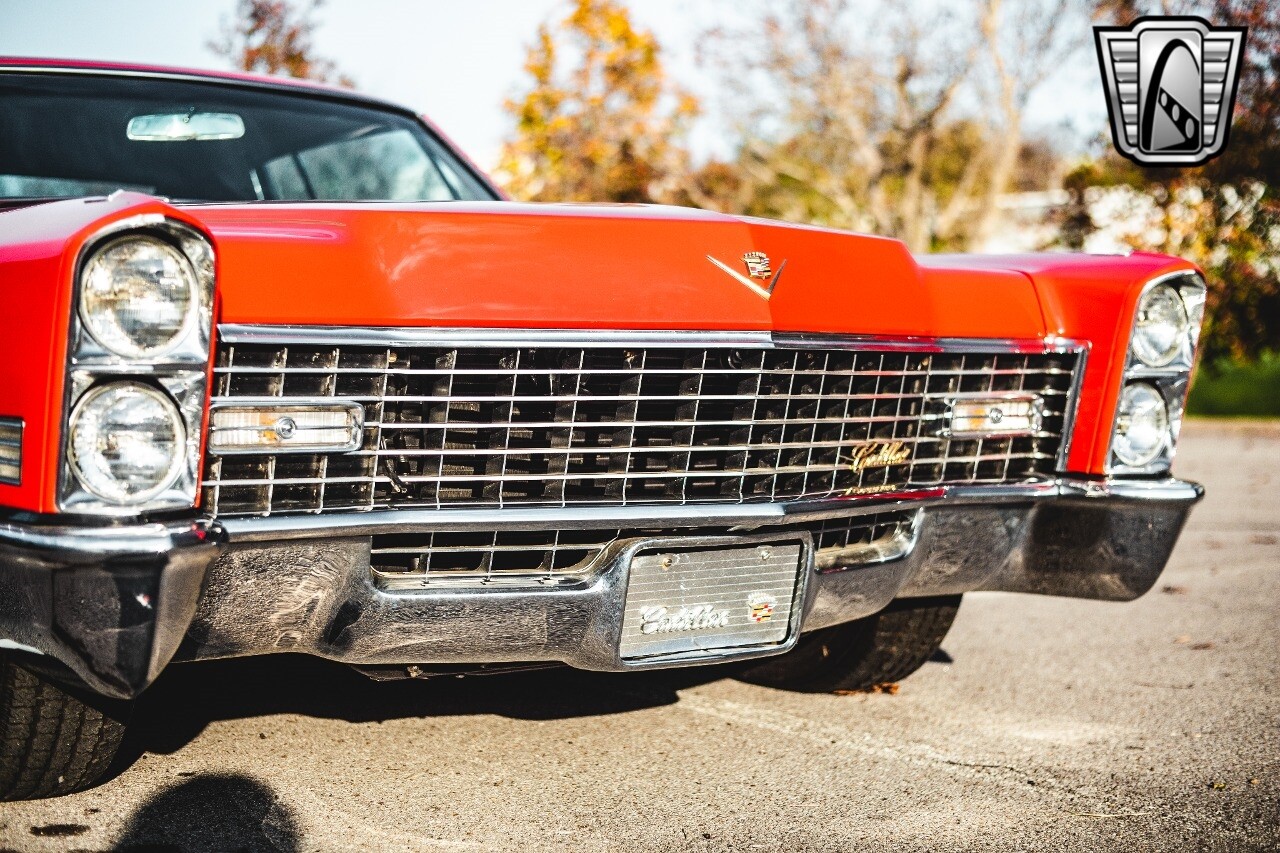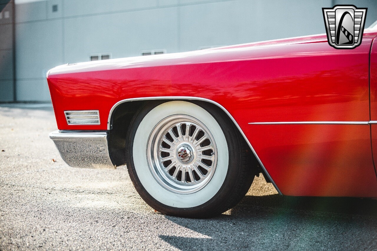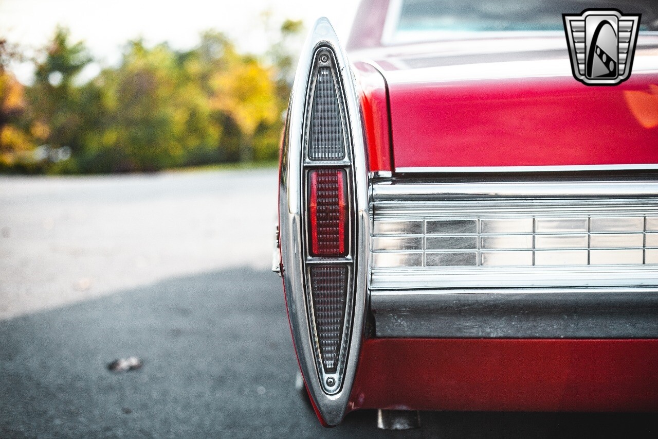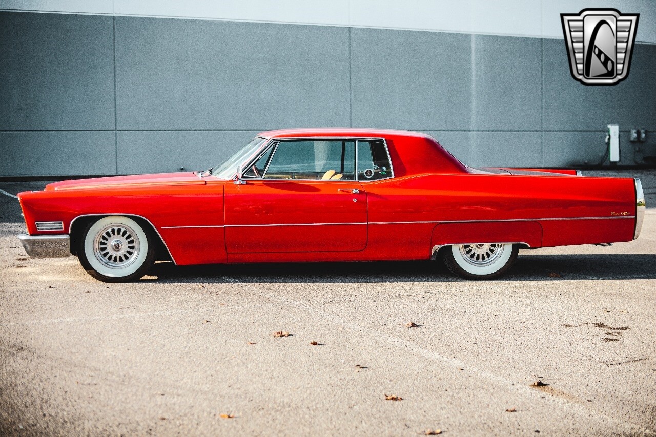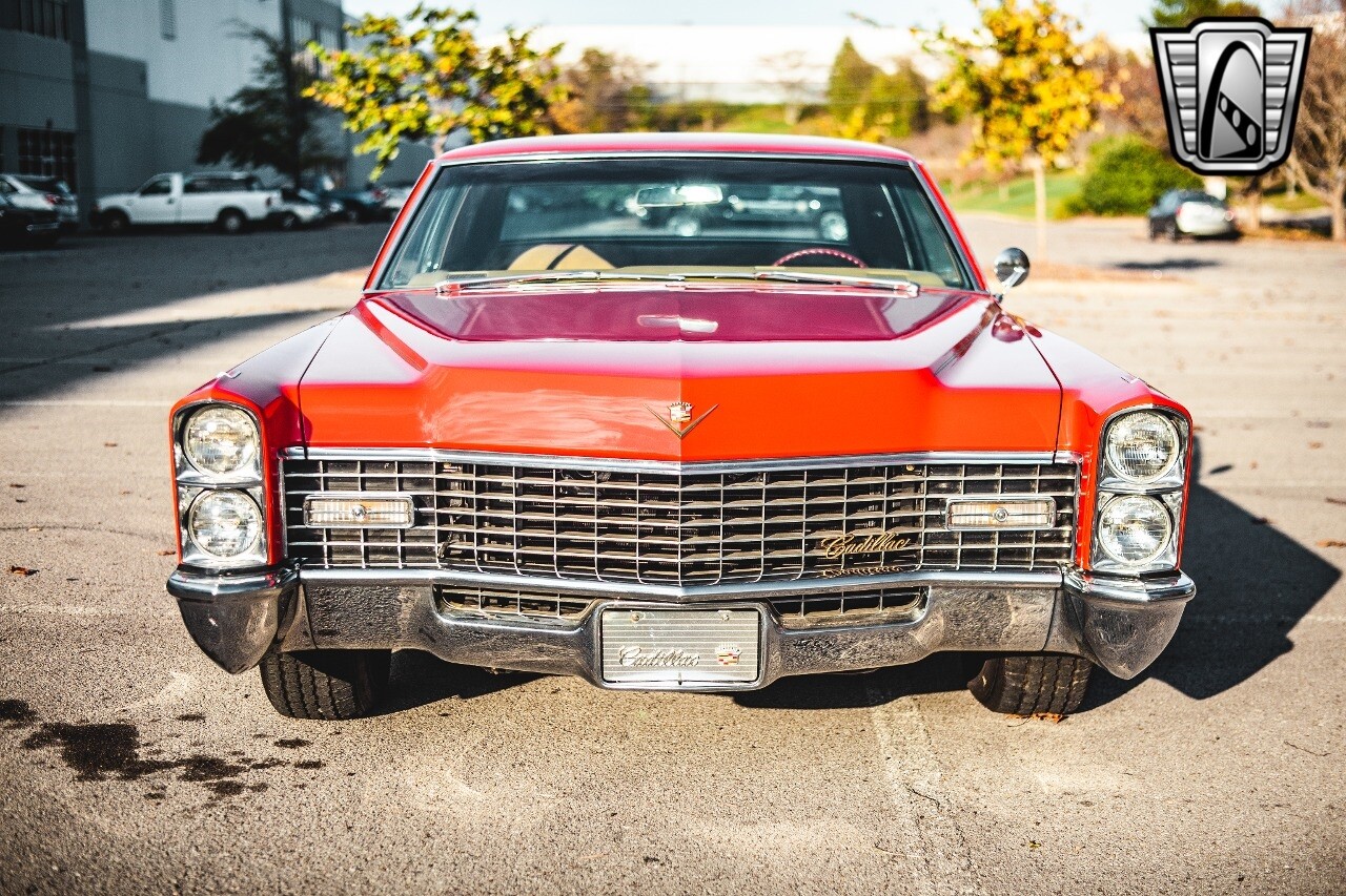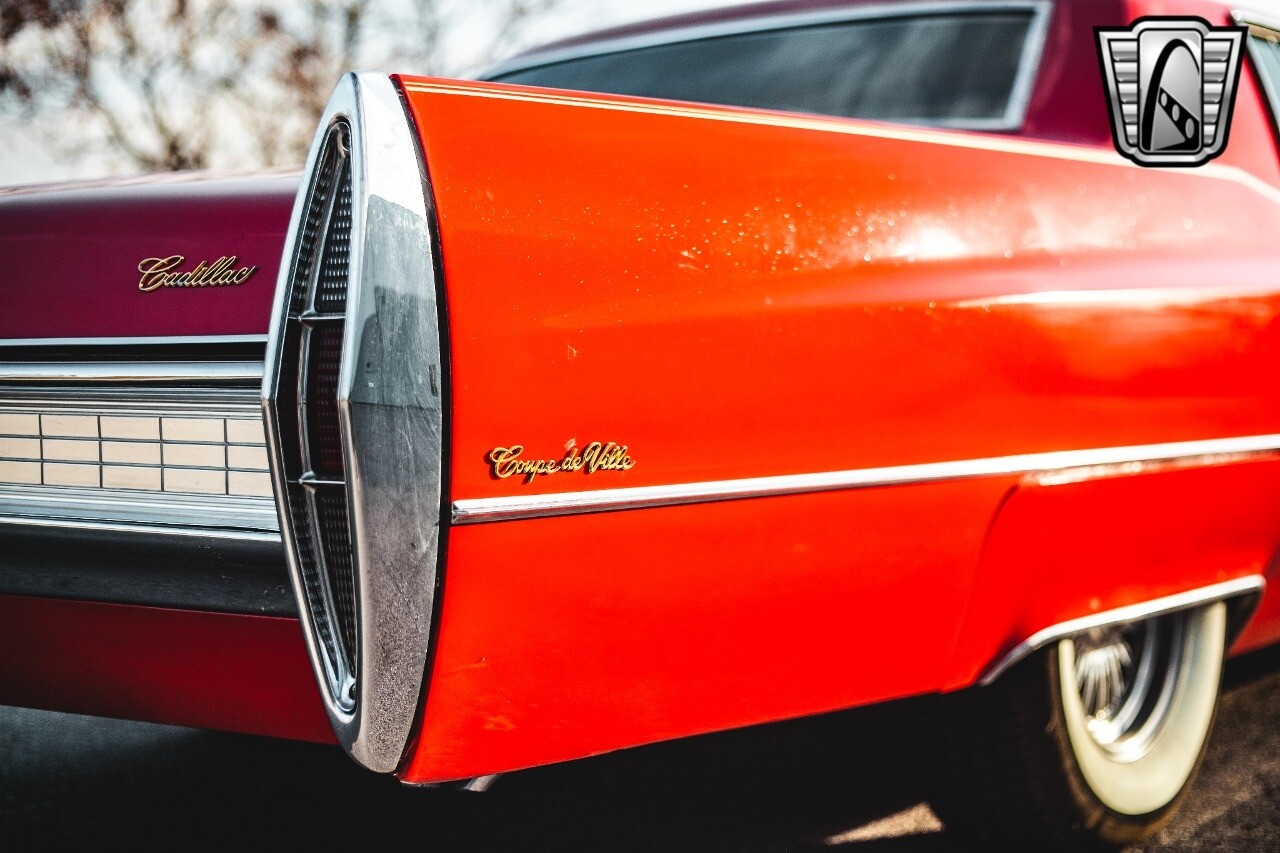 Gateway Classic Cars of Nashville is proud to be digitally presenting this red hot 1967 Cadillac Coupe Deville. This 1967 Cadillac is equipped with a 429 CI V8 engine and a Turbo 400 automatic transmission. The exterior of this car is done in 2000 Viper Red with Gold Dupont mini flake. The interior has been reupholstered in OEM vinyl from OPG I. It is Tan with red accents and piping. One of the highlights of the car is the custom design work that was done in the trunk. It includes a remote-controlled light show that is sure to be a hit at car shows. The Cadillac was ceramic coated in 2019. This Cadillac rides on a set of 3 piece polished aluminum wheels that are wrapped with American Standard 235.70.15 tires with 3 1/8th wide whitewalls. The engine and transmission have both been rebuilt. The engine looks great with Cadillac valve covers and some chrome dress up items. The ignition has been upgraded to electronic. An Edelbrock 850 cfm carburetor replaced the original Rochester and a set of Sanderson ceramic headers with Flowmaster 50 series mufflers and stainless dual exhaust produce a deep exhaust tone. Both front and rear drop spring kits have been installed. All the exterior emblems have been Gold electroplated for a little extra class. This Cadillac looks and runs great. [ omitted ].