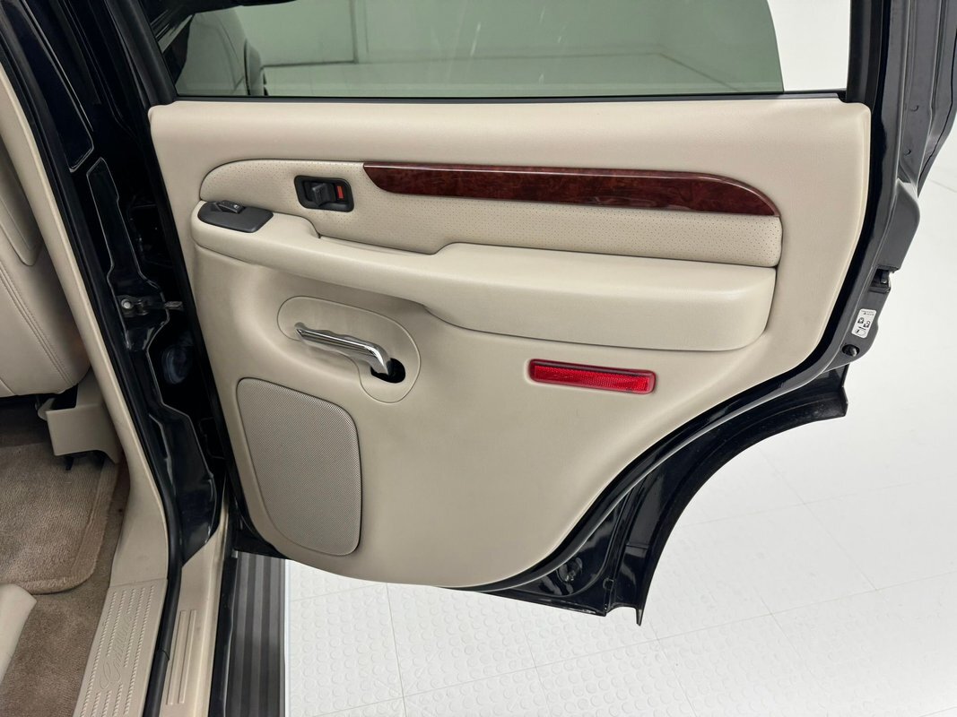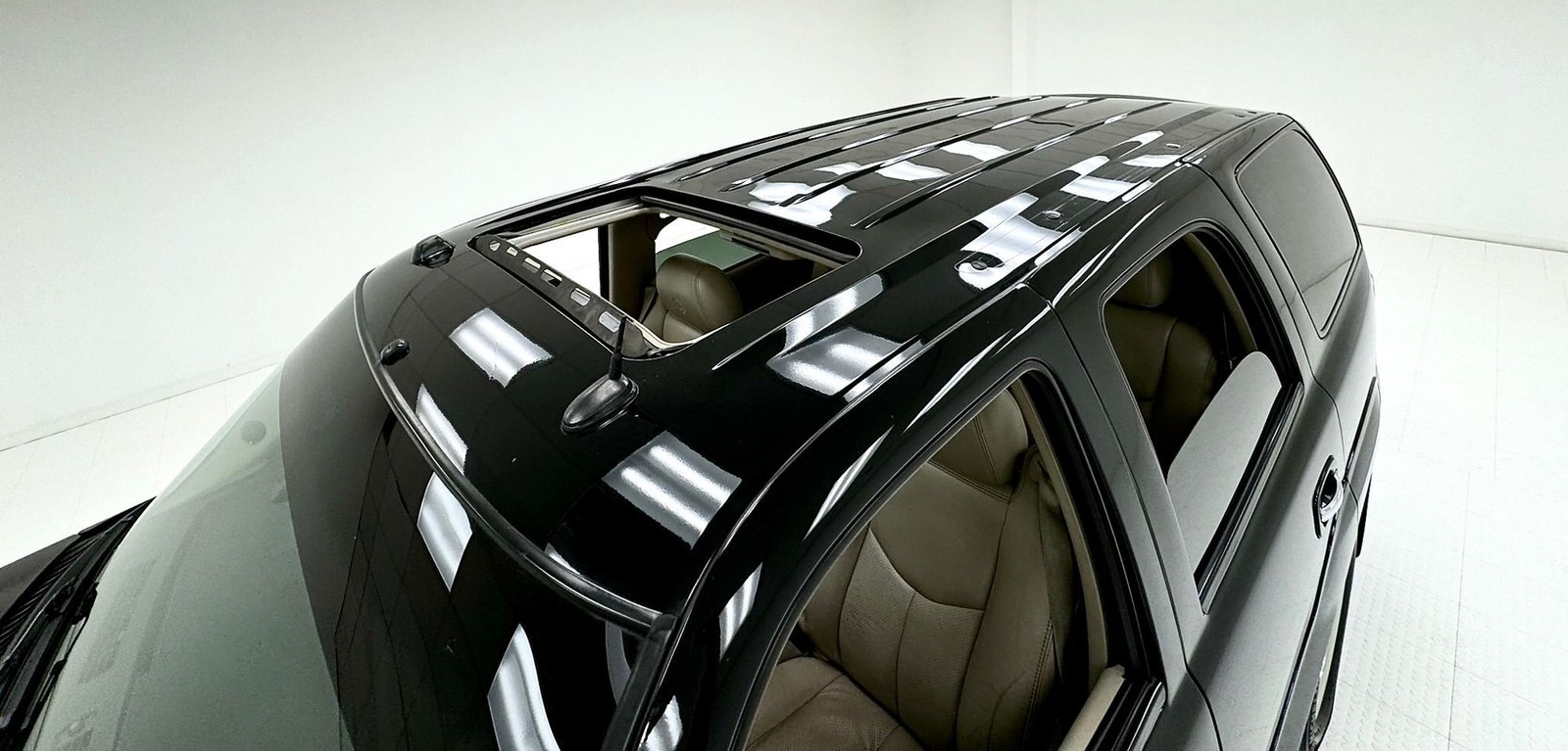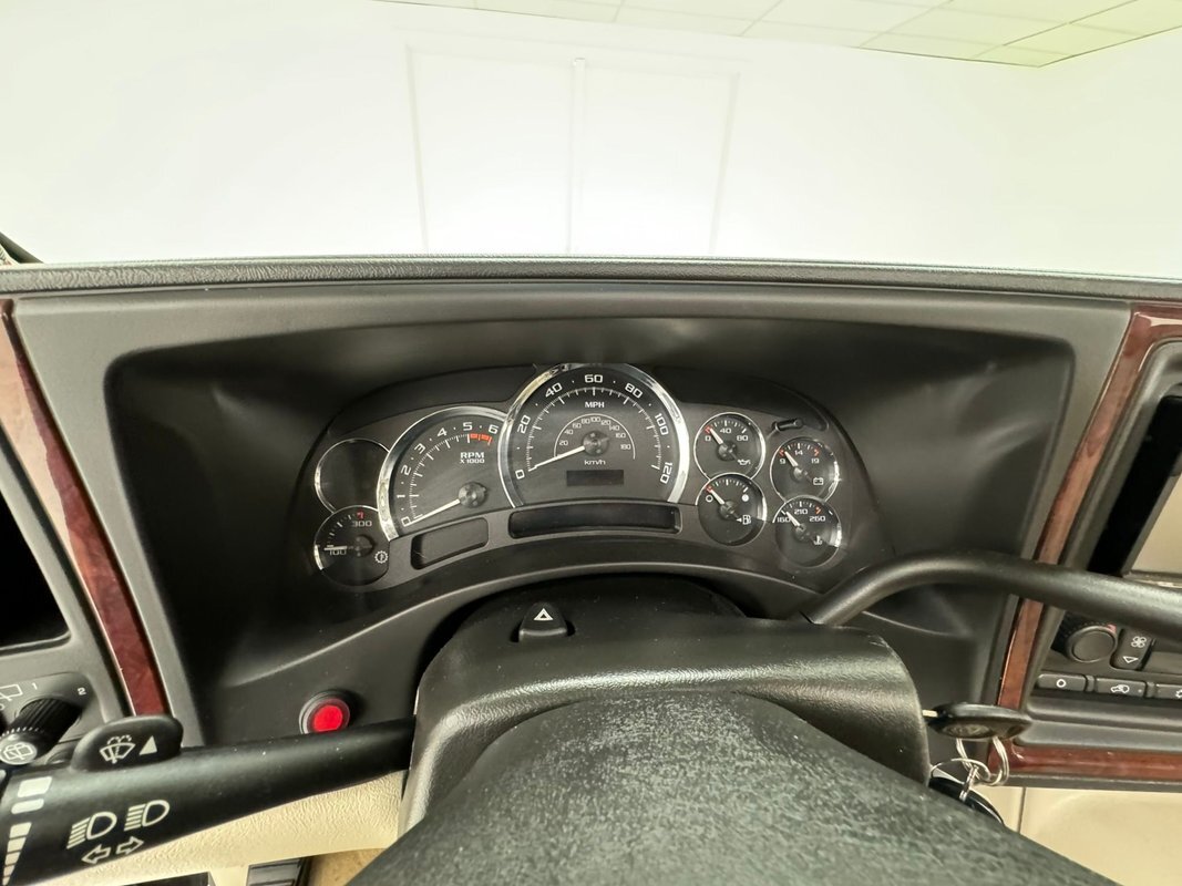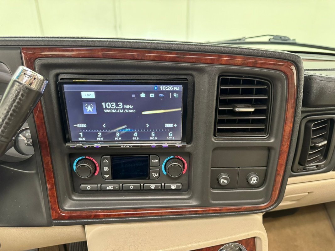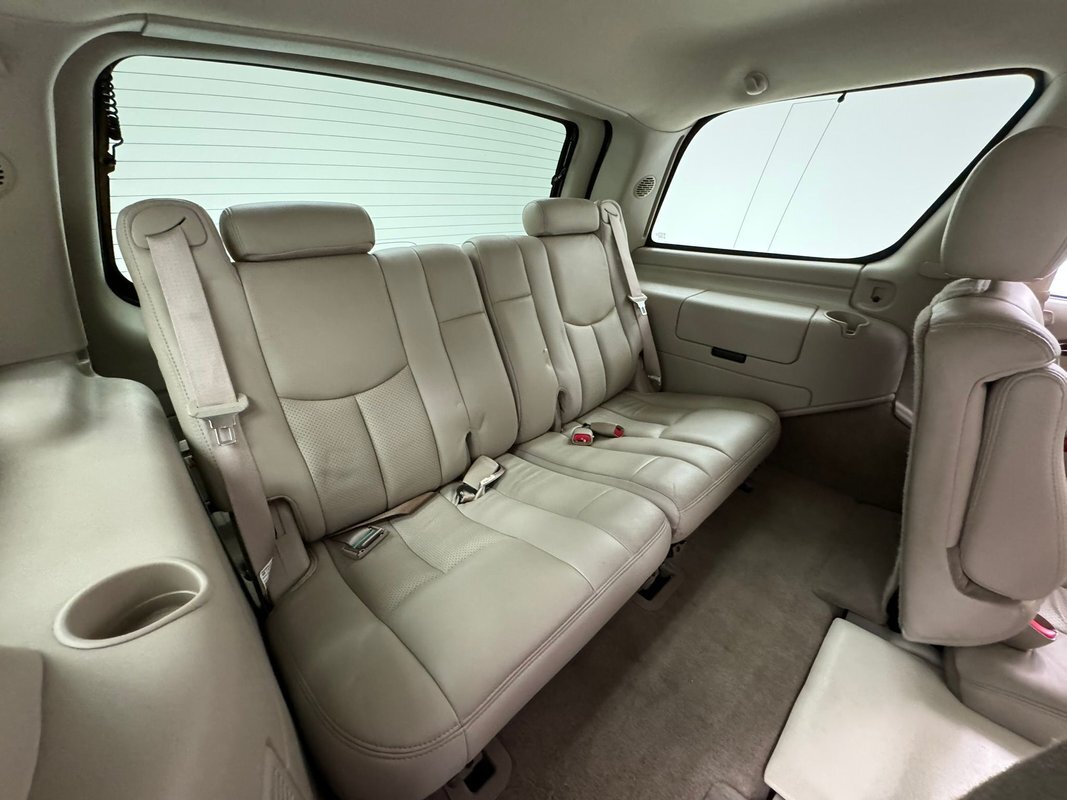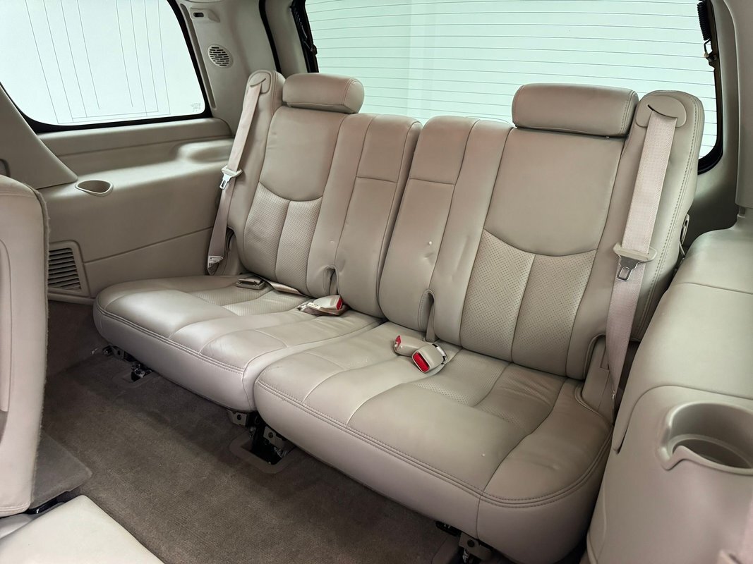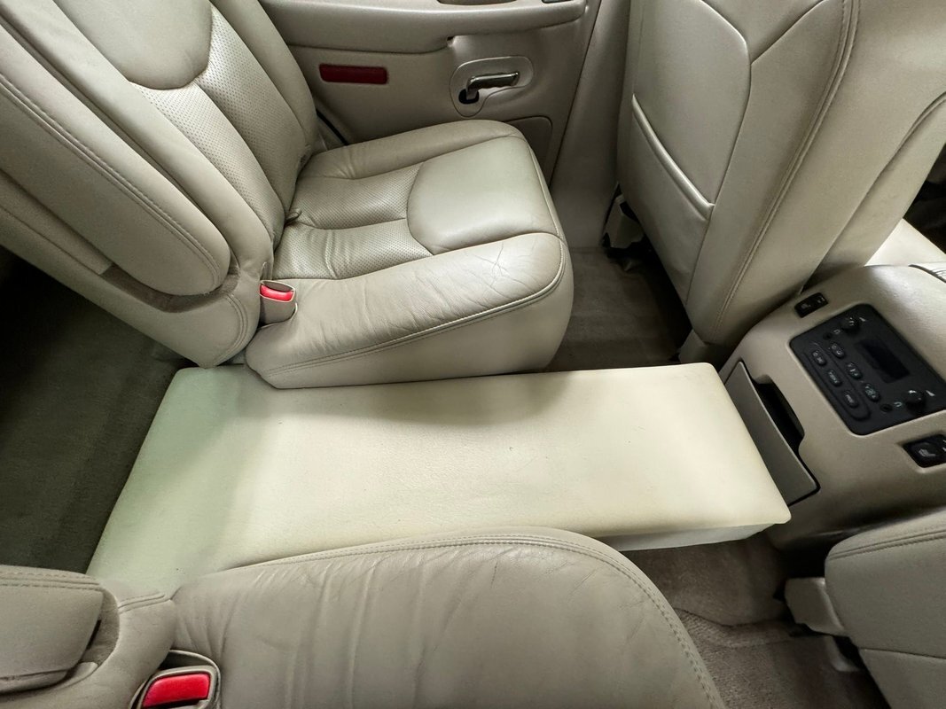 Beautifully appointed in Shale leather, it's immediately apparent that this is no Yukon. Everything is stepped up just a bit beginning with door panels where perforated leather mixes with faux wood, plastic, and tan carpet creating a warm welcome point. Inside, the front bucket seats, also in Shale leather, are extra stuffed, inviting and tall. The driver's side shows a bit of wear but not unexpected for a vehicle with 100,006 miles. The second row consists of bucket seats flanking the extended custom console and houses the amp. Pumping out the tunes for all 3 rows is a Sony head unit that has a back-up camera, DVD screens, Bluetooth capability and navigation. The factory speakers have been replaced as well and a 4 channel amp feeds to the factory sub behind the rear seat. The removable third row is a split bench with seating for three but probably spent more time folded down as indentations from seat belt buckles are evident. The four spoke steering wheel is capped with plastic woodgrain and wrapped in black leather. The gauge cluster is large and vibrant, and the odometer and info readout is displayed in familiar GM digital blue. Faux wood applique augments the dash and spills down to cover the center console where we find a clock, cupholders, a lighter and some storage. The leather armrest doubles as a bin lid. Second row passengers get heated seats, A/C controls, a fold down screen, and audio controls with headset input. The tan carpet covering the floor is in good condition and as is the headliner which also is where you find an overhead console with lights and A/C controls. Whew! That's a lot of stuff, but it's a big vehicle with many features!