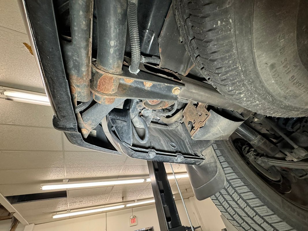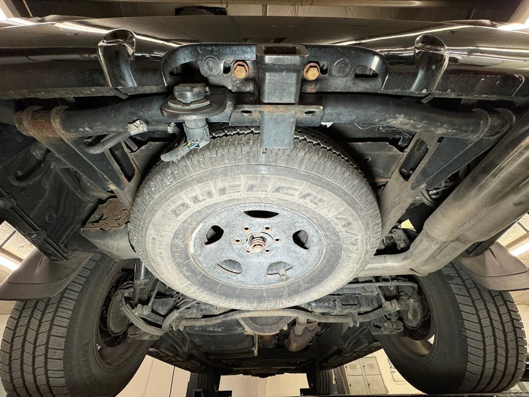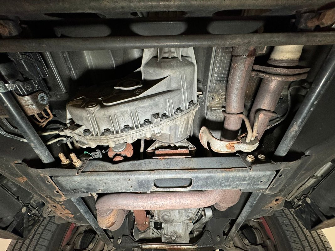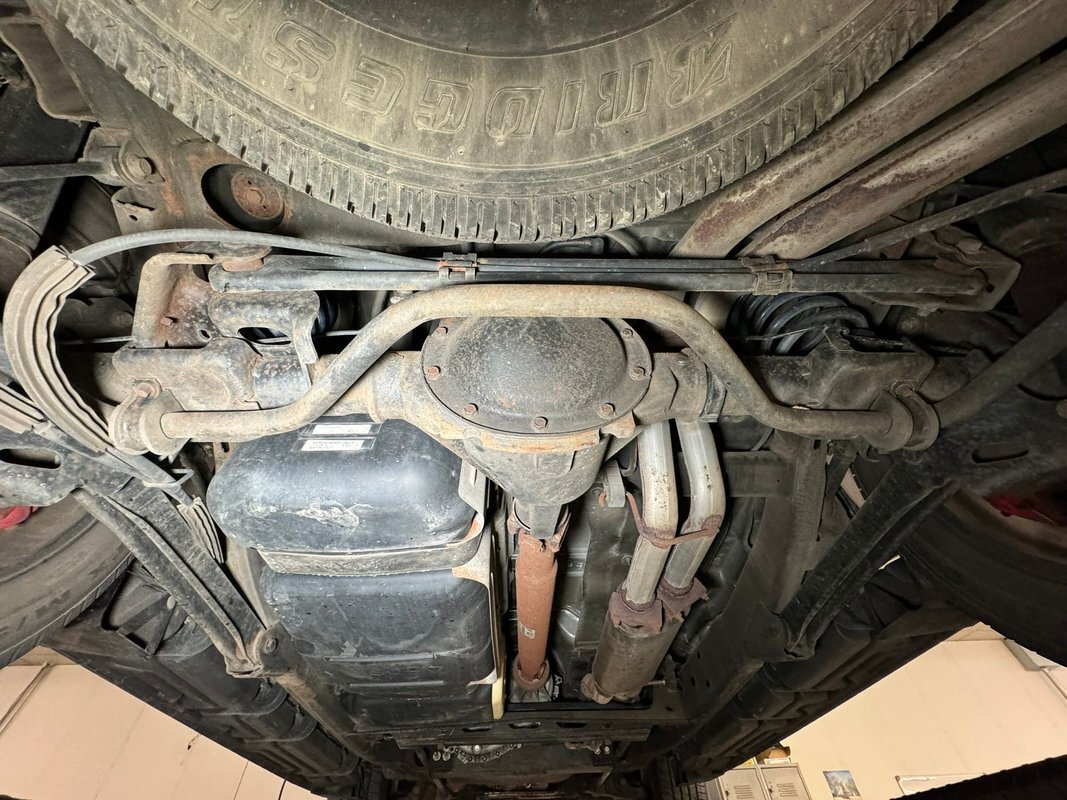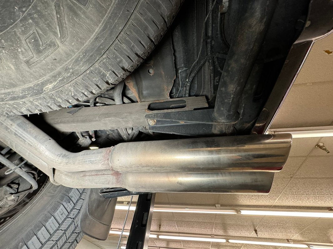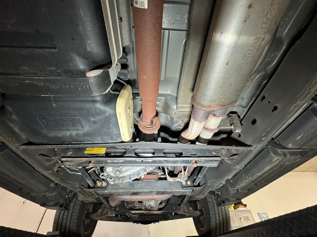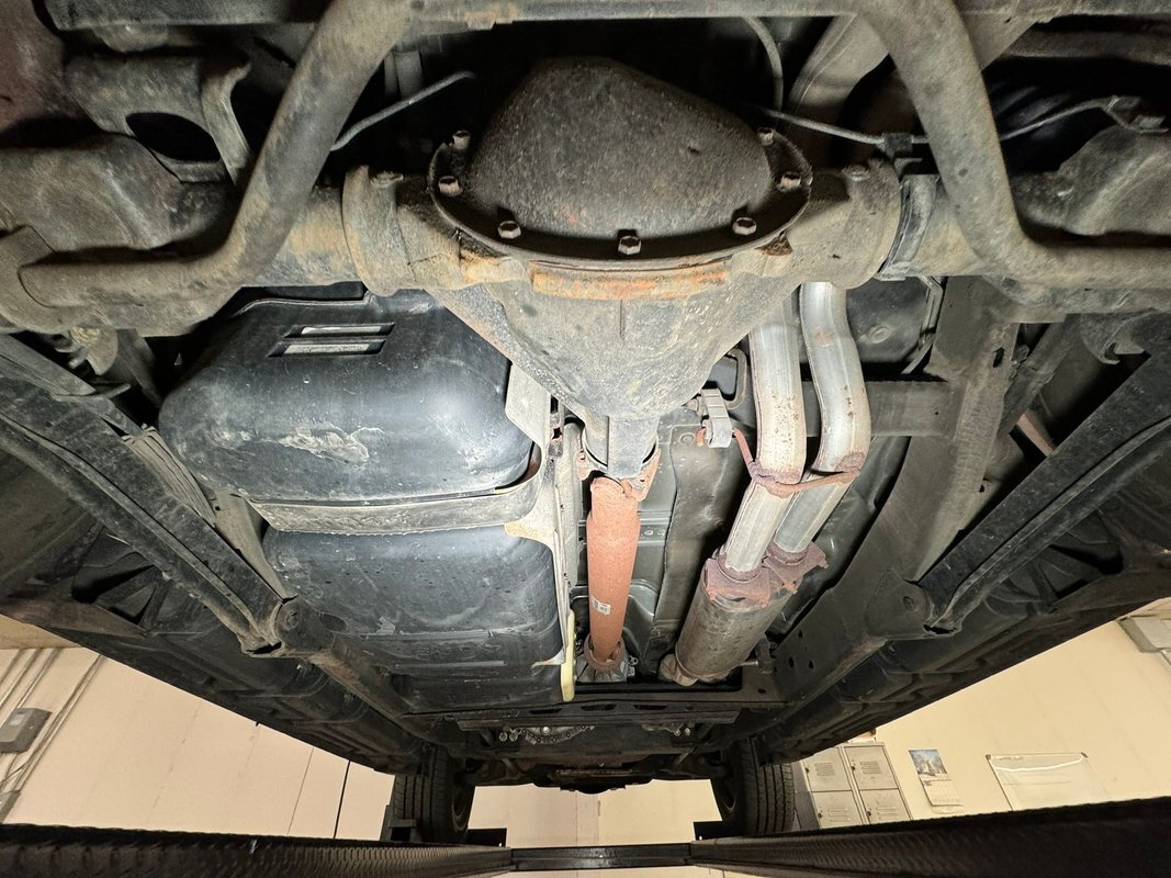 We found the lost city and it's under this truck! There's a lot of real estate under here so let's talk about what we see. Standard driver quality under here, meaning there's typical surface rust on uncoated metal surfaces. A big gas tank on the port side holds 26 gallons. The exhaust pipes meet at a single Magnaflow muffler then pair off down the length of the truck and exit via two chrome tips. A transfer case turns two driveshafts and sits between two cross braces. The oil and tranny pans are dry but we notice some unidentified dampness towards the front. Torsion bar suspension occupies the front while a four link with coil springs handles the ride in the back.