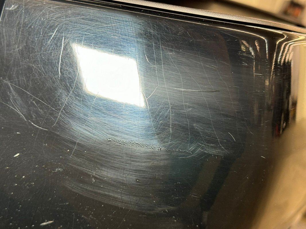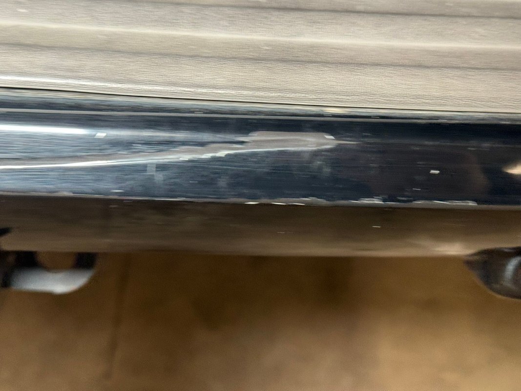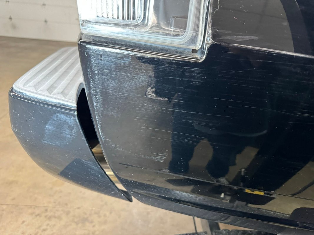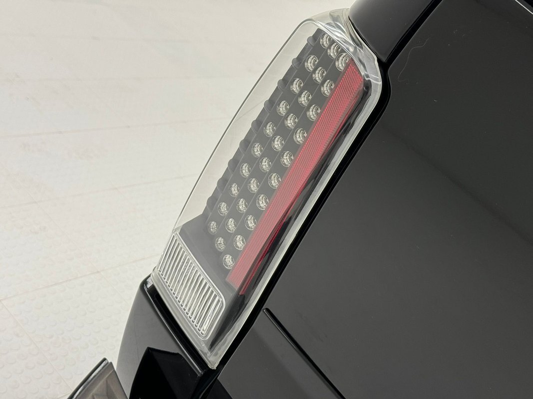 The big SUV is decked out in Raven Black and a blacked out mesh grille is a nice addition for a stylized front end. The massive flush HID low beam headlight assemblies give the Escalade its individuality and the lighting is enhanced by four LED fog/auxiliary lights mounted in the opening of the chin spoiler. Chrome door handles and the Escalade badge are the only things not black on the side of the vehicle and the spokes of the 20-inch Black Rhino wheels allow viewing of the red Wilwood brake calipers. Aftermarket clear-lens LED tail lights replace the standard red ones and provide some modern flair. The paint, including on the roof, is in great shape with the exception of some scuffs, scratches and a sideswipe below the midline of the truck and on the bumpers themselves.