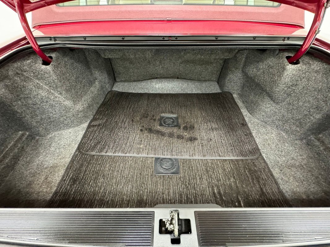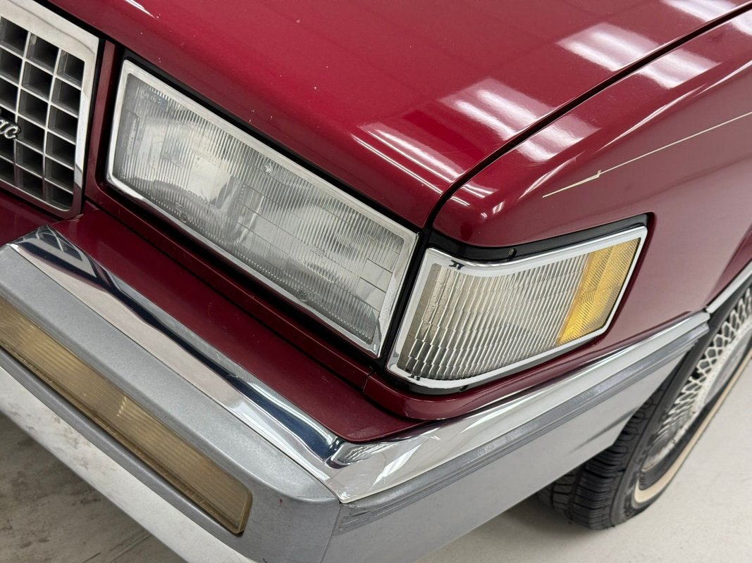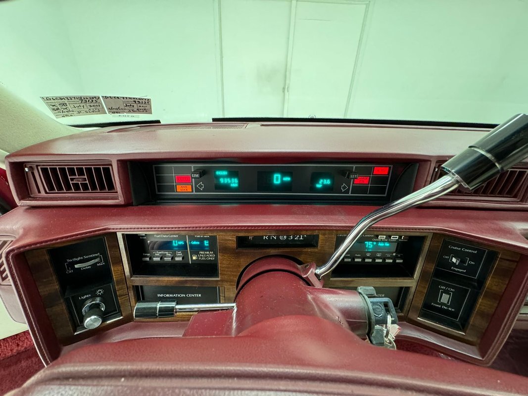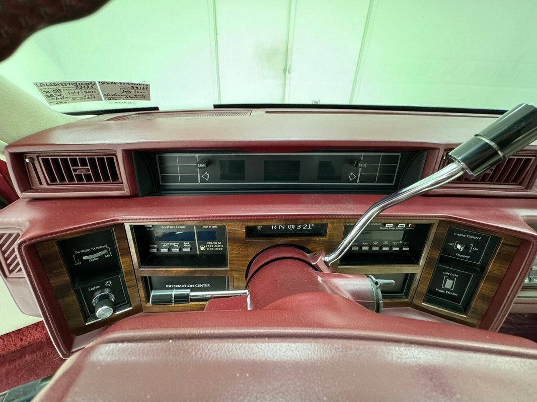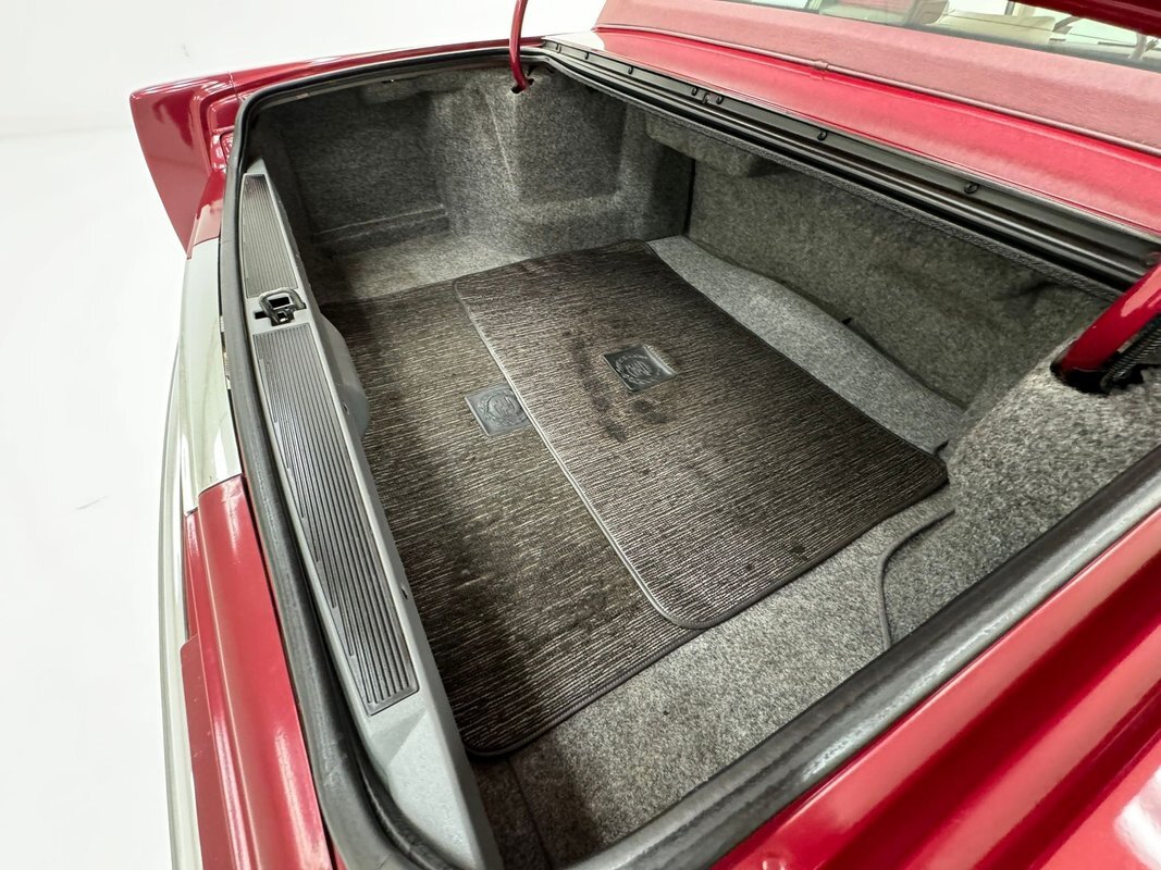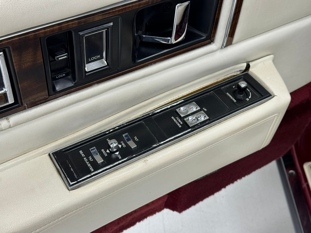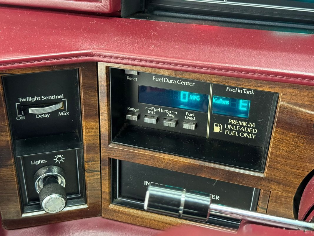 GM basecoat/clearcoat is not known for its depth and clarity in the 80's and 90's but this car shows very nicely and indicates obvious care over the years. The two-tone red/gray pattern down the length of this car is just fantastic...a design element that blurs the size of the car. And speaking of size, this is a two-door model and doors are substantial indeed! The roof is divided between hardtop and a vinyl landau with opera lights that now seem like such a neat feature! Red paint is known to oxidize on horizontal surfaces, but it all looks good here in its factory applied Carmine Red form, including the roof where care is often bypassed. The landau is in excellent condition as well. Chrome bumpers, (soon to be a thing of the past), also shine thanks to all the garage time. The long flat hood is accented by a row of indicator lights protruding like little shark fins...such a cool feature that had appeared on some GM cars for decades. The wheels, with their dizzying geometric pattern, are in good shape and surrounded by 15-inch white-wall tires.
