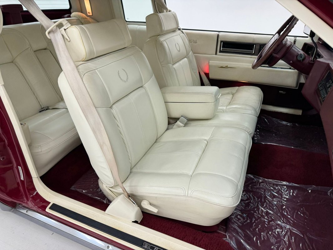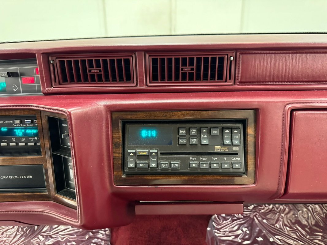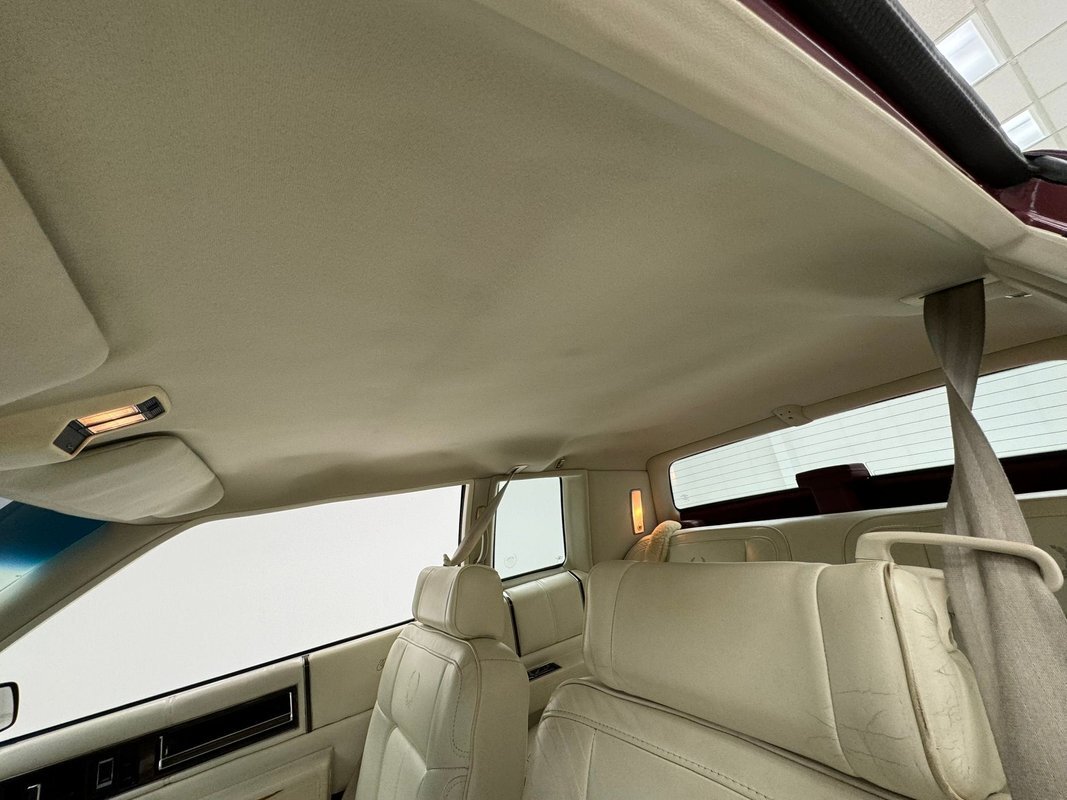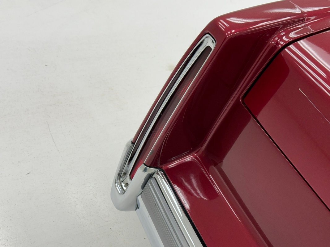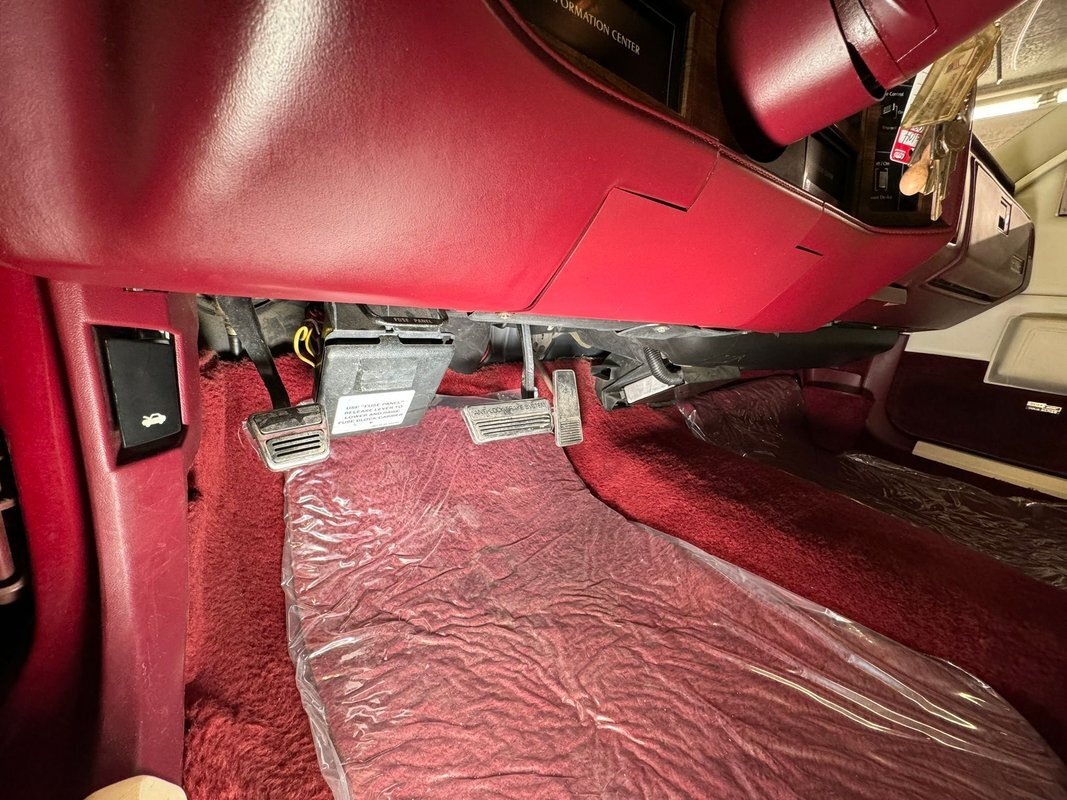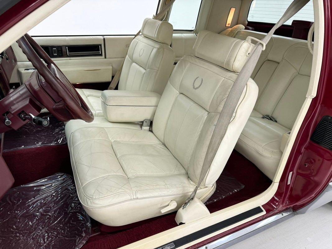 GM basecoat/clearcoat is not known for its depth and clarity in the 80's and 90's but this car shows very nicely and indicates obvious care over the years. The two-tone red/gray pattern down the length of this car is just fantastic...a design element that blurs the size of the car. And speaking of size, this is a two-door model and doors are substantial indeed! The roof is divided between hardtop and a vinyl landau with opera lights that now seem like such a neat feature! Red paint is known to oxidize on horizontal surfaces, but it all looks good here in its factory applied Carmine Red form, including the roof where care is often bypassed. The landau is in excellent condition as well. Chrome bumpers, (soon to be a thing of the past), also shine thanks to all the garage time. The long flat hood is accented by a row of indicator lights protruding like little shark fins...such a cool feature that had appeared on some GM cars for decades. The wheels, with their dizzying geometric pattern, are in good shape and surrounded by 15-inch white-wall tires.