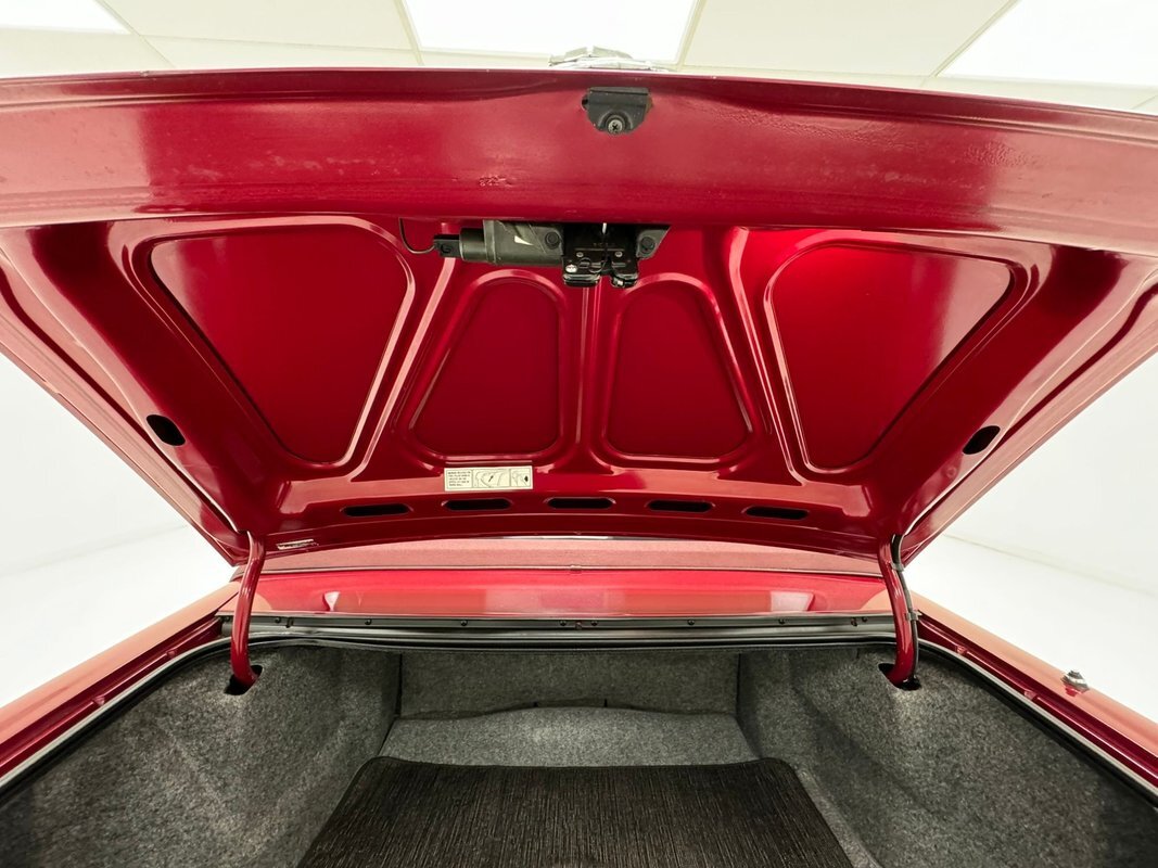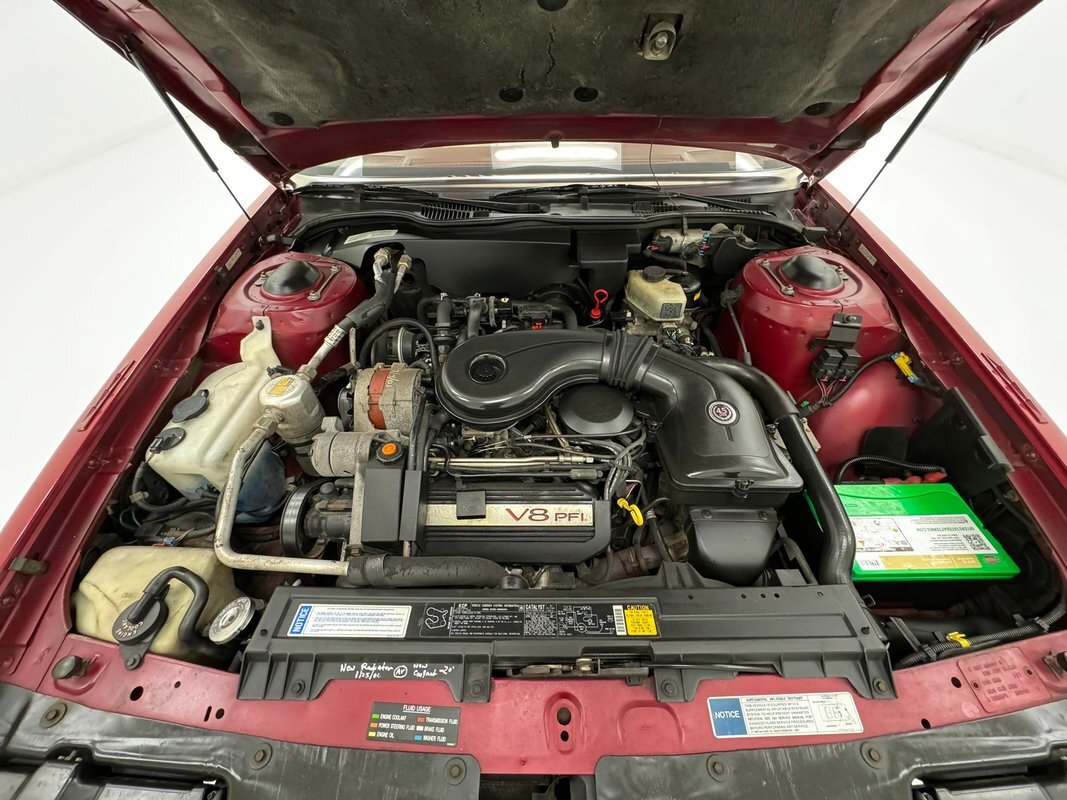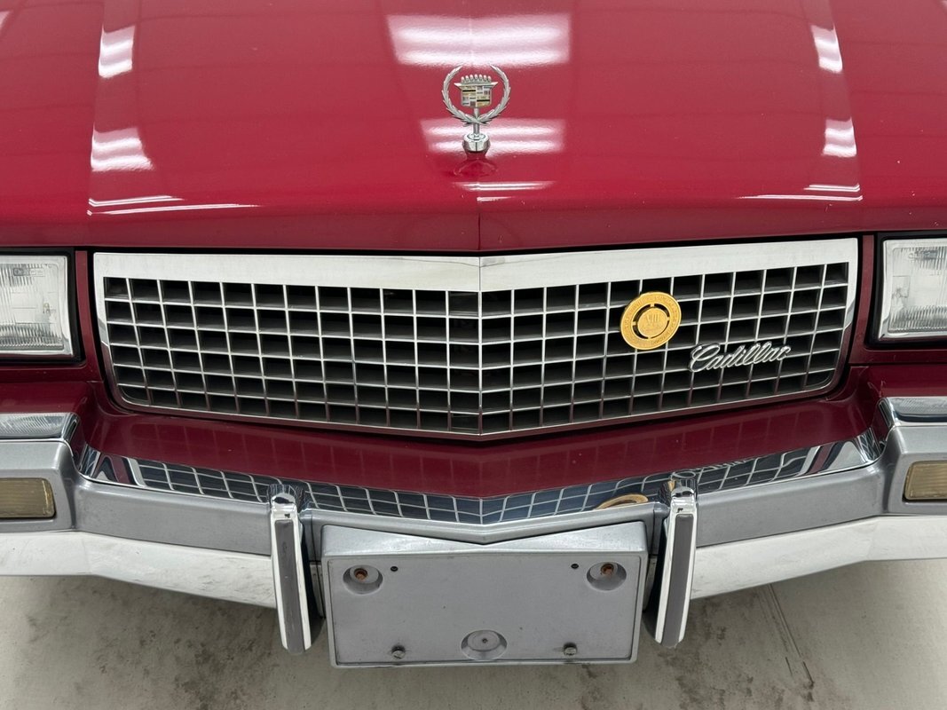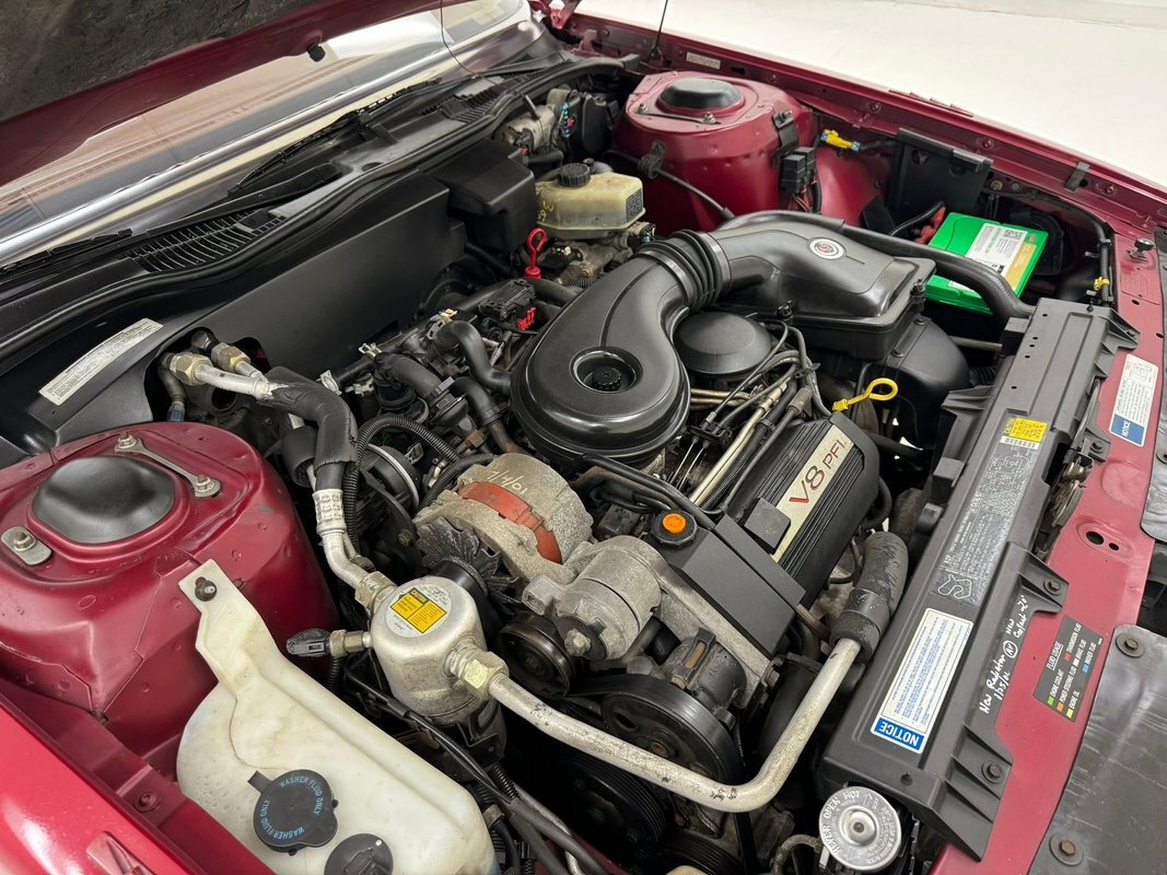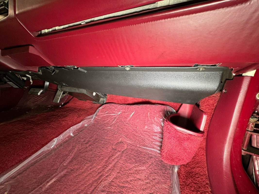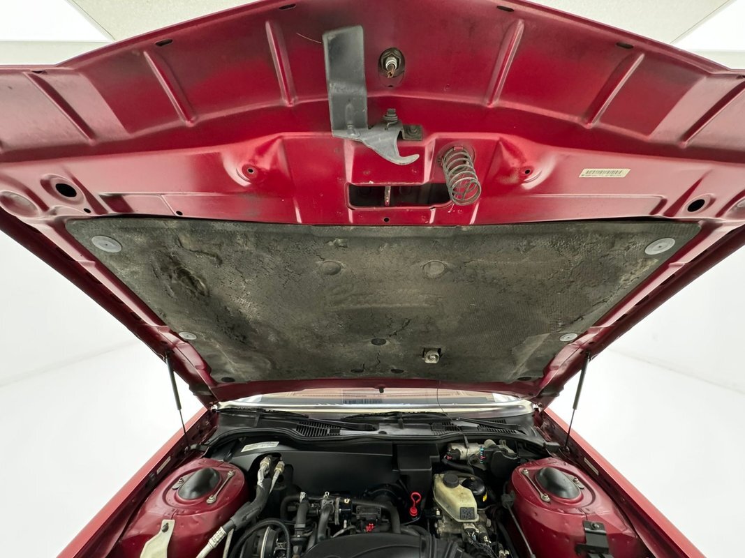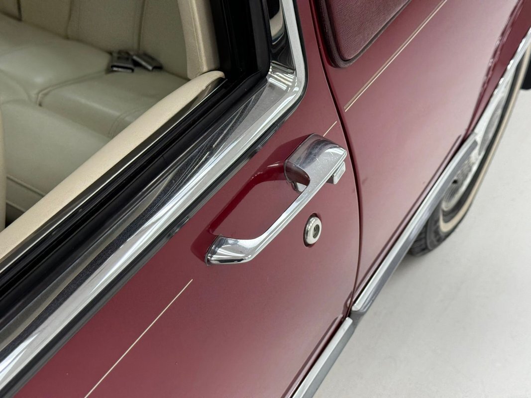 GM basecoat/clearcoat is not known for its depth and clarity in the 80's and 90's but this car shows very nicely and indicates obvious care over the years. The two-tone red/gray pattern down the length of this car is just fantastic...a design element that blurs the size of the car. And speaking of size, this is a two-door model and doors are substantial indeed! The roof is divided between hardtop and a vinyl landau with opera lights that now seem like such a neat feature! Red paint is known to oxidize on horizontal surfaces, but it all looks good here in its factory applied Carmine Red form, including the roof where care is often bypassed. The landau is in excellent condition as well. Chrome bumpers, (soon to be a thing of the past), also shine thanks to all the garage time. The long flat hood is accented by a row of indicator lights protruding like little shark fins...such a cool feature that had appeared on some GM cars for decades. The wheels, with their dizzying geometric pattern, are in good shape and surrounded by 15-inch white-wall tires.