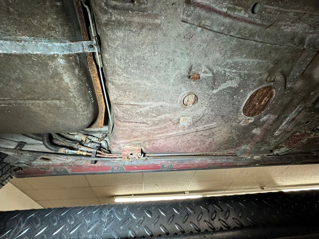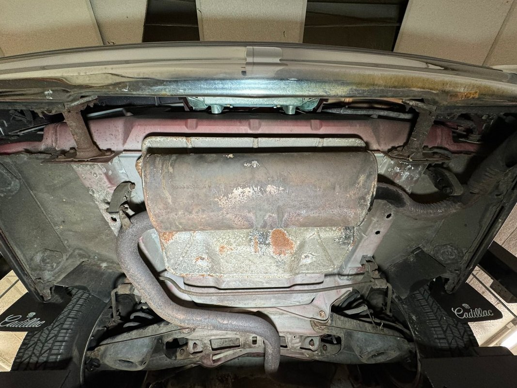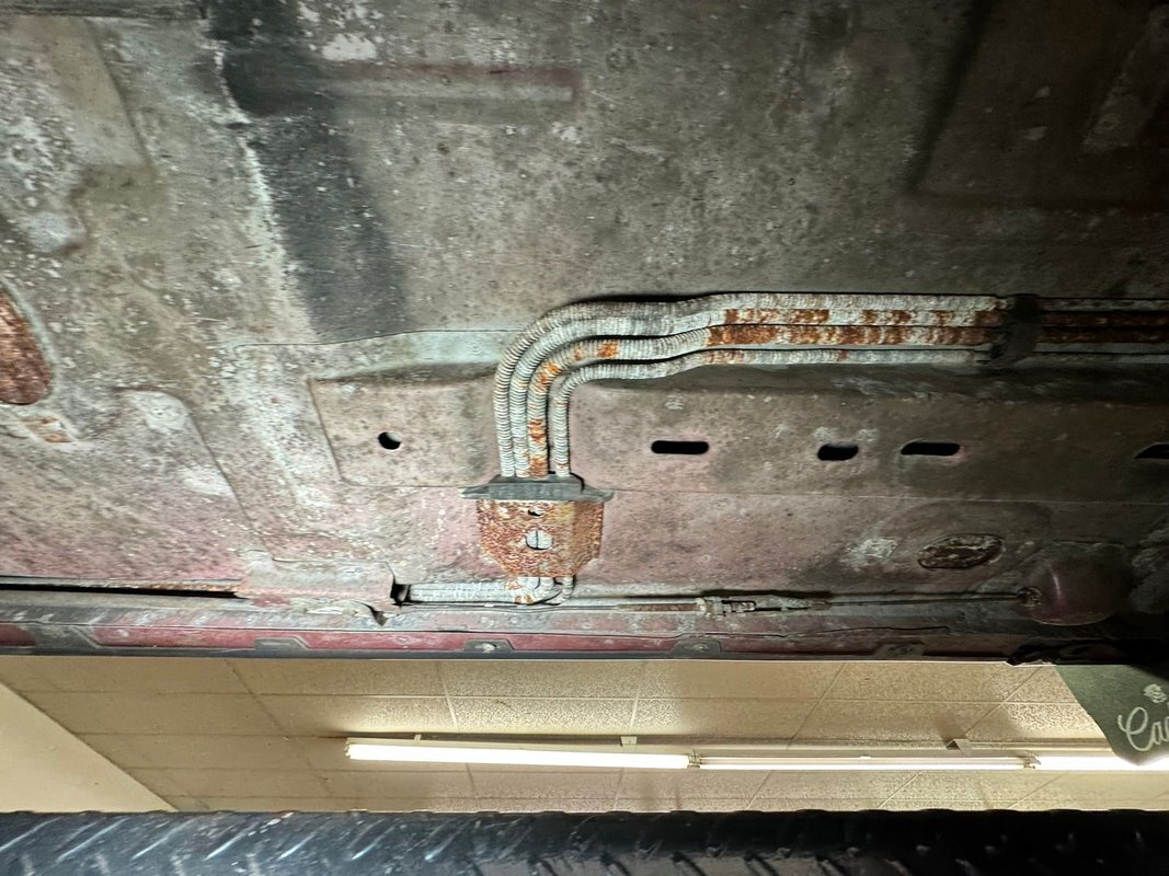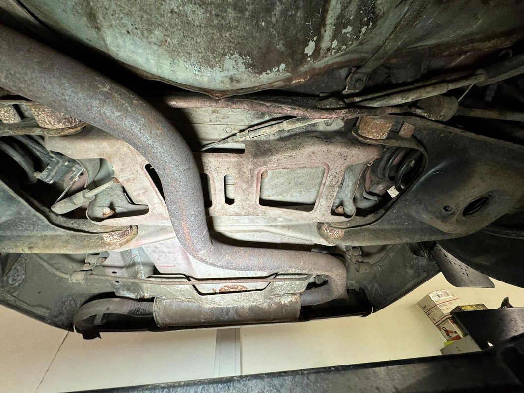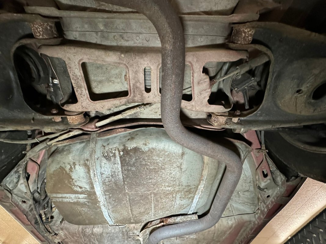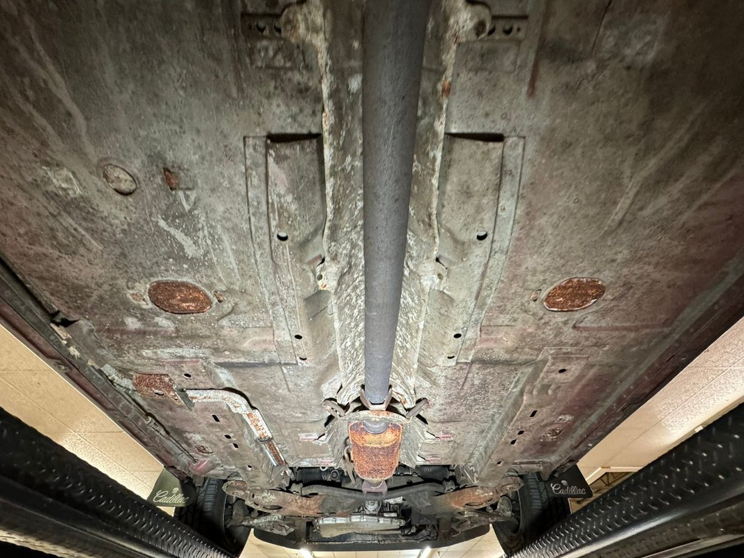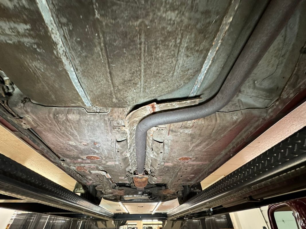 Some typical surface rust and discoloration for a driven vehicle of this vintage. But for a car that lived its entire life on the East coast, the undercarriage is actually pretty nice. No major areas of concern; some grease residue by the zerk fittings, some oil on the pan, and some pitting on the bumper support brackets...but all else looks good. The single exhaust has surface rust, but otherwise complete with rubber hangers still intact.