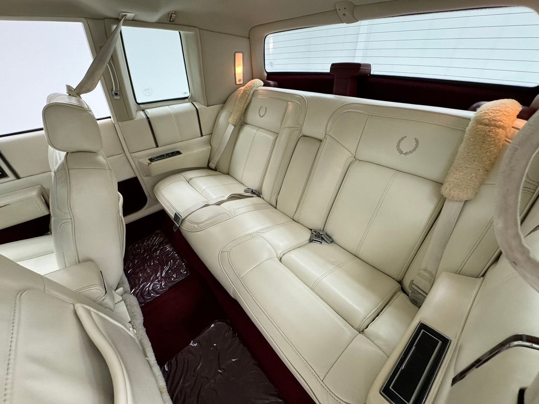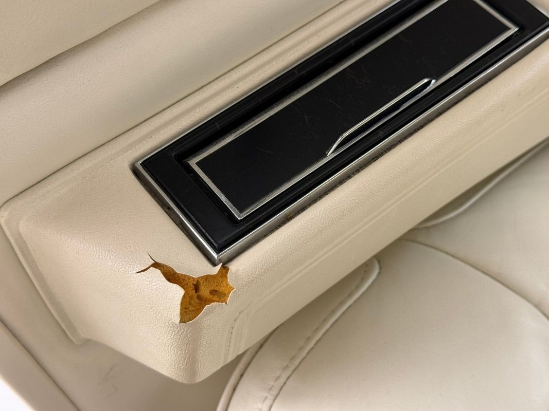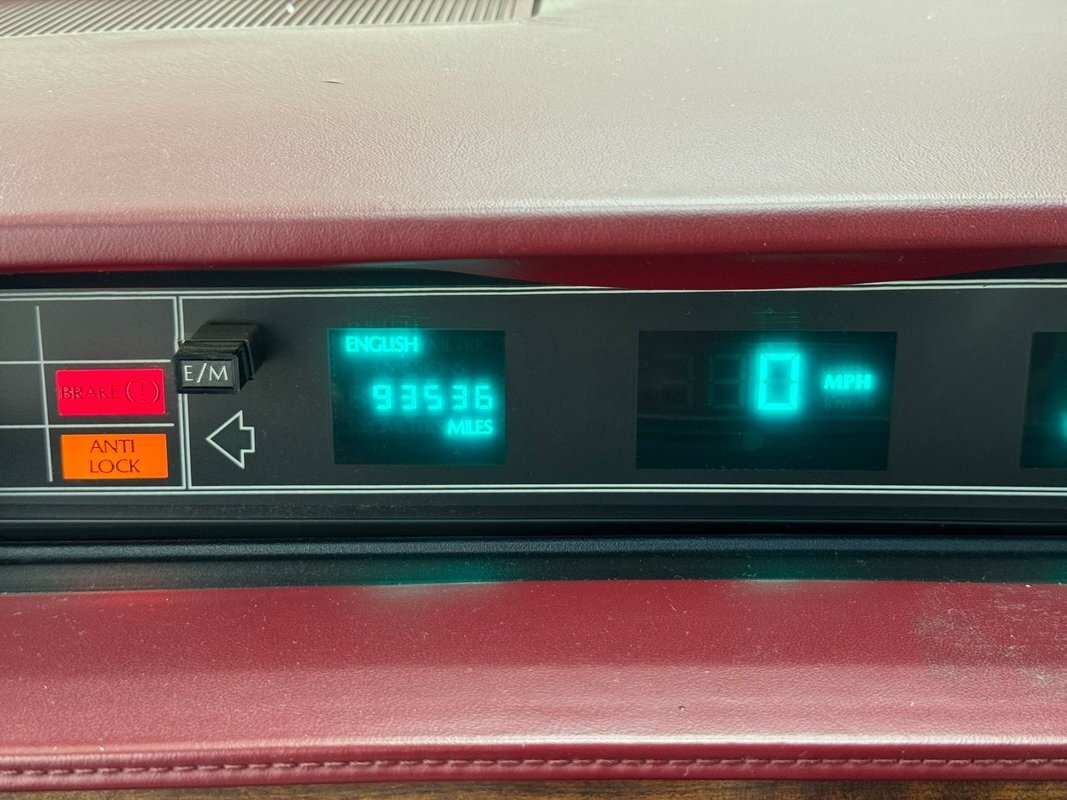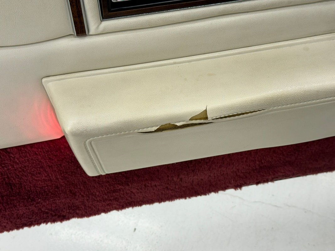 White leather abounds and shows some of its age and usage...this car has 93,536 title verified miles...that's a lot of getting in and getting out. But hey, white leather is still the "bomb" and retains its comforts. A large armrest folds down and divides the occupants of the split bench and sits atop a storage bin when folded. The back seats look barely used. The white contrasts against the red carpet, lower door panels, and dash. Some tears in the padded armrests are visible and some separation on the driver's side. Electronic seat controls, marked in period GM font, are on the door rest, as is the control for left and right side mirrors. The airbag filled steering wheel shows some wear and the dash with its green digital readout and faux wood trim is a welcome throwback that is sure to elicit memories. Though the pod is canted to the driver, there are lots of small buttons next to the steering column for the "fuel data center" and climate control while other pertinent information, (speed, mileage, trip computer, idiot lights), are displayed high on the dash. The stock Delco AM/FM/CD radio is pure 90's, (although likely held over from the 80's). The large glove box proclaims "DeVille" with a plaque and is topped with a line of A/C vents. Courtesy lights illuminate the back seat from the B-pillar and it makes for a very comfortable atmosphere. The headliner is in good condition, as is the red carpeting that floods the floors.