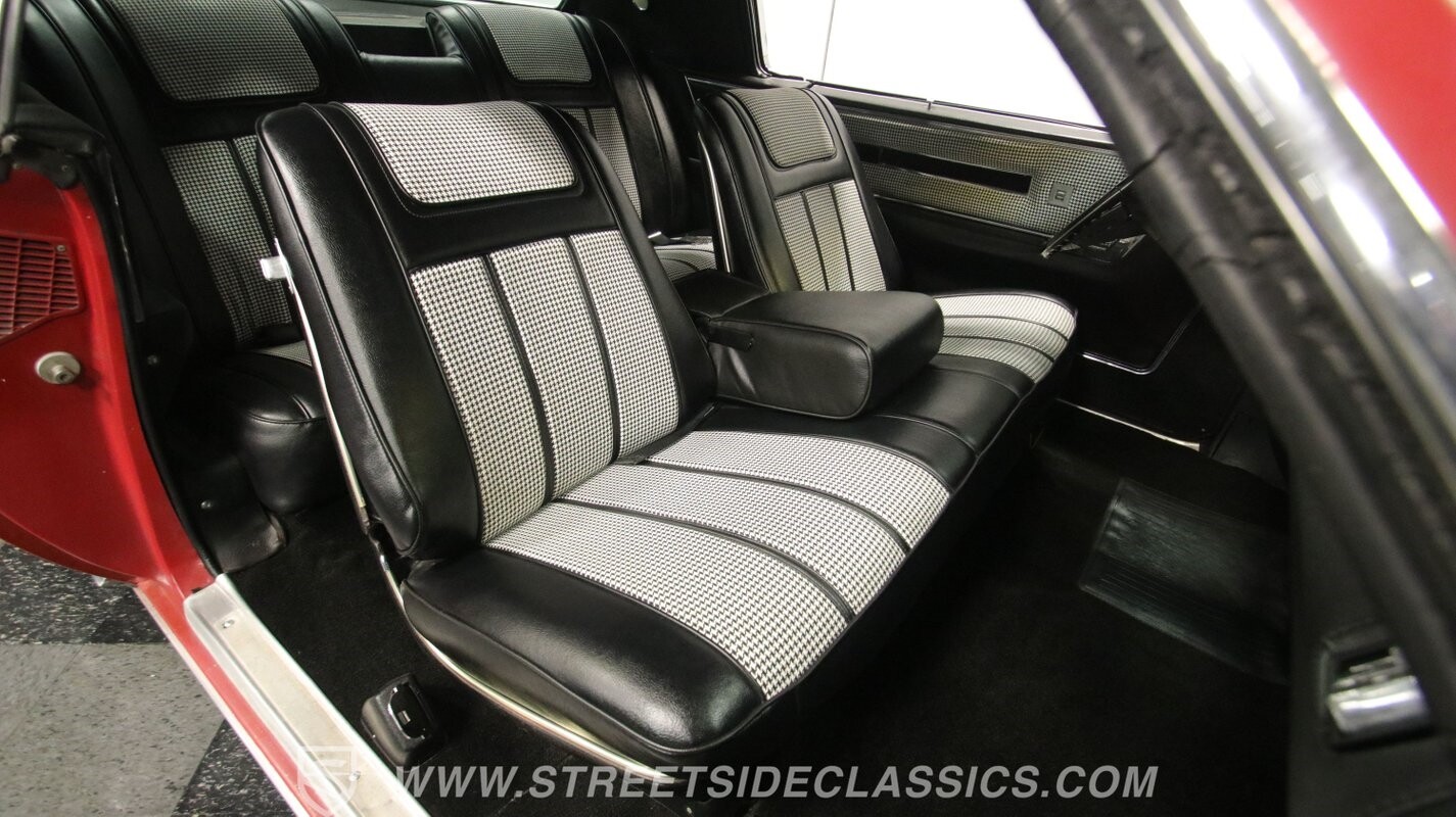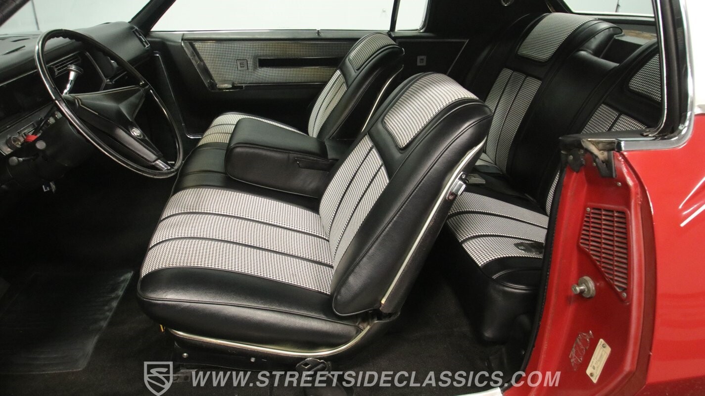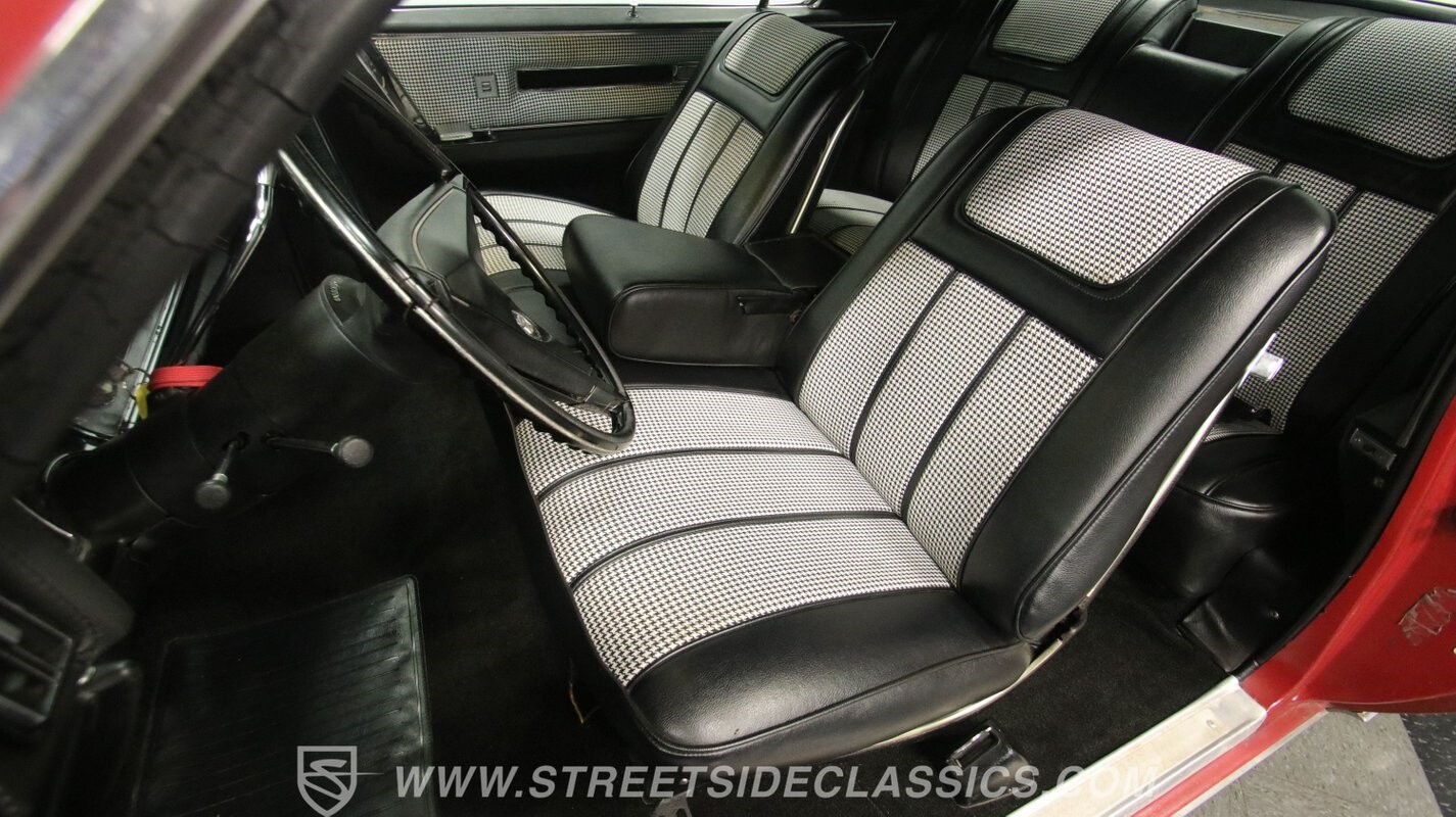 The interior continues the uniquely attractive style and muscle car flair. After all, we tend to think houndstooth interiors were inside the best power cars, and the Camaro wouldn't even get the option until '68. But when it's used here it just adds to the distinction and the cloth inserts in the seats and doors harmonize with the black and brightwork that surrounds it. This is a roomy hardtop that can carry plenty of family and friends. But an executive-level car like this is also about personal driver comfort. That's why you have a fold-down front armrest, a tilt/telescoping steering column, and all the features are within easy reach. This includes the classic AM/FM/radio, power locks, and power windows that let you take down all the glass on this pillarless hardtop.