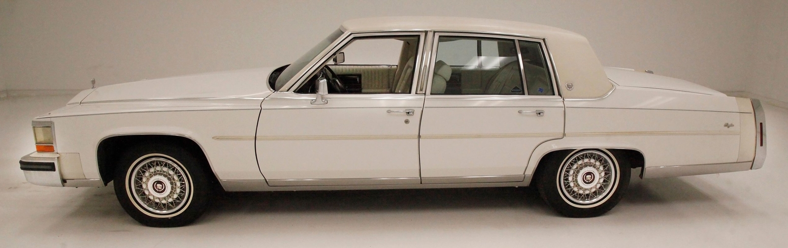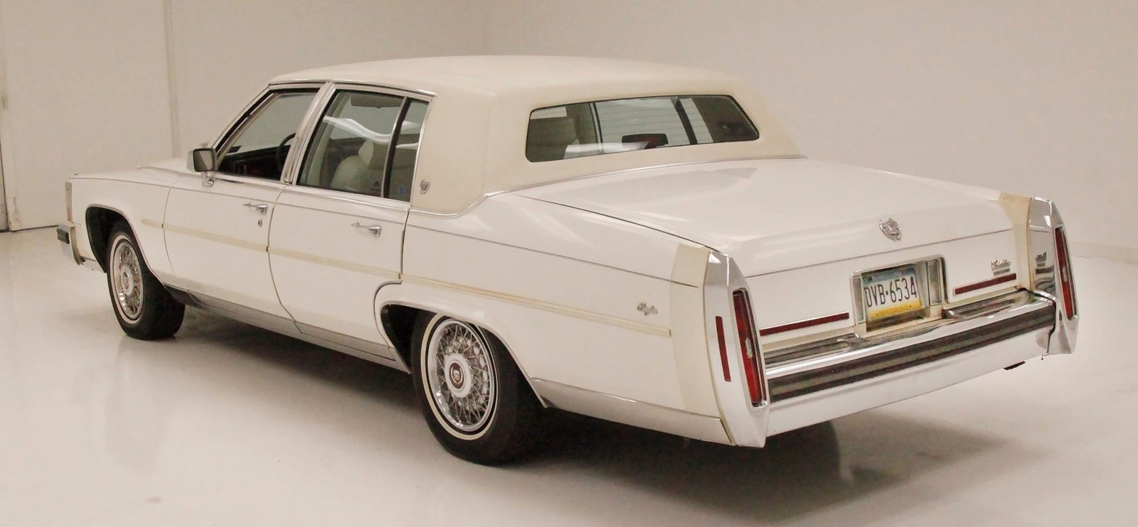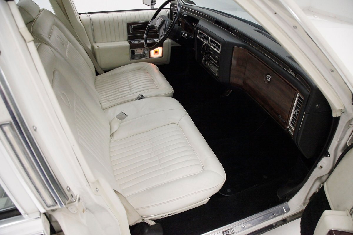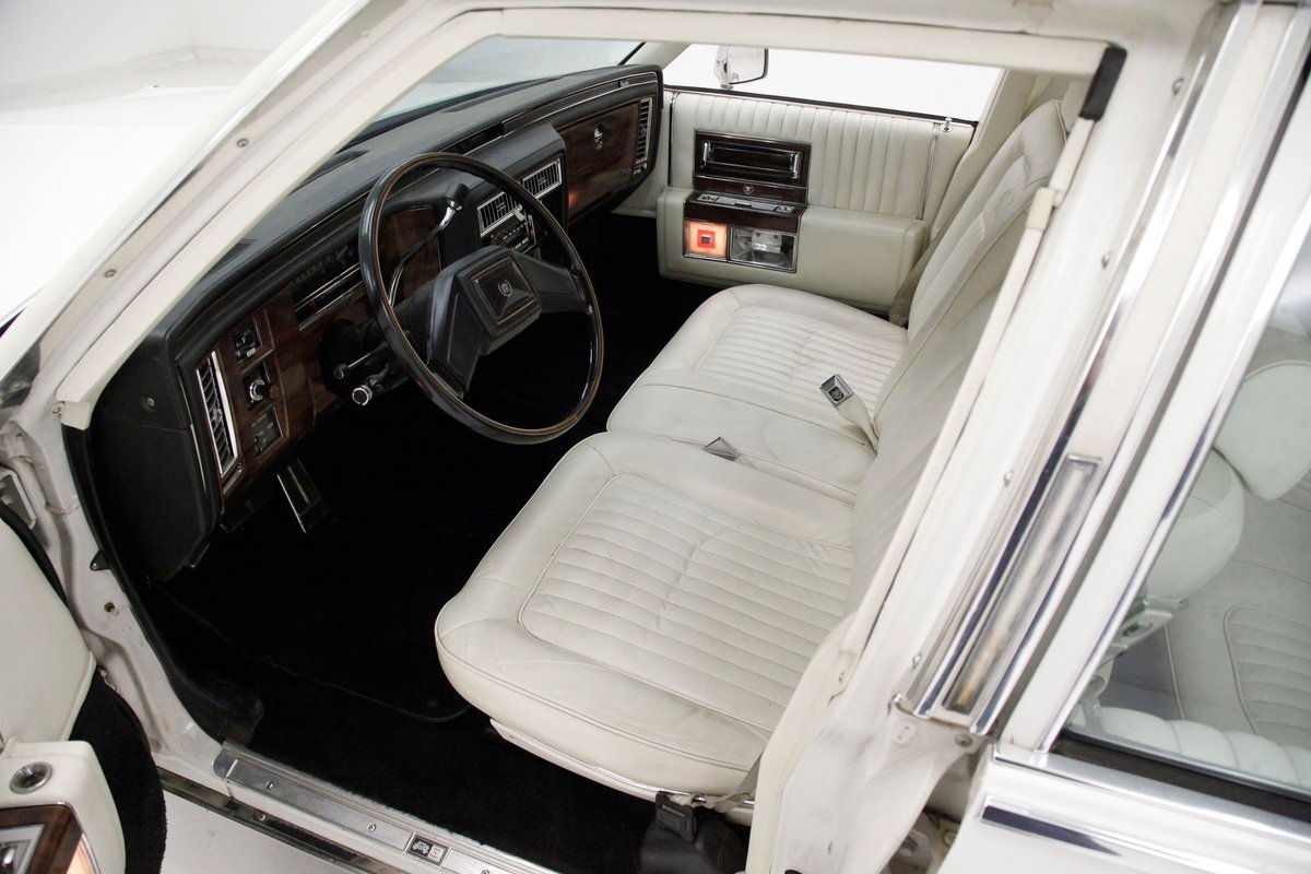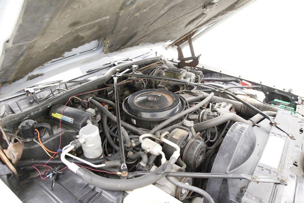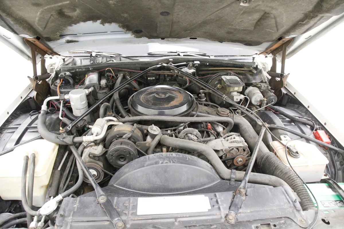 The gold faded to silver wreathed, cloisonne center crowned badge leads the way on top of the V style egg crate chromed grille which is flanked by some serious spare and rectangle design in the form of dual headlights. Just below the horizontal turn signals with a winged crown crest adhered to them, wrap around the front quarters, where they have some running lights just above them. Below all this late 80's menagerie is a clean chromed bumper with some rubber strips inserted. A large stainless rocker covering takes over up front of the wheel well and works its way to the rear of the car. This is a 4-door luxury sedan and for the gaps of this we note they are all well minded. On the roof is a padded vinyl top in white just like the rest of the exterior. The three bedroom size trunk lid is framed on either side by vertical big bezeled taillights and more caddy crests in their centers. A shiny rear bumper is below, and I can see no problems visually with this rear framer. Gold leafed crown crests are peppering the exterior throughout the car, and for the chromed wire wheel covers they are also not to be out done. Finally, some tasteful black pin striping makes its way throughout the edges and panels of this wonderful piece of Detroit iron. Overall the paint presents well with some minor chips, staining and a few cracks and missing pieces of the filler panels, but the body remains rust free.