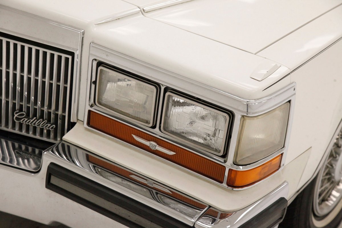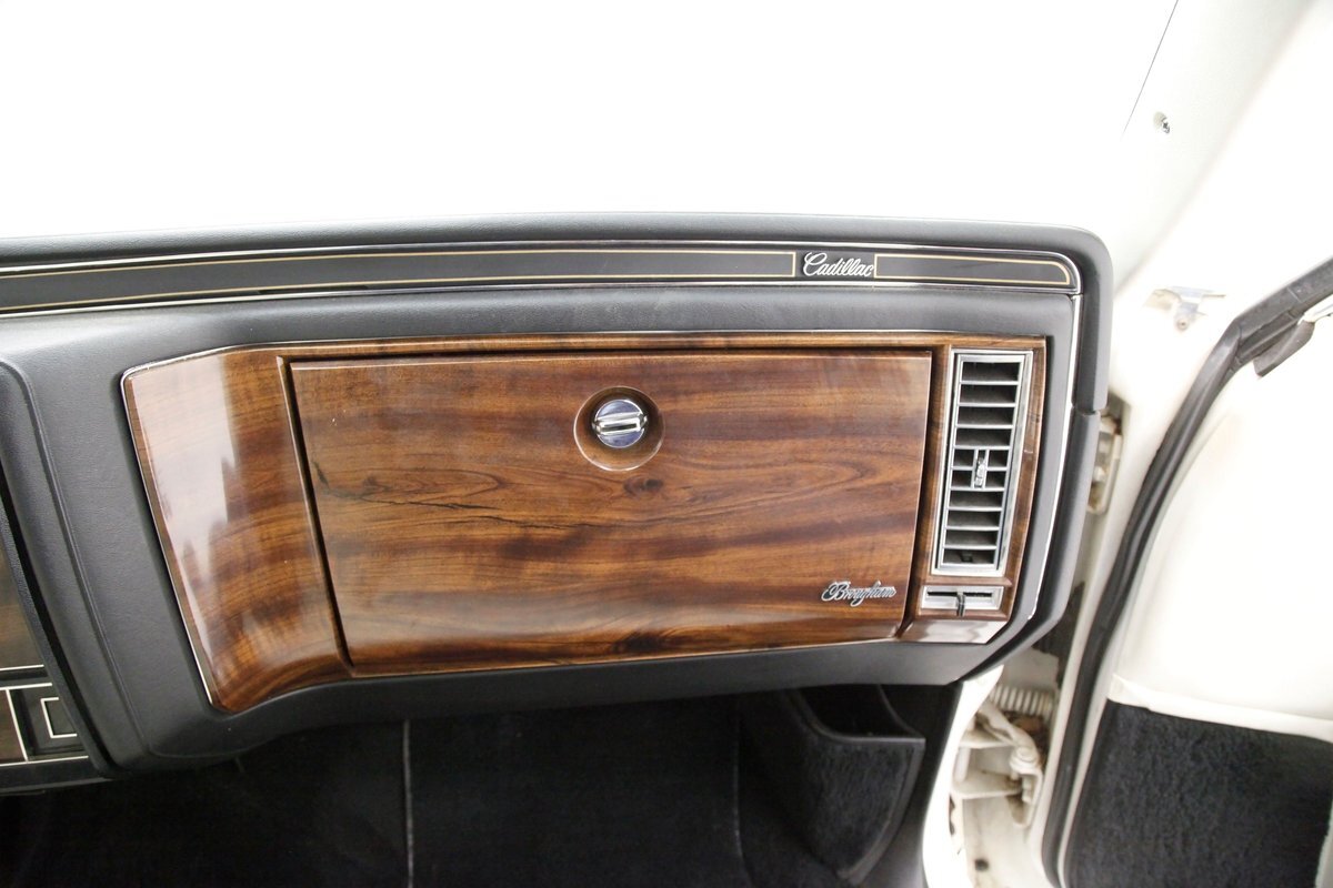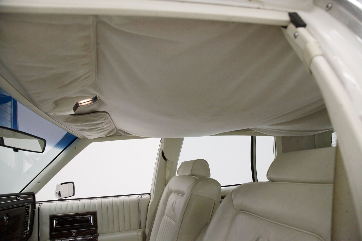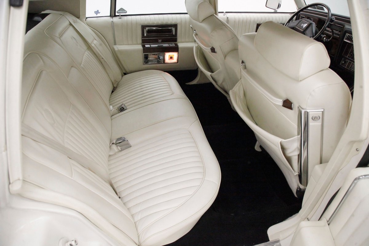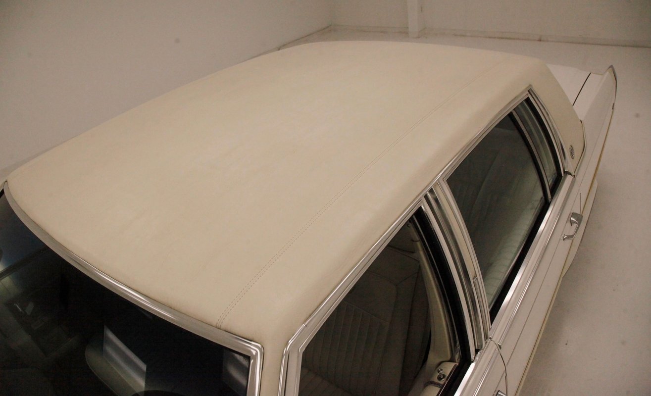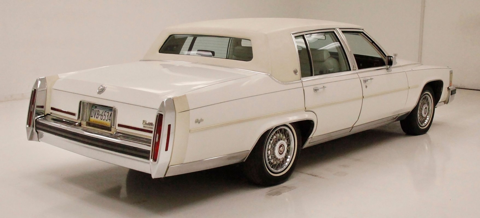 The gold faded to silver wreathed, cloisonne center crowned badge leads the way on top of the V style egg crate chromed grille which is flanked by some serious spare and rectangle design in the form of dual headlights. Just below the horizontal turn signals with a winged crown crest adhered to them, wrap around the front quarters, where they have some running lights just above them. Below all this late 80's menagerie is a clean chromed bumper with some rubber strips inserted. A large stainless rocker covering takes over up front of the wheel well and works its way to the rear of the car. This is a 4-door luxury sedan and for the gaps of this we note they are all well minded. On the roof is a padded vinyl top in white just like the rest of the exterior. The three bedroom size trunk lid is framed on either side by vertical big bezeled taillights and more caddy crests in their centers. A shiny rear bumper is below, and I can see no problems visually with this rear framer. Gold leafed crown crests are peppering the exterior throughout the car, and for the chromed wire wheel covers they are also not to be out done. Finally, some tasteful black pin striping makes its way throughout the edges and panels of this wonderful piece of Detroit iron. Overall the paint presents well with some minor chips, staining and a few cracks and missing pieces of the filler panels, but the body remains rust free.