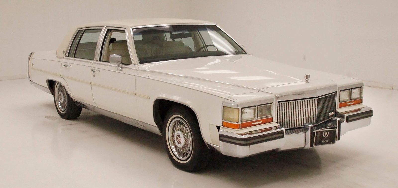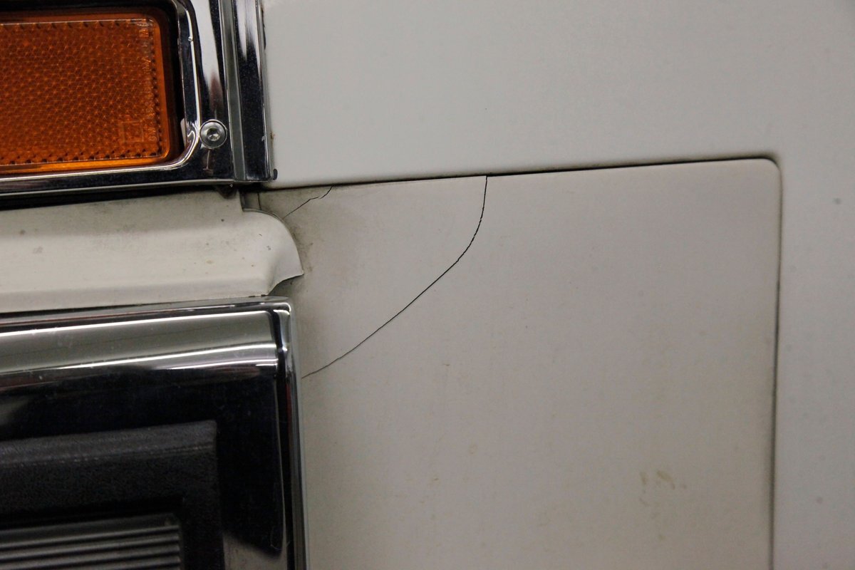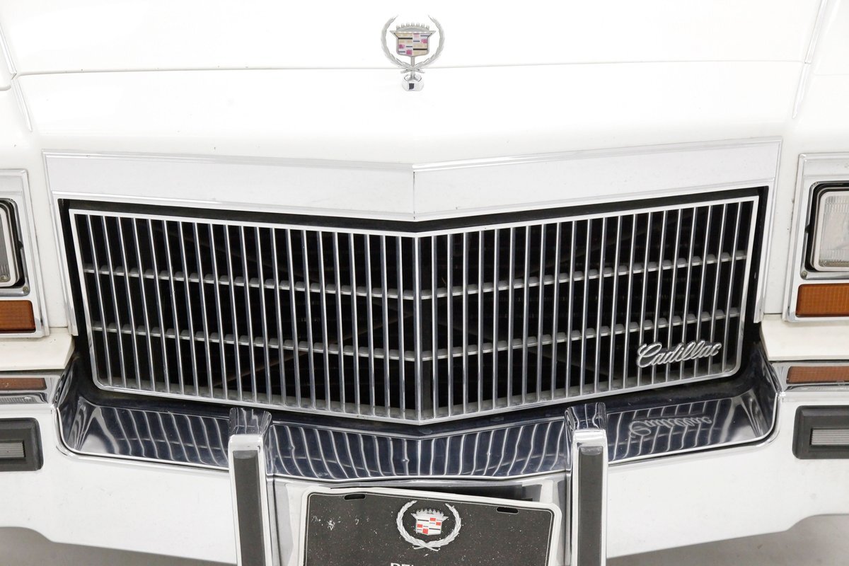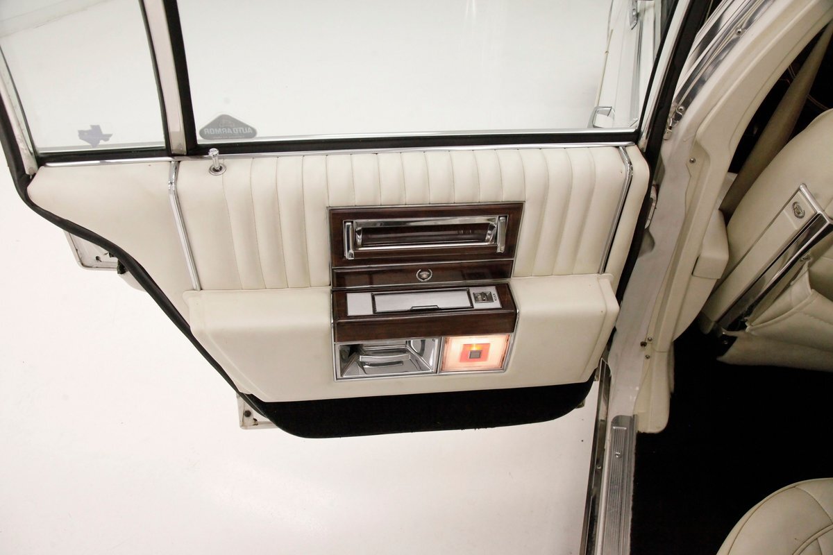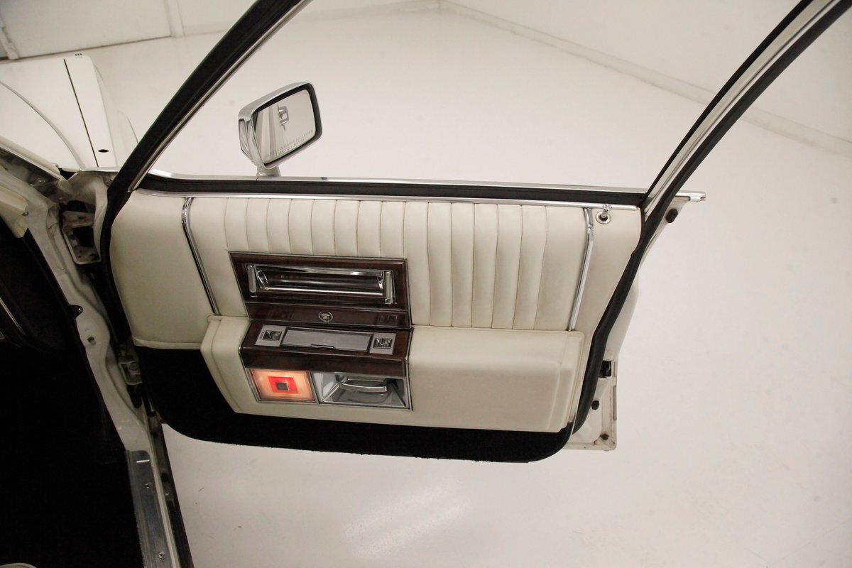 The gold faded to silver wreathed, cloisonne center crowned badge leads the way on top of the V style egg crate chromed grille which is flanked by some serious spare and rectangle design in the form of dual headlights. Just below the horizontal turn signals with a winged crown crest adhered to them, wrap around the front quarters, where they have some running lights just above them. Below all this late 80's menagerie is a clean chromed bumper with some rubber strips inserted. A large stainless rocker covering takes over up front of the wheel well and works its way to the rear of the car. This is a 4-door luxury sedan and for the gaps of this we note they are all well minded. On the roof is a padded vinyl top in white just like the rest of the exterior. The three bedroom size trunk lid is framed on either side by vertical big bezeled taillights and more caddy crests in their centers. A shiny rear bumper is below, and I can see no problems visually with this rear framer. Gold leafed crown crests are peppering the exterior throughout the car, and for the chromed wire wheel covers they are also not to be out done. Finally, some tasteful black pin striping makes its way throughout the edges and panels of this wonderful piece of Detroit iron. Overall the paint presents well with some minor chips, staining and a few cracks and missing pieces of the filler panels, but the body remains rust free.
