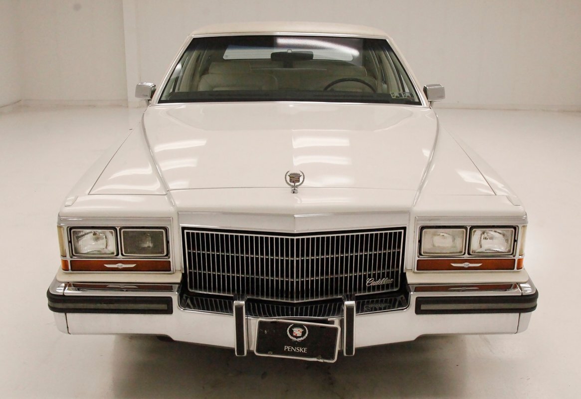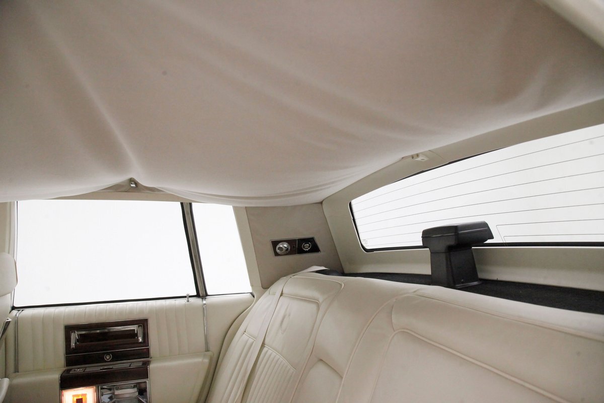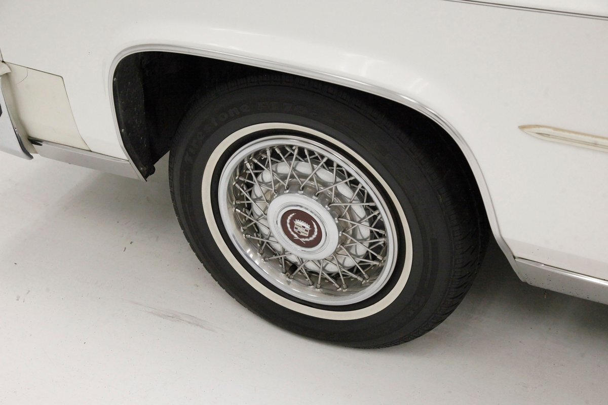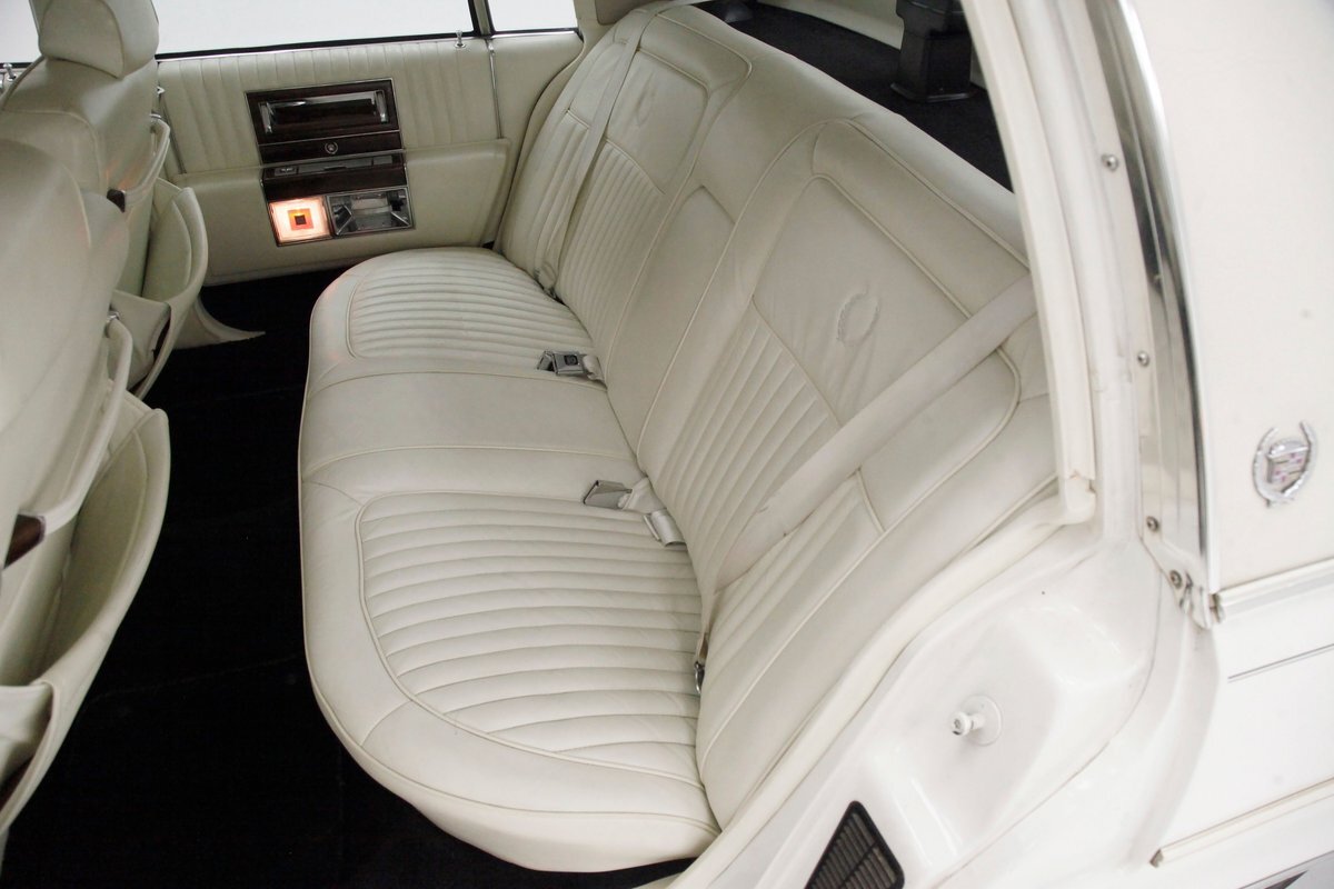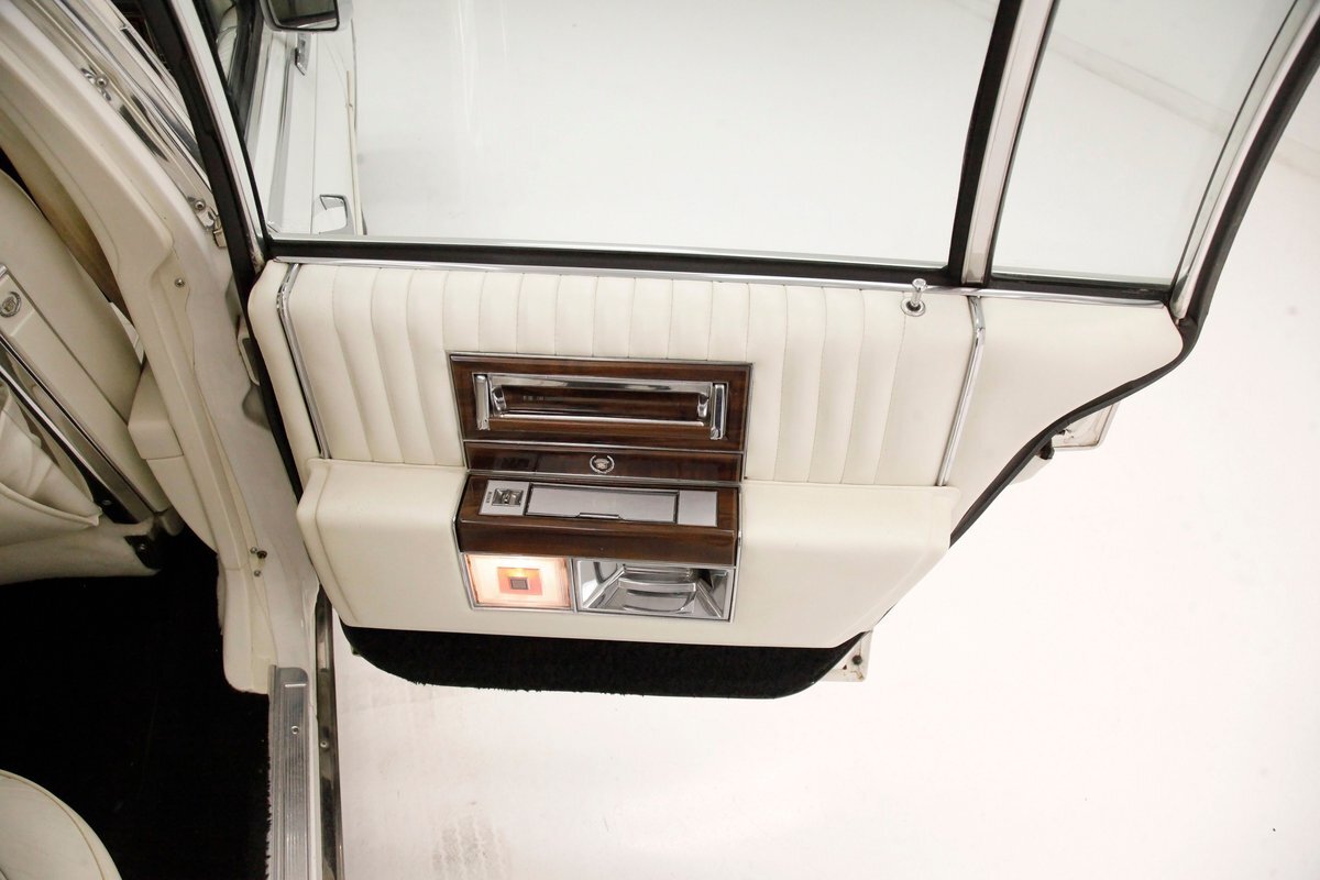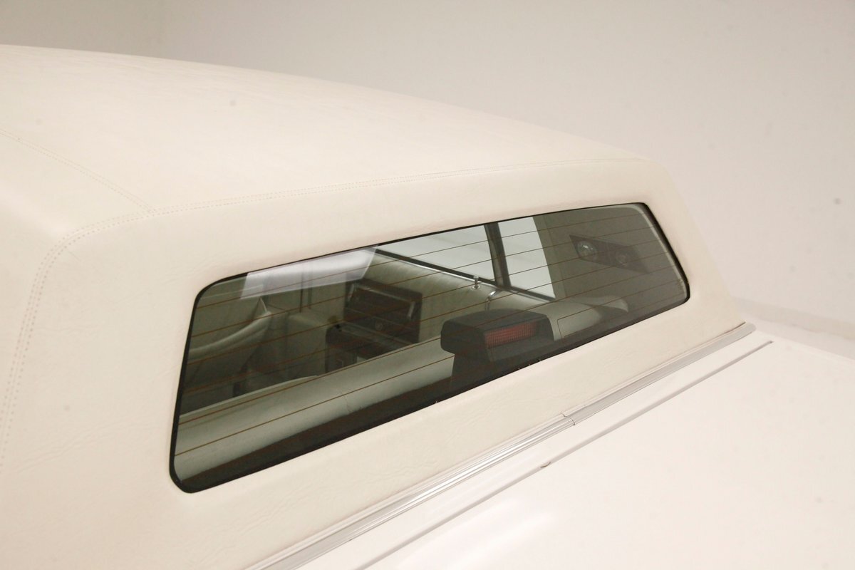 The gold faded to silver wreathed, cloisonne center crowned badge leads the way on top of the V style egg crate chromed grille which is flanked by some serious spare and rectangle design in the form of dual headlights. Just below the horizontal turn signals with a winged crown crest adhered to them, wrap around the front quarters, where they have some running lights just above them. Below all this late 80's menagerie is a clean chromed bumper with some rubber strips inserted. A large stainless rocker covering takes over up front of the wheel well and works its way to the rear of the car. This is a 4-door luxury sedan and for the gaps of this we note they are all well minded. On the roof is a padded vinyl top in white just like the rest of the exterior. The three bedroom size trunk lid is framed on either side by vertical big bezeled taillights and more caddy crests in their centers. A shiny rear bumper is below, and I can see no problems visually with this rear framer. Gold leafed crown crests are peppering the exterior throughout the car, and for the chromed wire wheel covers they are also not to be out done. Finally, some tasteful black pin striping makes its way throughout the edges and panels of this wonderful piece of Detroit iron. Overall the paint presents well with some minor chips, staining and a few cracks and missing pieces of the filler panels, but the body remains rust free.
