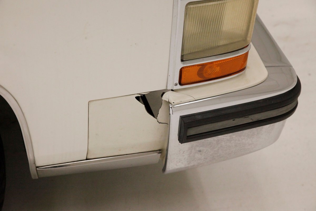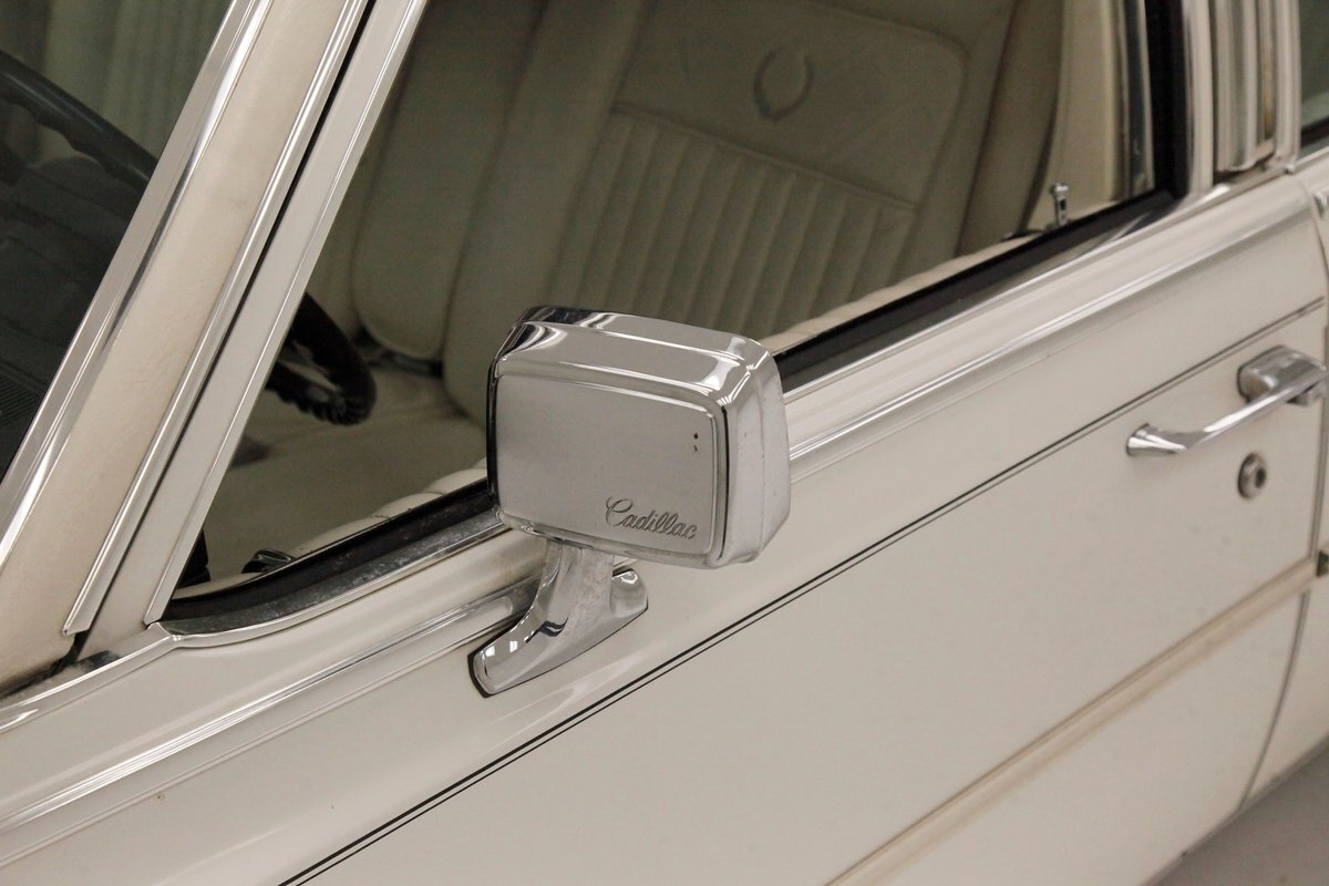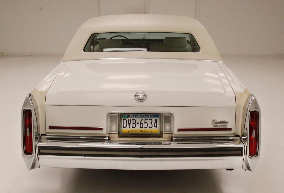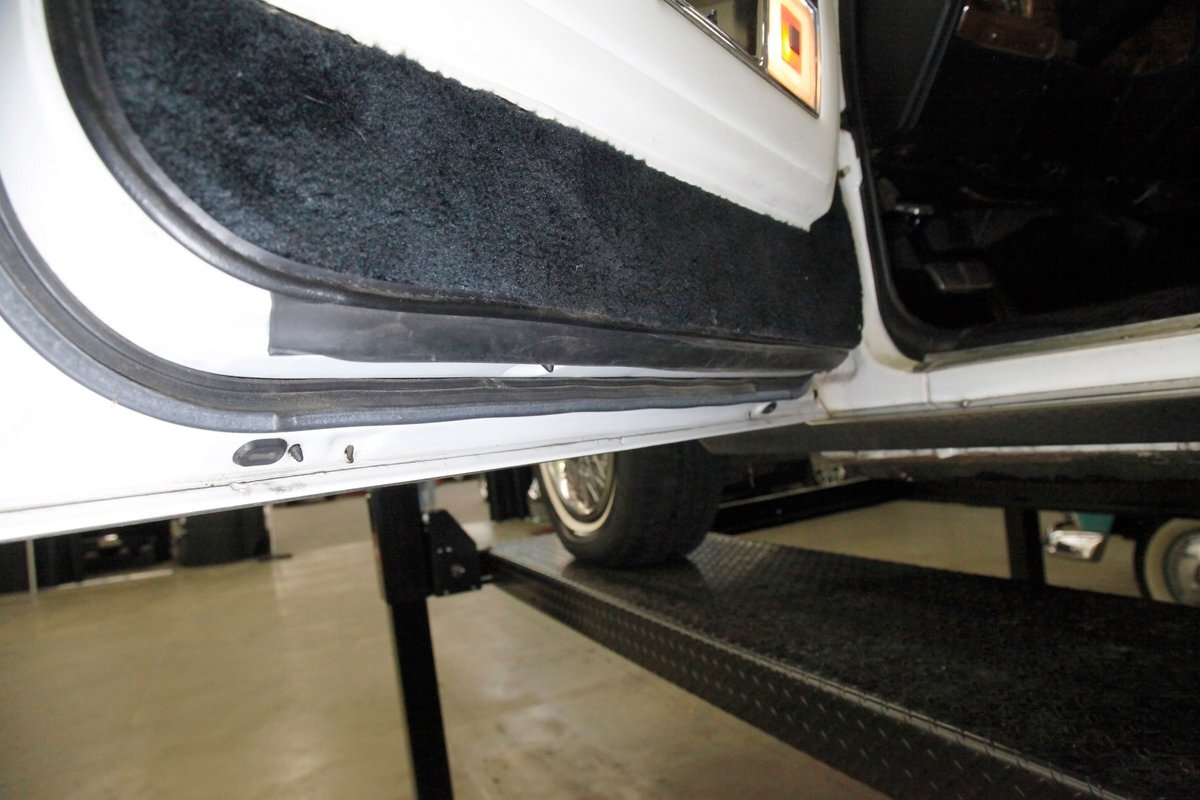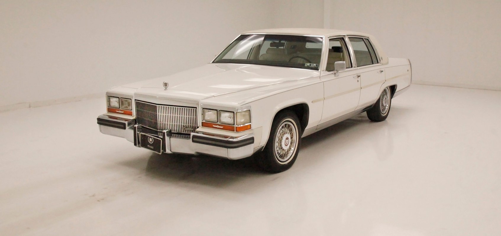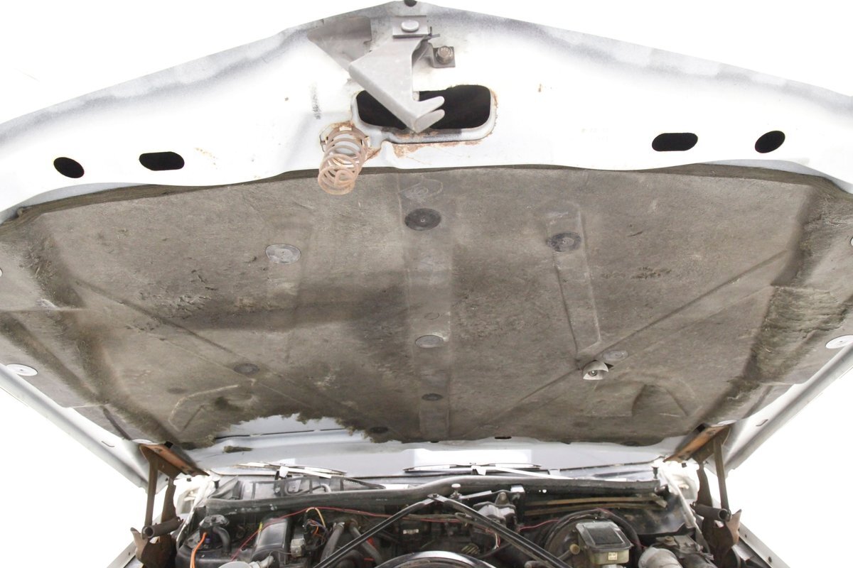 The gold faded to silver wreathed, cloisonne center crowned badge leads the way on top of the V style egg crate chromed grille which is flanked by some serious spare and rectangle design in the form of dual headlights. Just below the horizontal turn signals with a winged crown crest adhered to them, wrap around the front quarters, where they have some running lights just above them. Below all this late 80's menagerie is a clean chromed bumper with some rubber strips inserted. A large stainless rocker covering takes over up front of the wheel well and works its way to the rear of the car. This is a 4-door luxury sedan and for the gaps of this we note they are all well minded. On the roof is a padded vinyl top in white just like the rest of the exterior. The three bedroom size trunk lid is framed on either side by vertical big bezeled taillights and more caddy crests in their centers. A shiny rear bumper is below, and I can see no problems visually with this rear framer. Gold leafed crown crests are peppering the exterior throughout the car, and for the chromed wire wheel covers they are also not to be out done. Finally, some tasteful black pin striping makes its way throughout the edges and panels of this wonderful piece of Detroit iron. Overall the paint presents well with some minor chips, staining and a few cracks and missing pieces of the filler panels, but the body remains rust free.