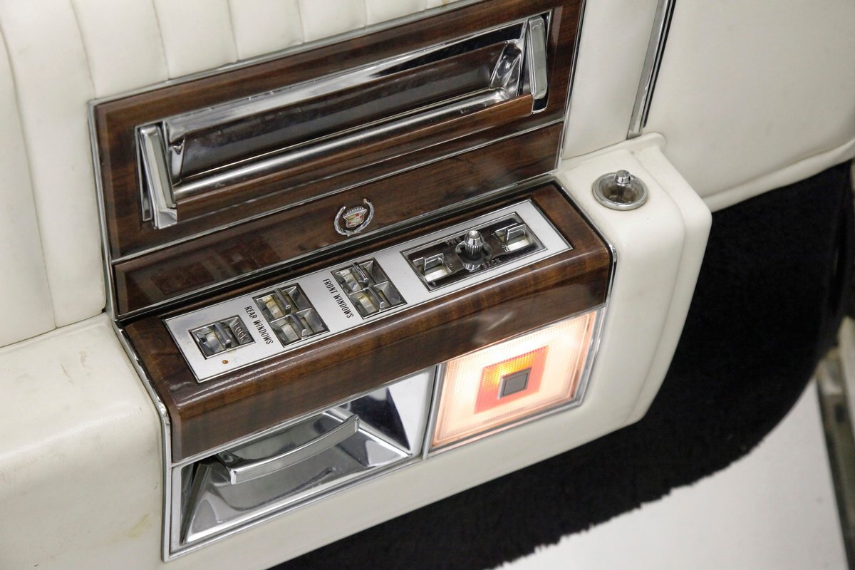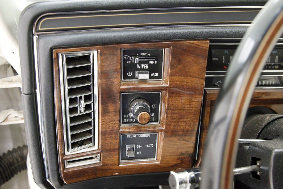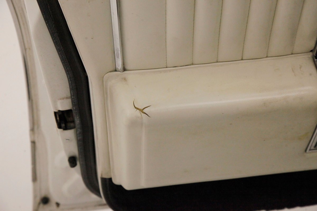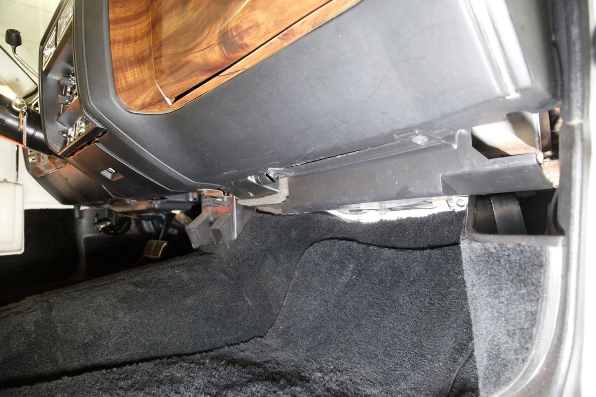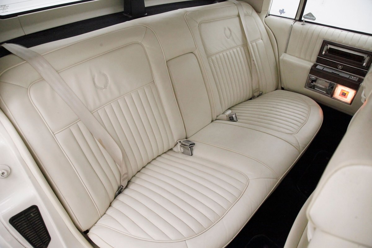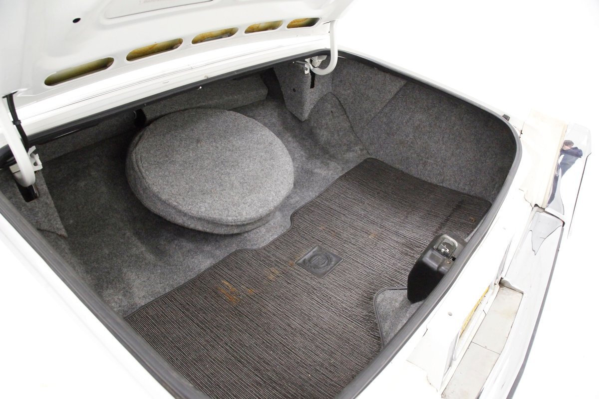 Just as luxurious as the exterior, we see plenty of white padded vinyl wood applique, chromed panels and black carpeting covering the door's insides. The customary power toggles are on the armrest as the chromed door actuator and a courtesy light. Inside pillow-like white leather covered wide buckets are up front and there is a fold down white armrest in the center. These have aged gracefully and have a few folds in the leather thrown in for that character. In back a spacious rear bench has access to big pouches for storage and plenty of legroom covered entirely with well preserved, clean black carpeting. Upfront a nicely curved U shape is reserved for the dash, and it has wood applique within the black padded surroundings. It's 1989 and all the creature comforts are controlled by push buttons and even some blue LCD readouts are within. More wood applique for the passenger glove box and above all this finery is a heavily sagged and stained white felted broadcloth headliner.