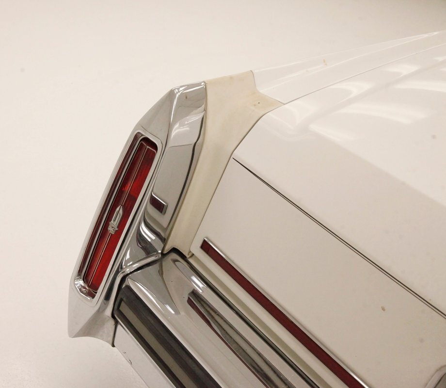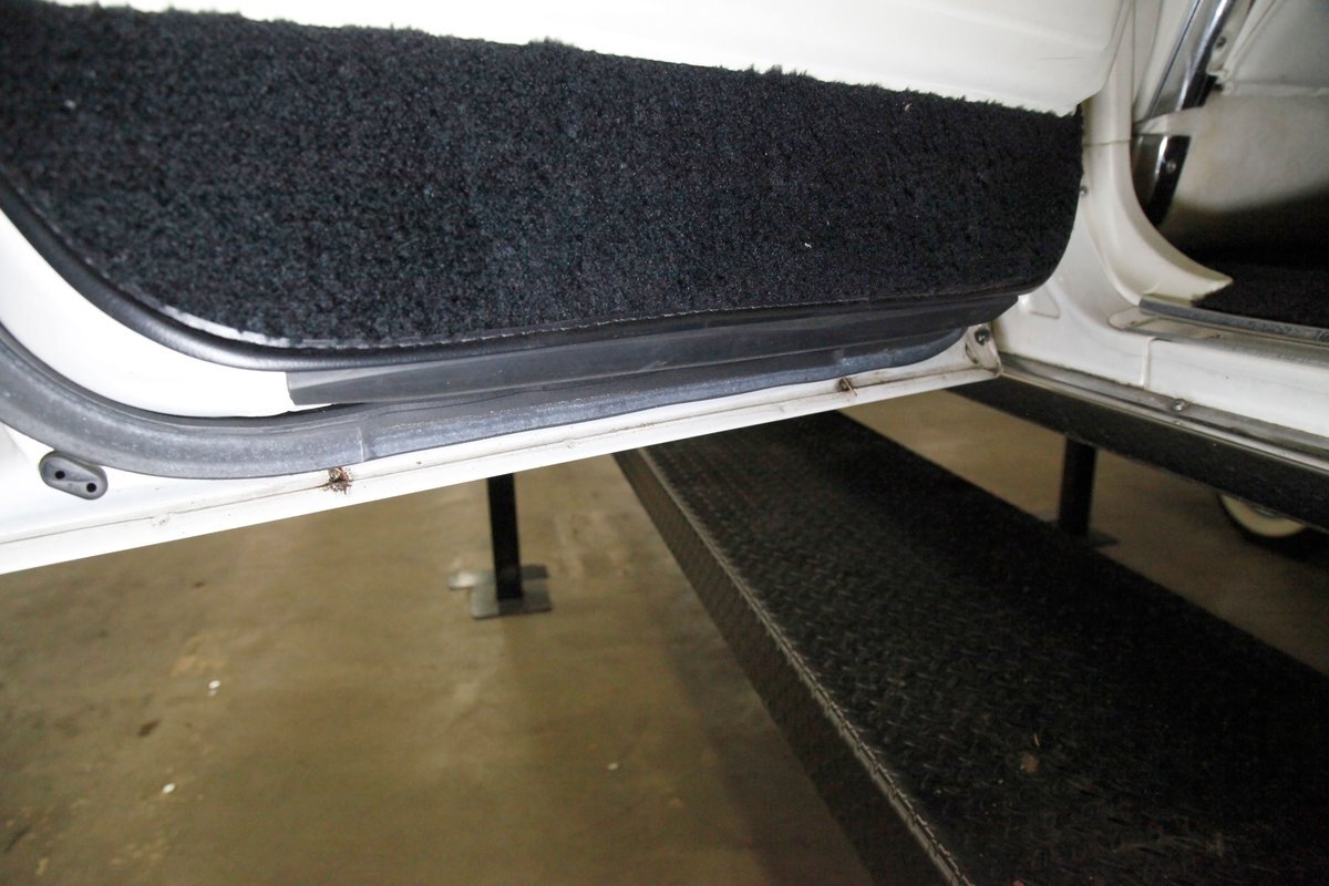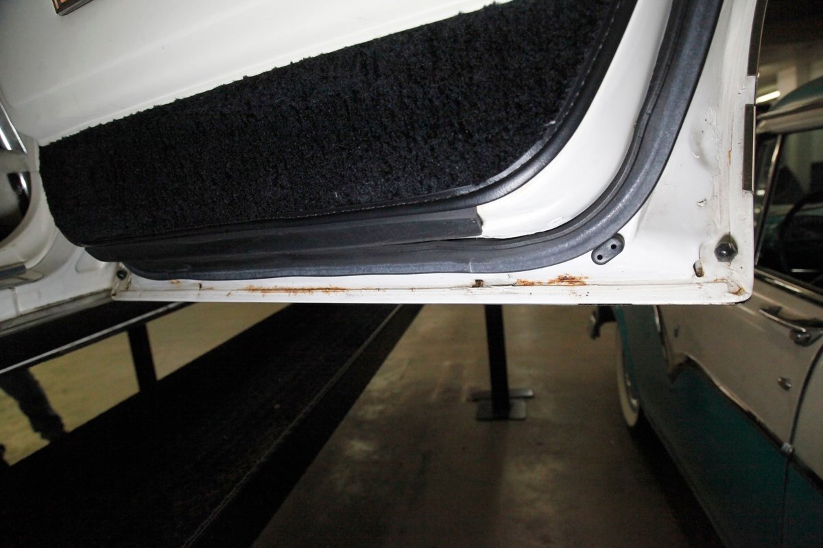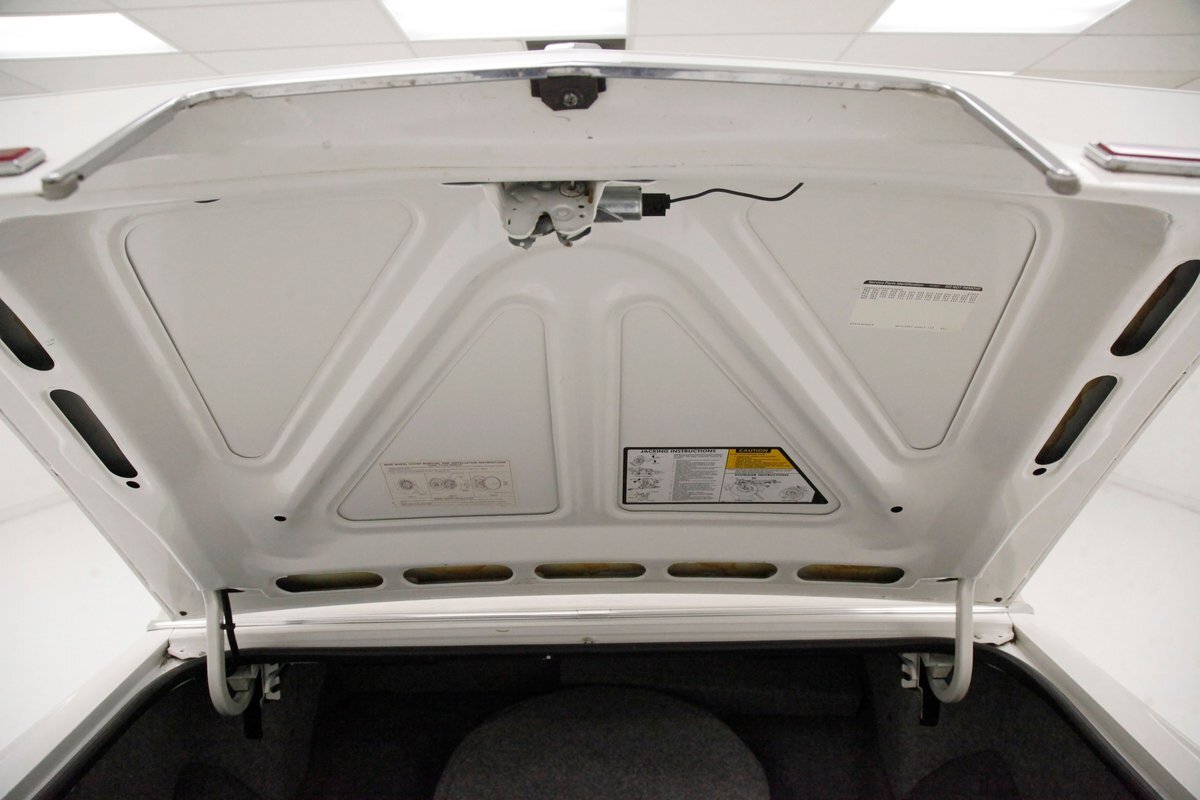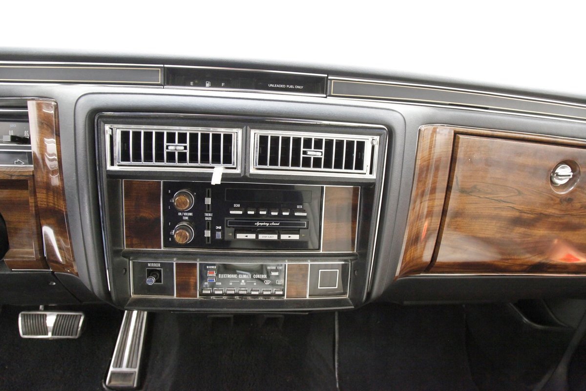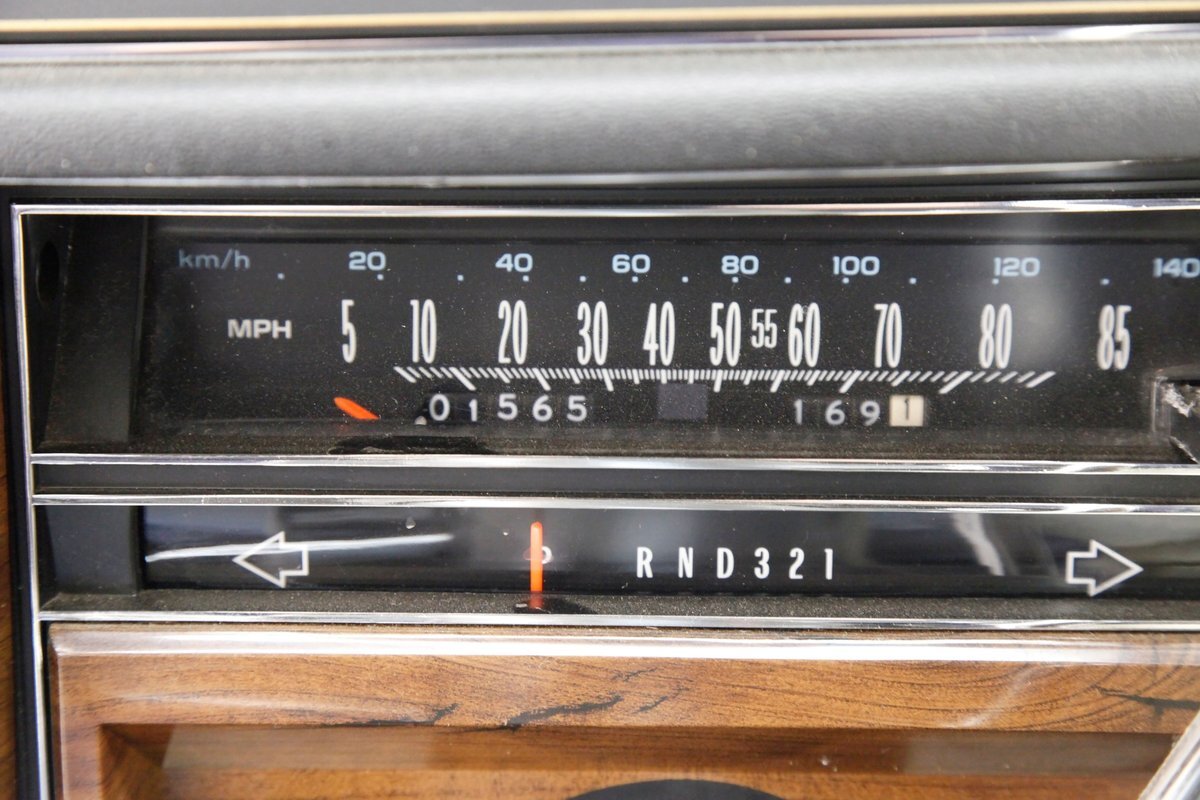 Just as luxurious as the exterior, we see plenty of white padded vinyl wood applique, chromed panels and black carpeting covering the door's insides. The customary power toggles are on the armrest as the chromed door actuator and a courtesy light. Inside pillow-like white leather covered wide buckets are up front and there is a fold down white armrest in the center. These have aged gracefully and have a few folds in the leather thrown in for that character. In back a spacious rear bench has access to big pouches for storage and plenty of legroom covered entirely with well preserved, clean black carpeting. Upfront a nicely curved U shape is reserved for the dash, and it has wood applique within the black padded surroundings. It's 1989 and all the creature comforts are controlled by push buttons and even some blue LCD readouts are within. More wood applique for the passenger glove box and above all this finery is a heavily sagged and stained white felted broadcloth headliner.
