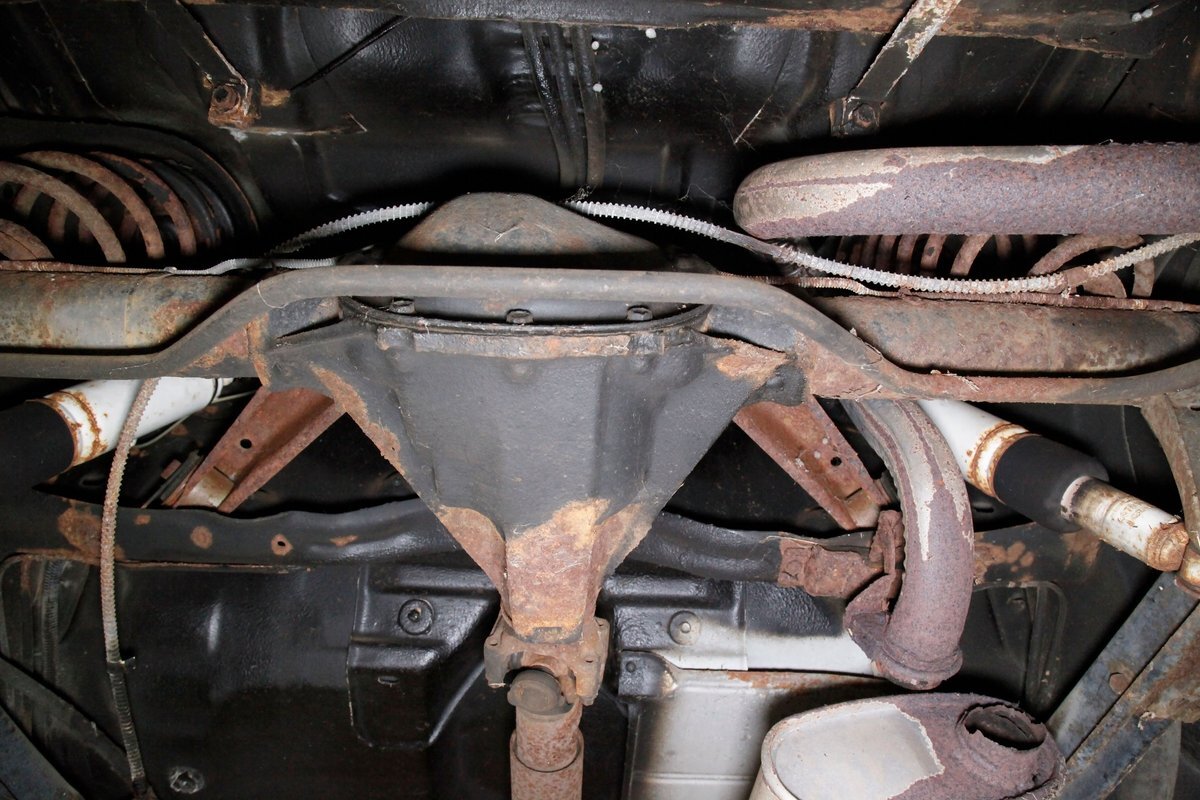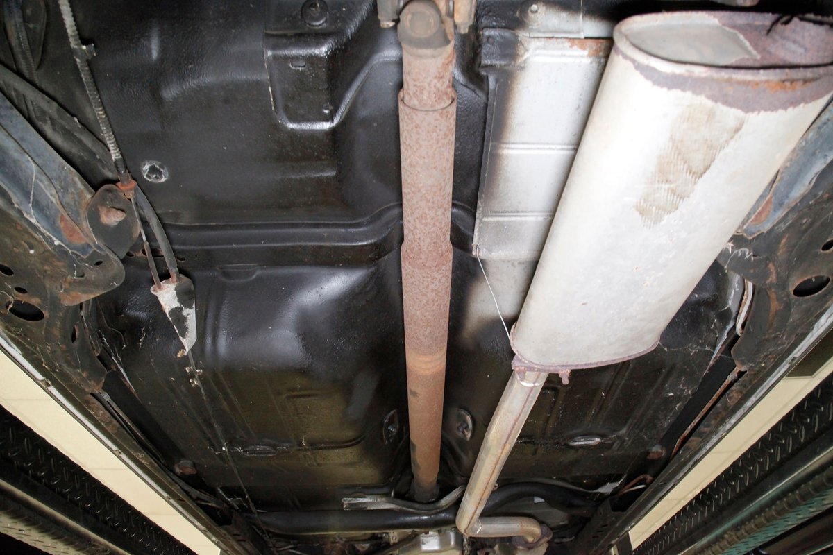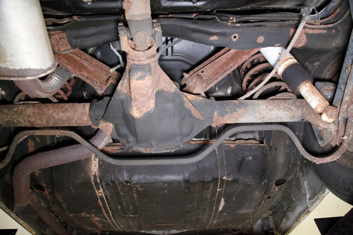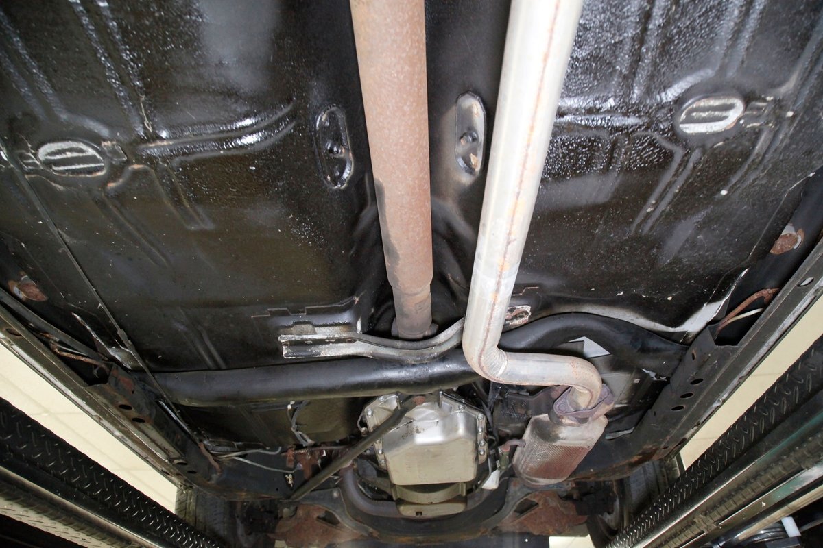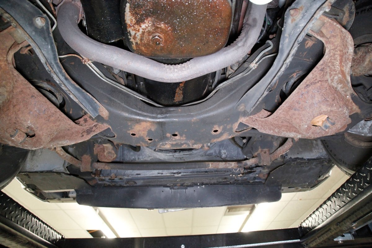 Up on the lift and it can be proven from the appearance that this is a well cared for car. All surfaces are clean save for some road splatter over sparse surface rust and solid body on framing all covered in black undercoating. Independent coil springs up front and 4 link with coil springs for the back provide the cushy rode, and power disc fronts and power drums backs provide the stopping.