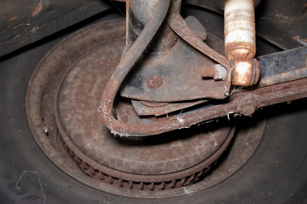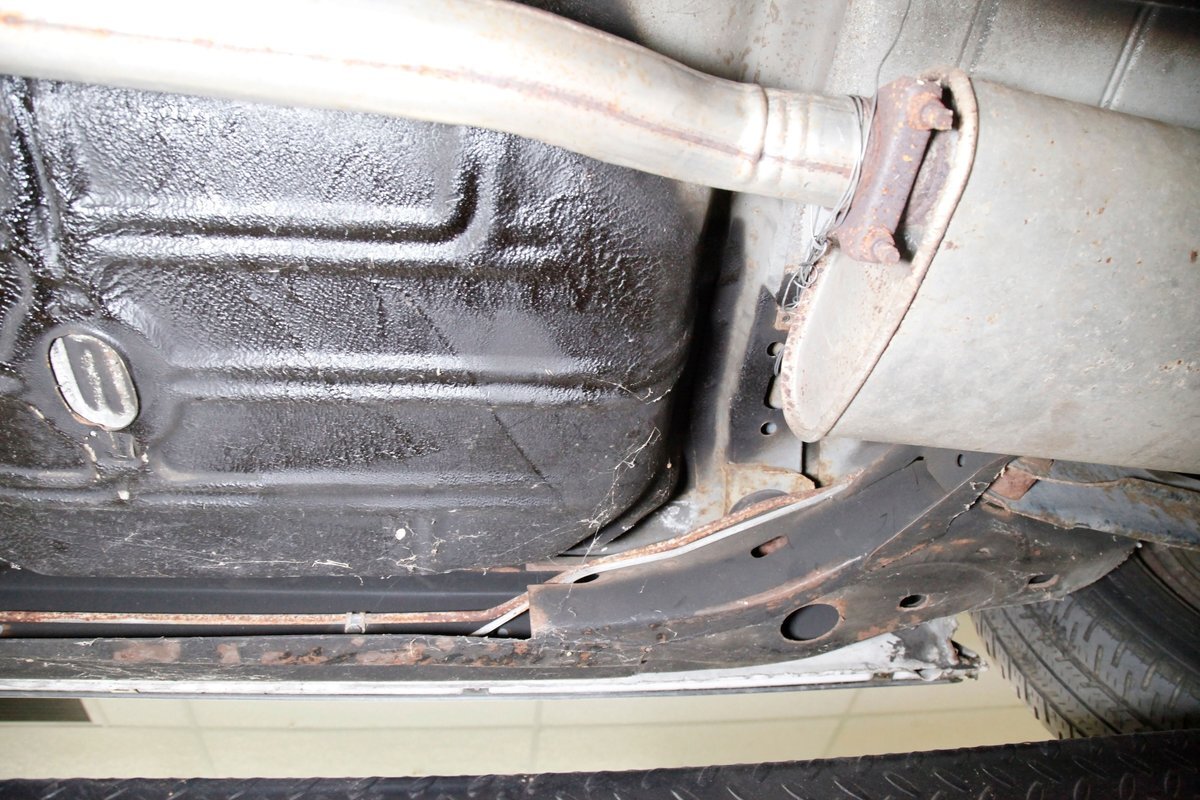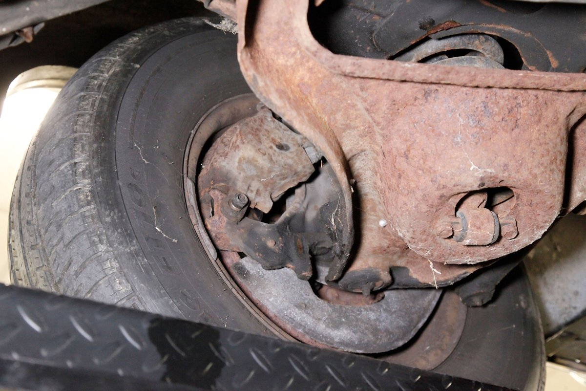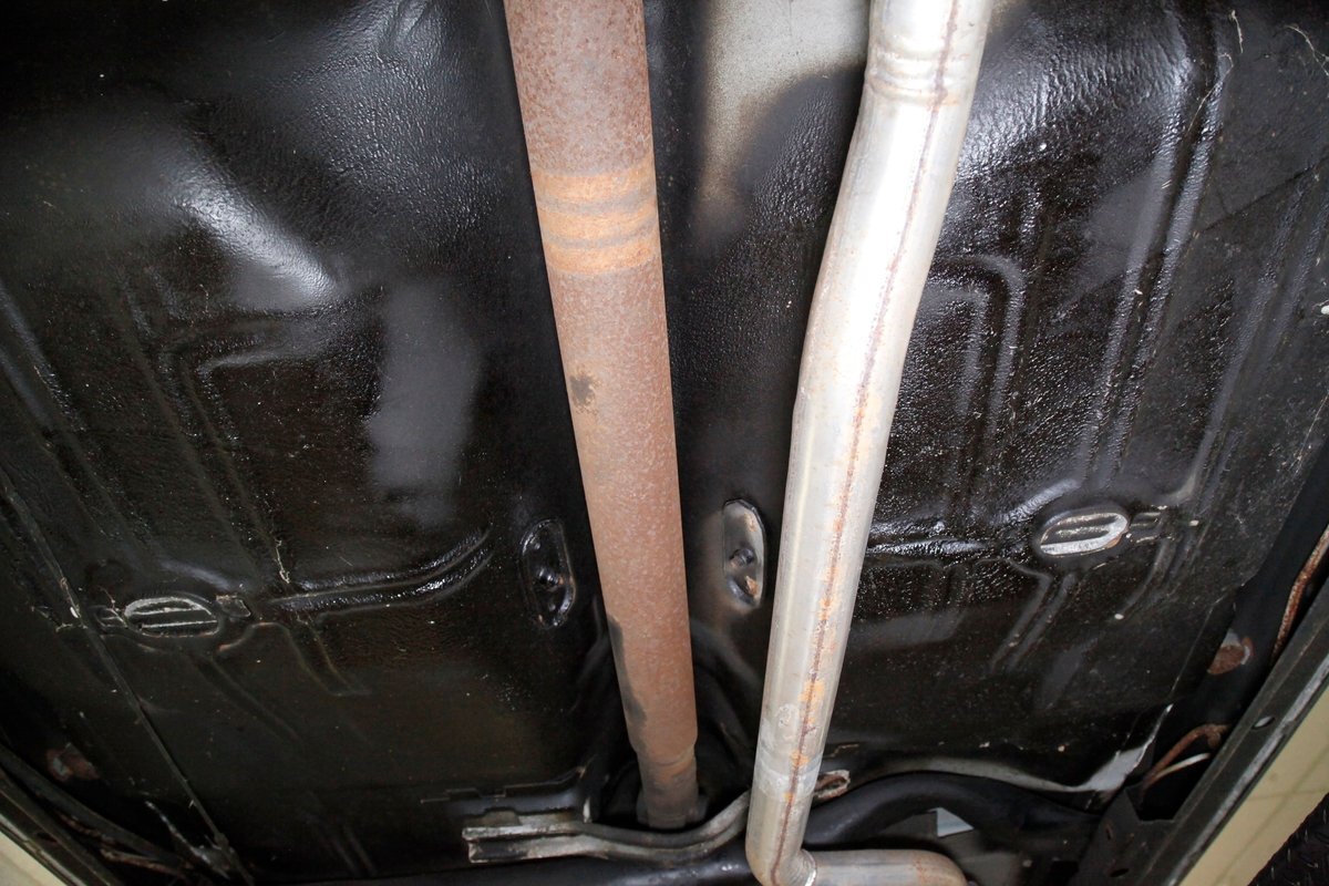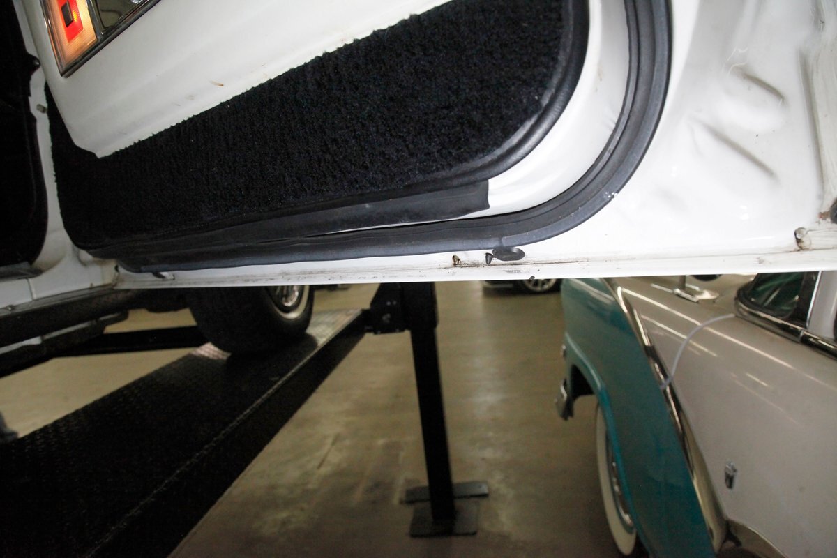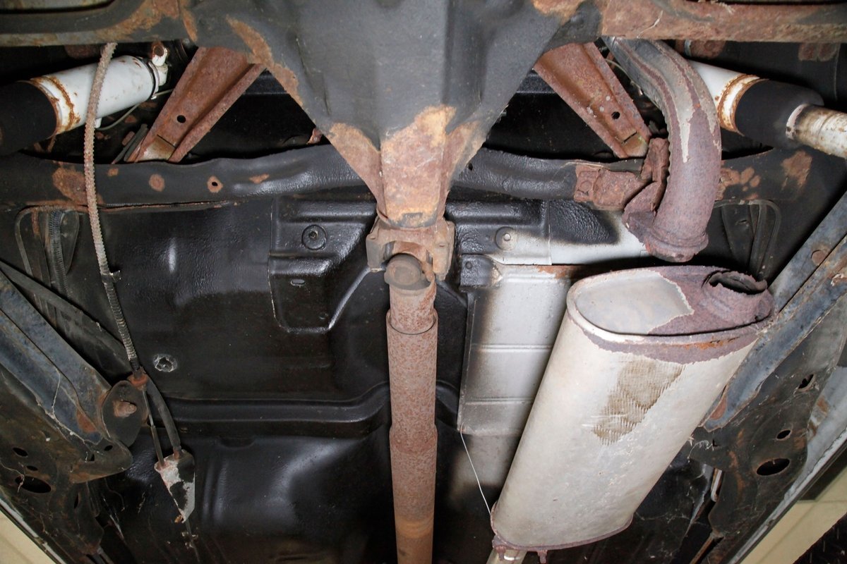 Up on the lift and it can be proven from the appearance that this is a well cared for car. All surfaces are clean save for some road splatter over sparse surface rust and solid body on framing all covered in black undercoating. Independent coil springs up front and 4 link with coil springs for the back provide the cushy rode, and power disc fronts and power drums backs provide the stopping.