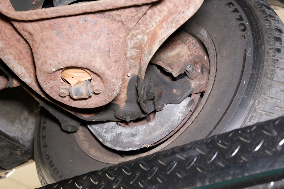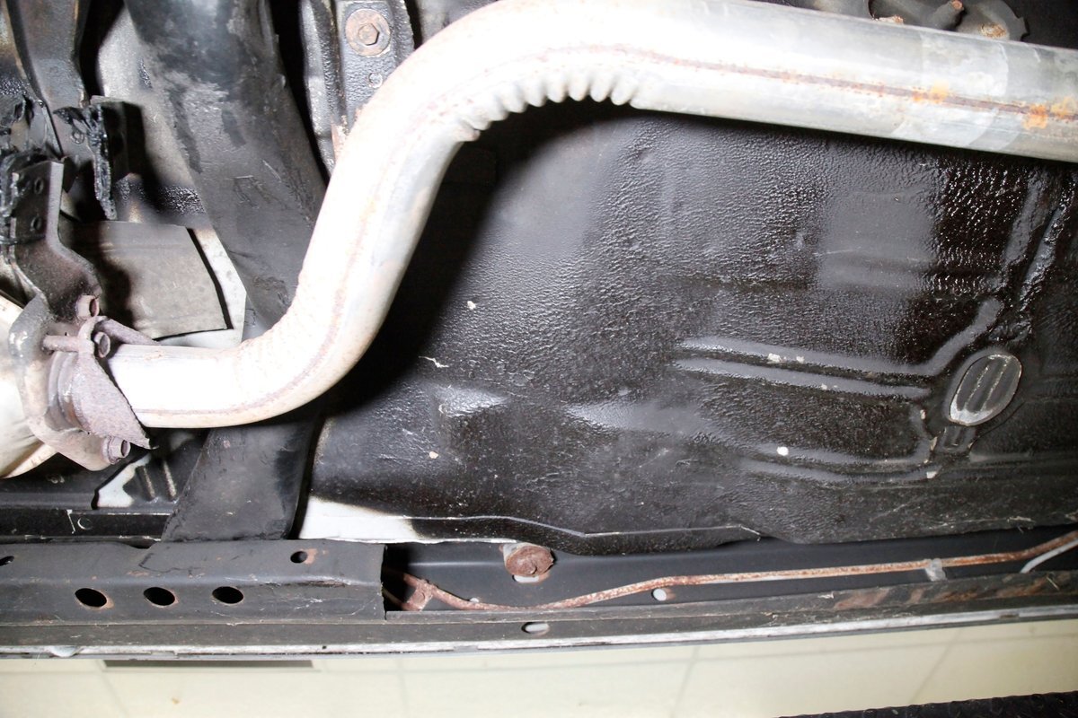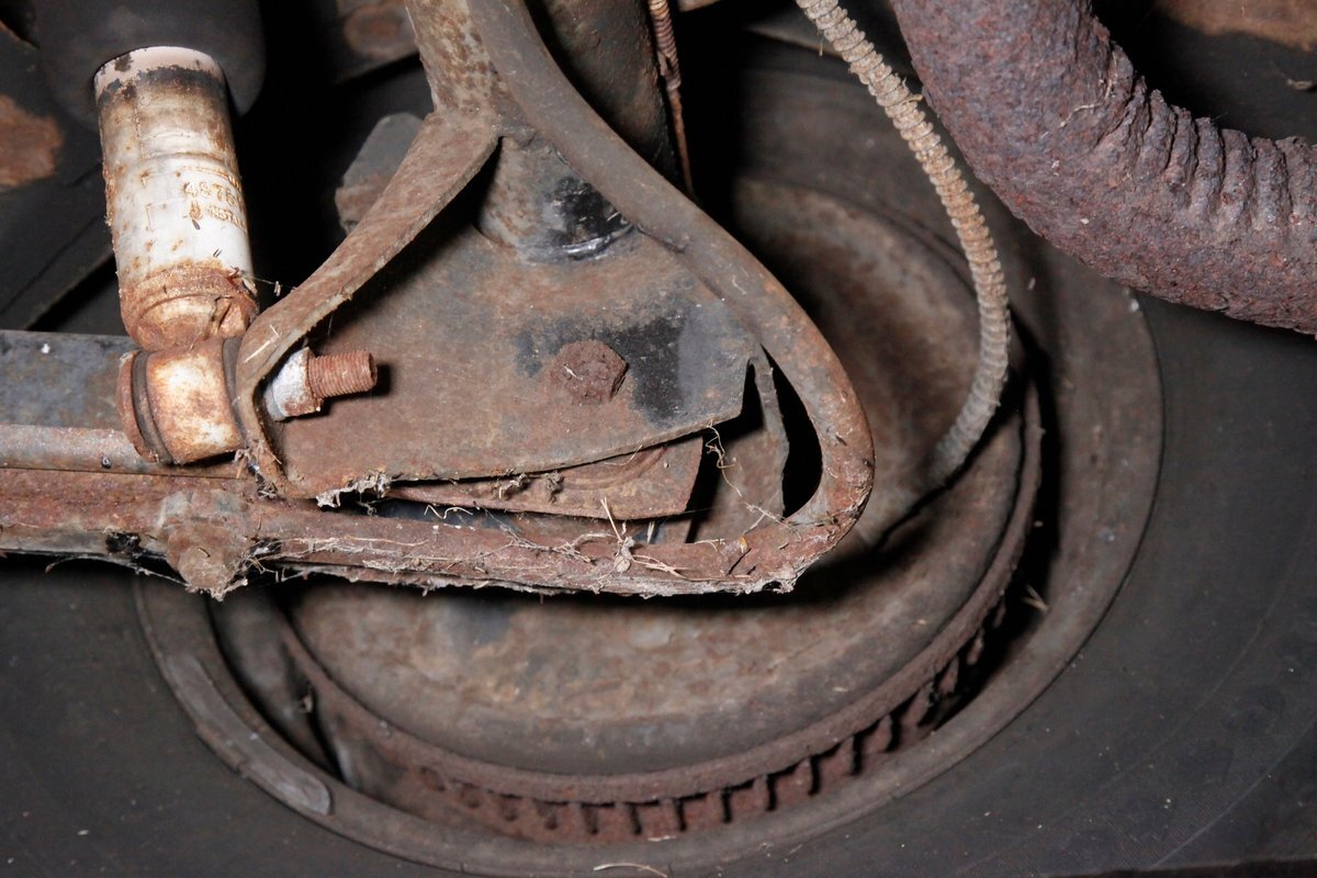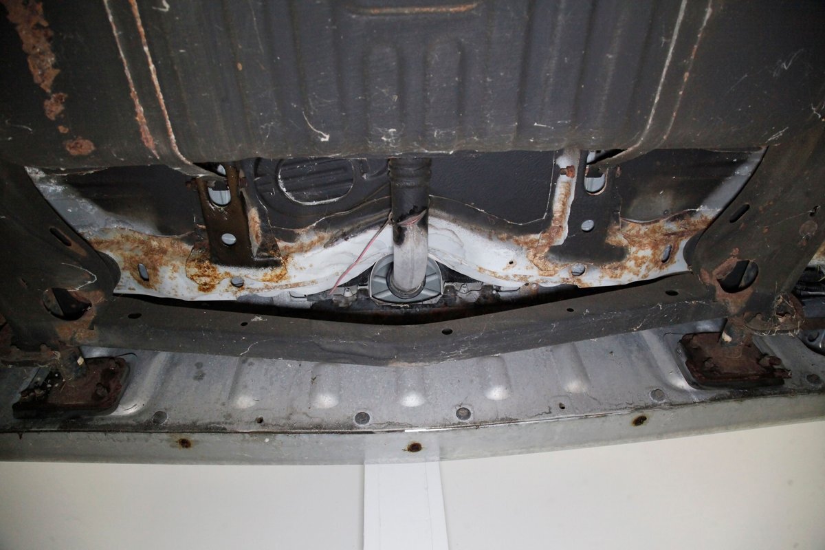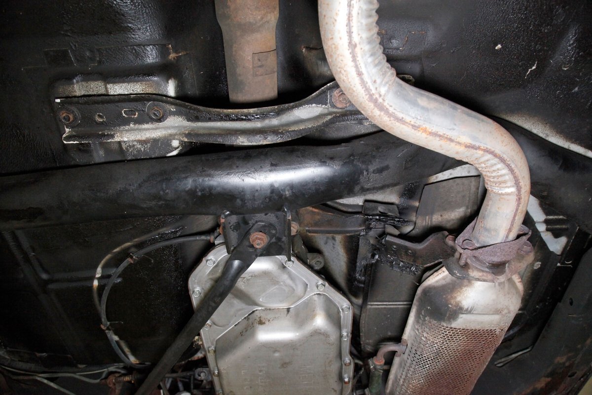 Up on the lift and it can be proven from the appearance that this is a well cared for car. All surfaces are clean save for some road splatter over sparse surface rust and solid body on framing all covered in black undercoating. Independent coil springs up front and 4 link with coil springs for the back provide the cushy rode, and power disc fronts and power drums backs provide the stopping.