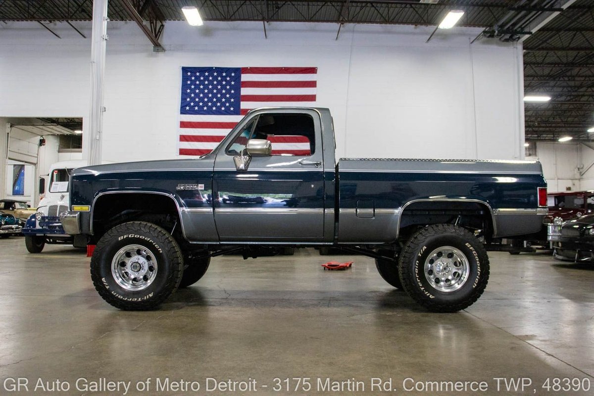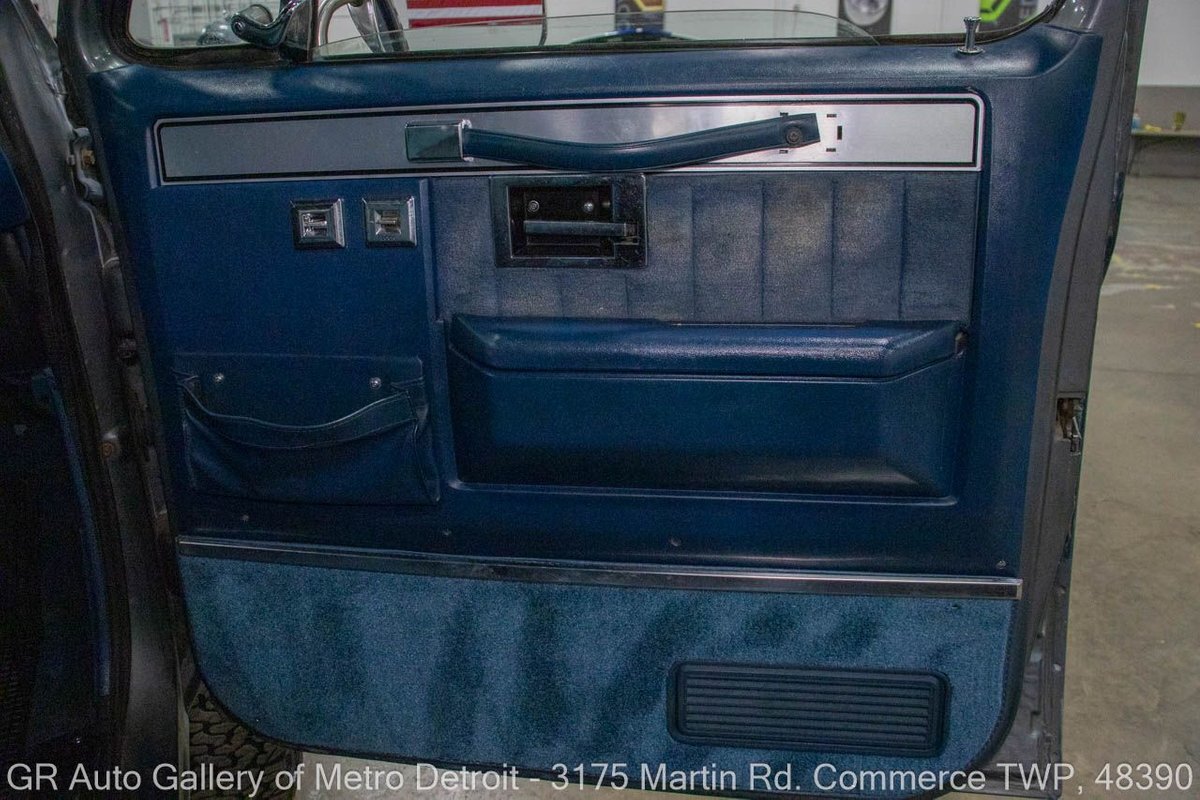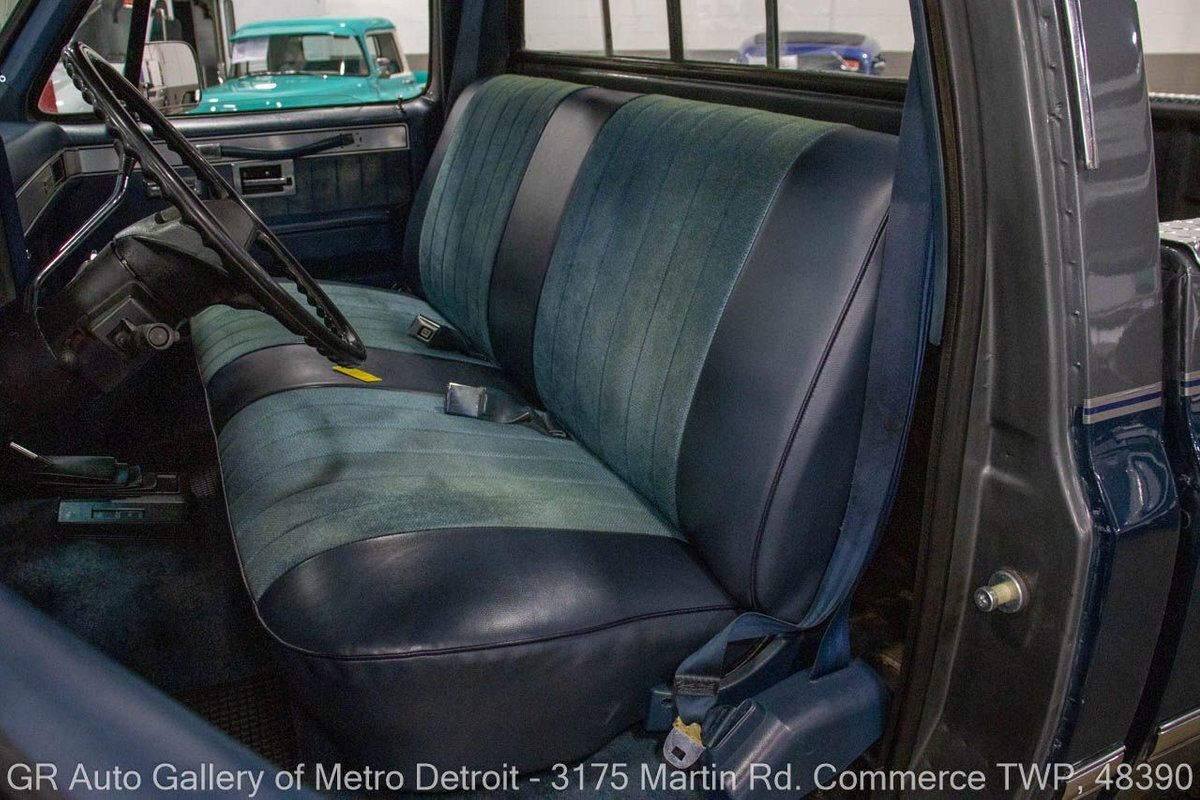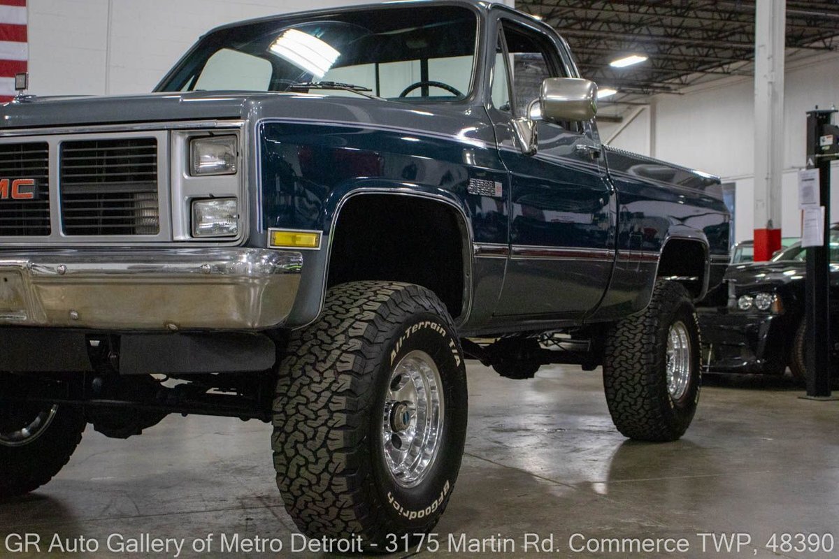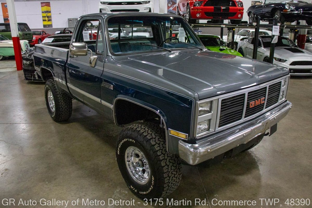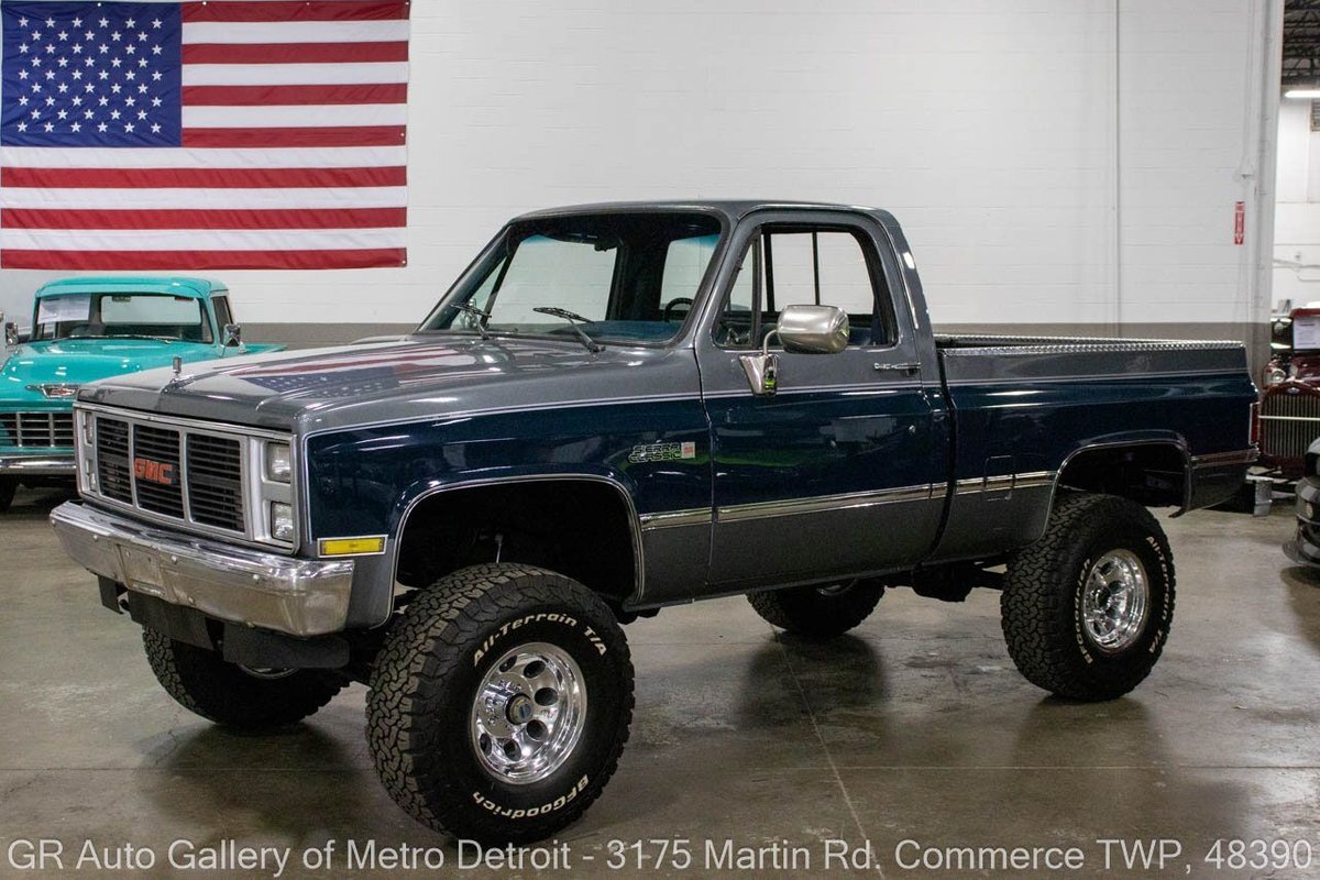 GR Auto Gallery is pleased to present this 1987 GMC V1500 1/2 Ton pickup for your consideration. This classic truck comes in a striking Blue and Gray metallic exterior, complemented by a blue interior. Under the hood, you will find a reliable 350 cubic inch V8 engine paired with a 700 R4 automatic transmission. This GMC V1500 is equipped with Bf good rich all terrain LT 315/75r16 127/124r tires mounted on M/T rims, rough country performance shocks, new battery, Sylvania halogens front headlights, and has been well-maintained to ensure exceptional performance both on and off the road. Drive this one out of our showroom or have us assist with shipping it to you anywhere in the United States! Don't hesitate to call us with any questions or for more information.