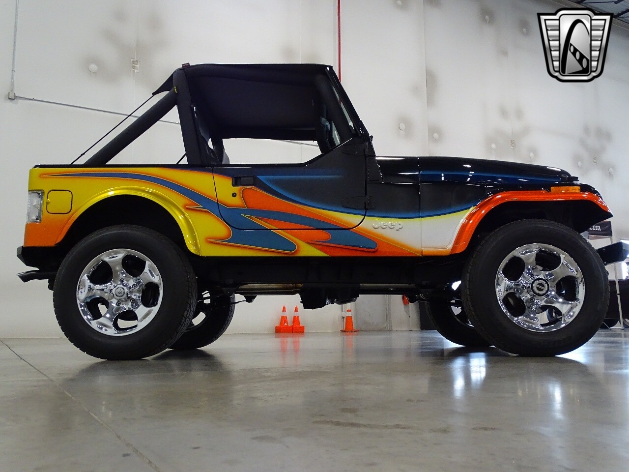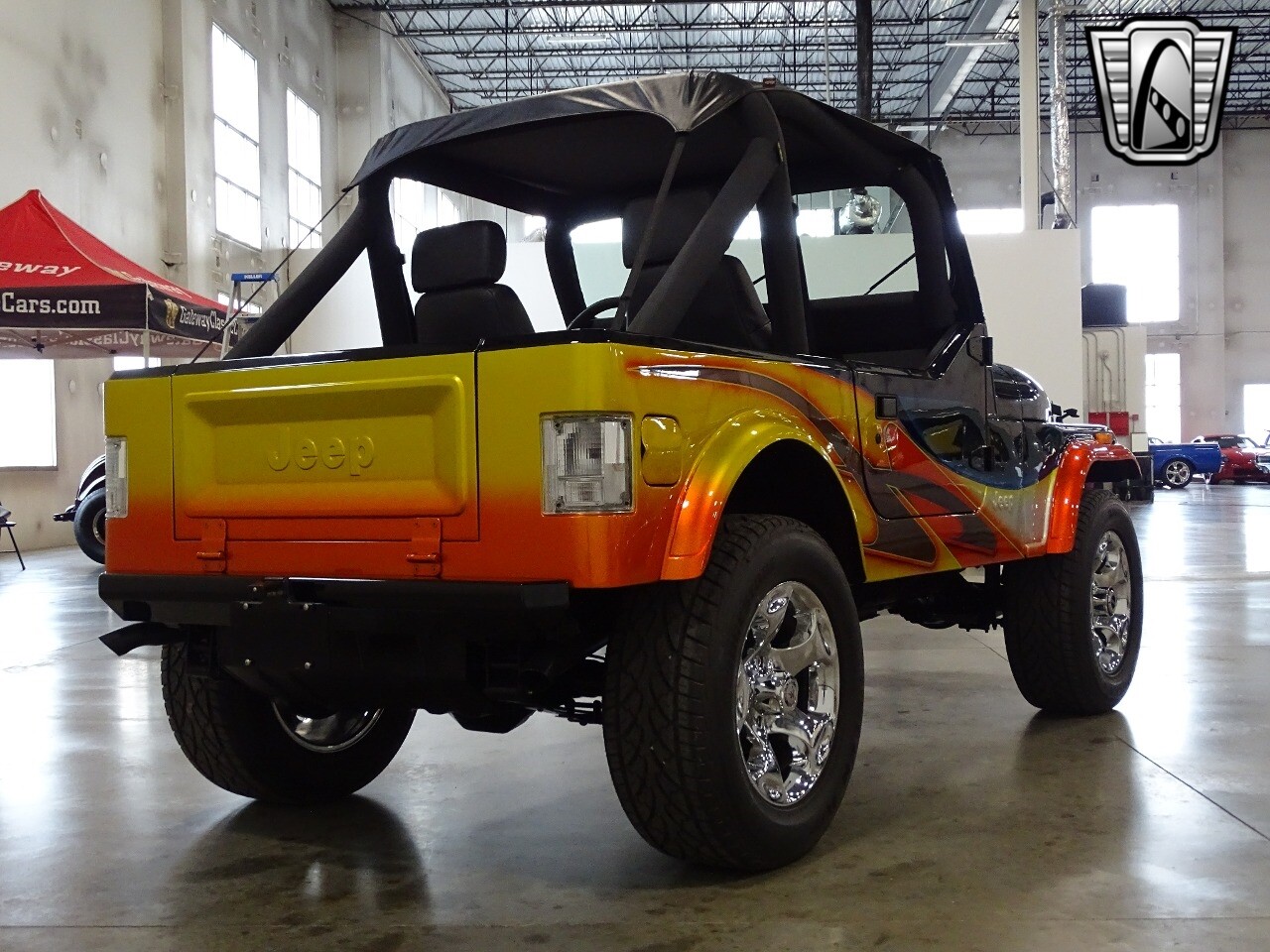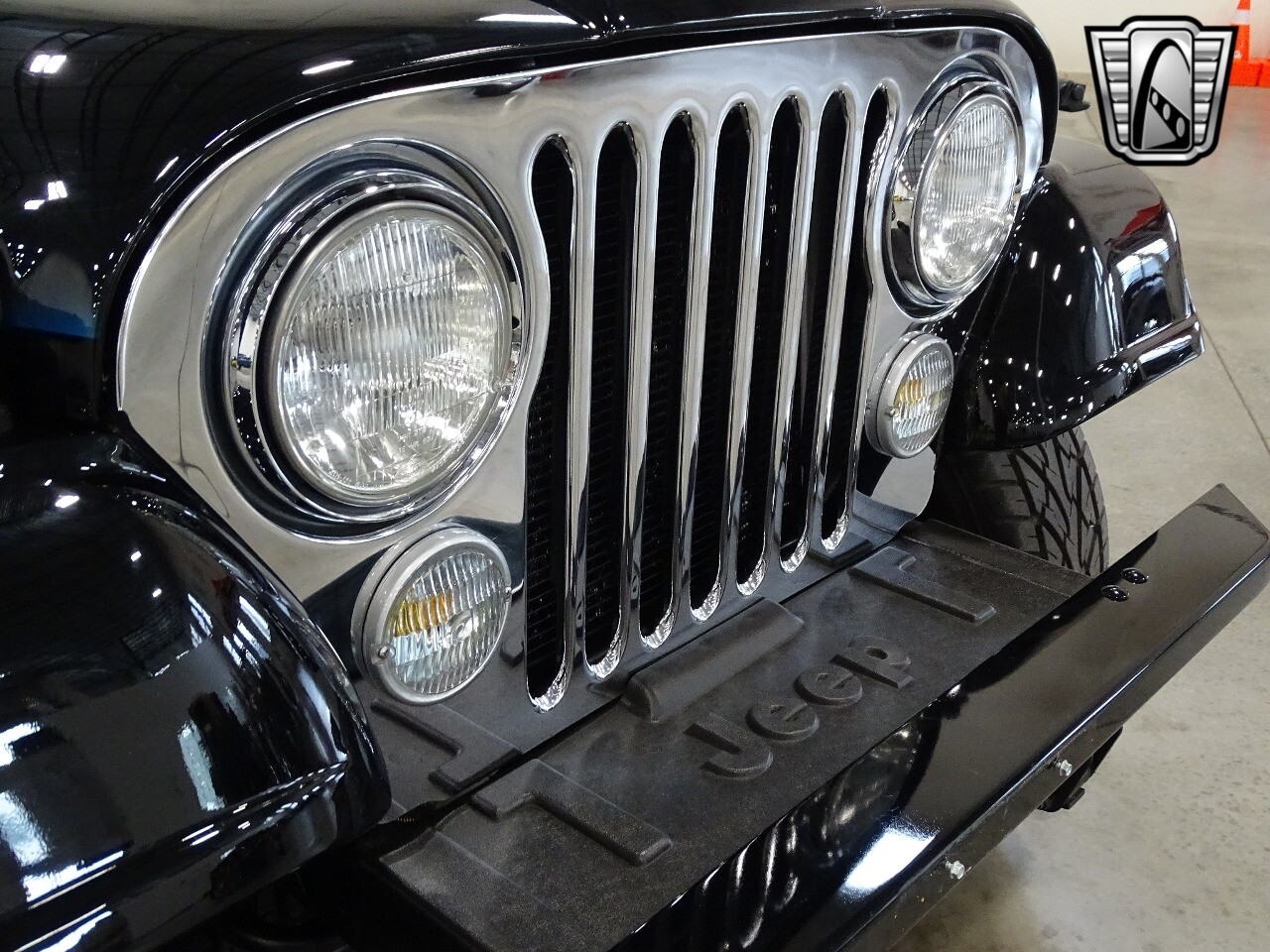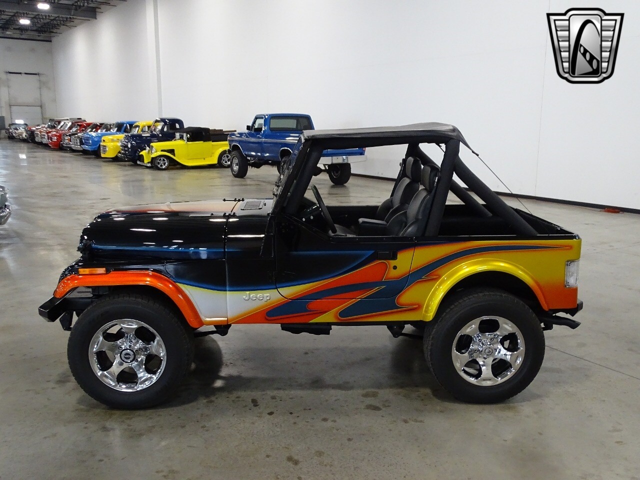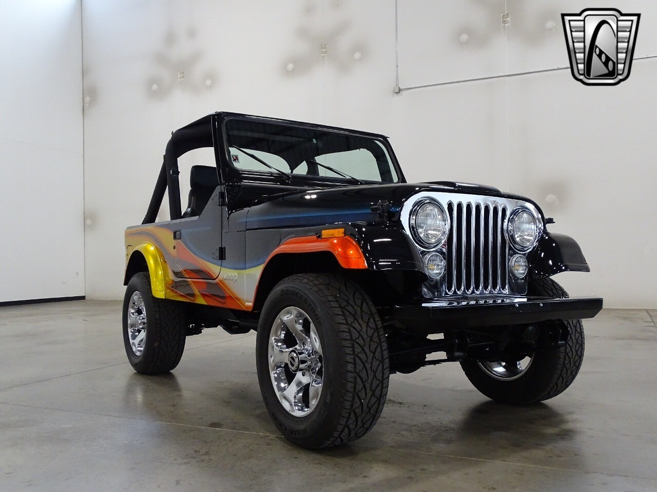 Gateway Classic Cars Milwaukee is excited to present this unique 1983 Jeep CJ-7 Custom Build. Painted in black with ten other Candy Chameleon colors that change color depending on angle you are viewing. Extra features include a fitted bikini top, American Racing chrome wheels mounted on 18" Bridgestone Dueler H/P tires, and a chrome grille. The custom interior comes with leather seating, lockable center console, full carpeting, rubber rear cargo mat, custom instrument panel w/ Auto Meter Phantom gauges, leather steering wheel w/tilt, custom Smitty Built 6-point padded roll bar, and a Jensen AM/FM/cd radio.