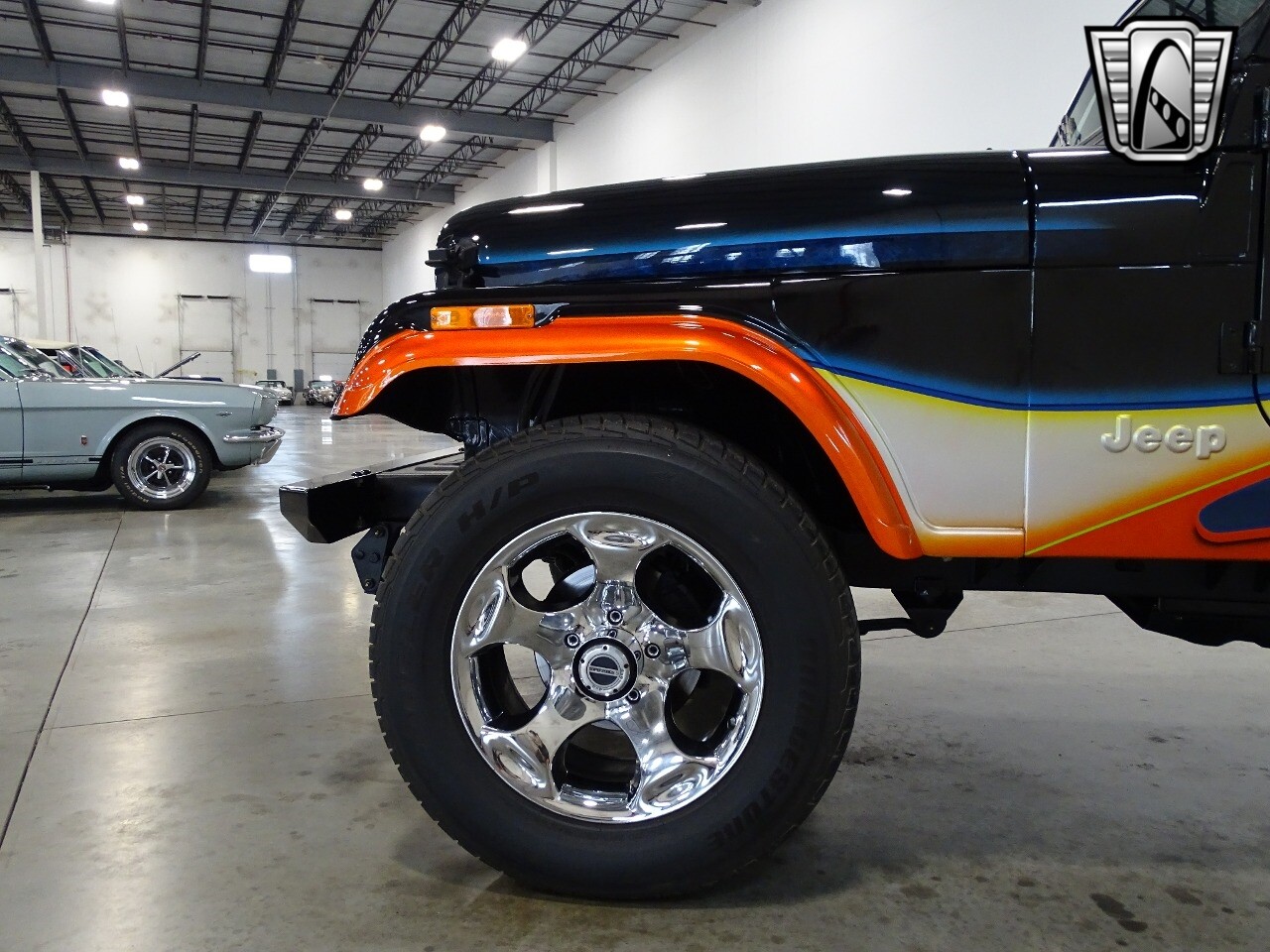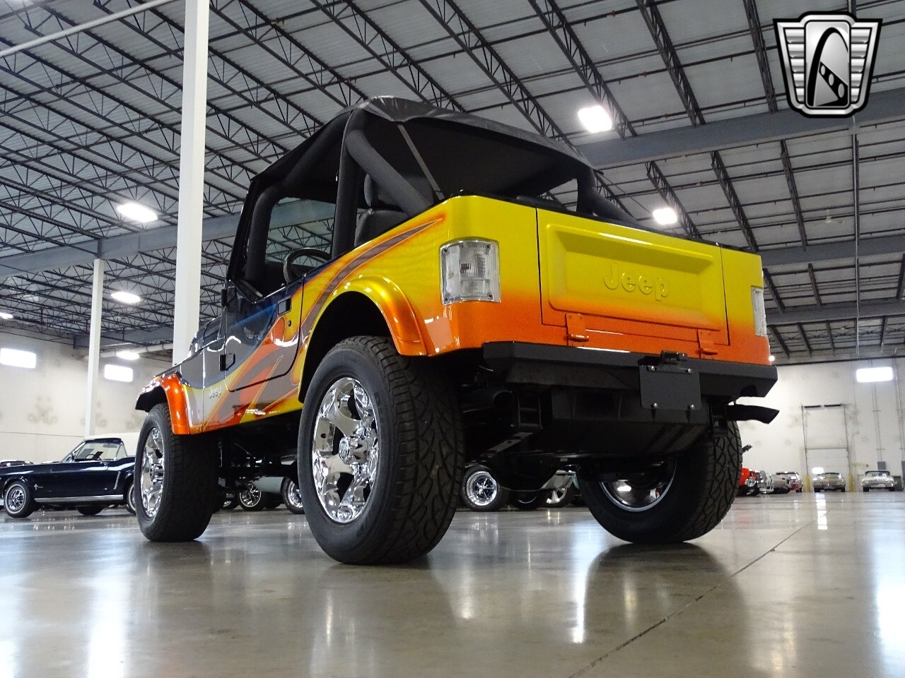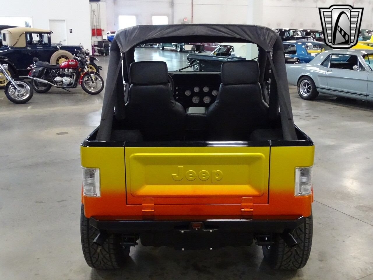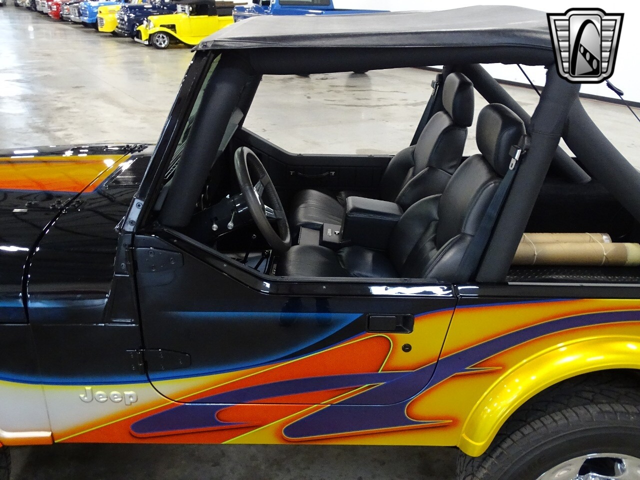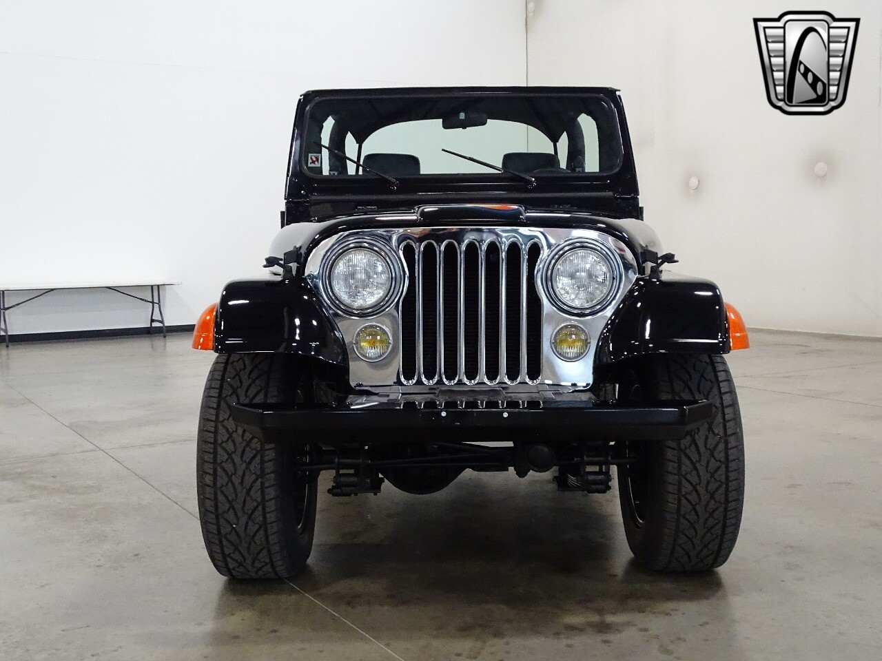 Gateway Classic Cars Milwaukee is excited to present this unique 1983 Jeep CJ-7 Custom Build. Painted in black with ten other Candy Chameleon colors that change color depending on angle you are viewing. Extra features include a fitted bikini top, American Racing chrome wheels mounted on 18" Bridgestone Dueler H/P tires, and a chrome grille. The custom interior comes with leather seating, lockable center console, full carpeting, rubber rear cargo mat, custom instrument panel w/ Auto Meter Phantom gauges, leather steering wheel w/tilt, custom Smitty Built 6-point padded roll bar, and a Jensen AM/FM/cd radio.
