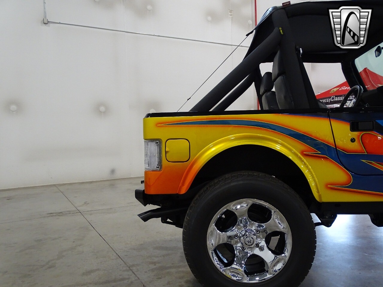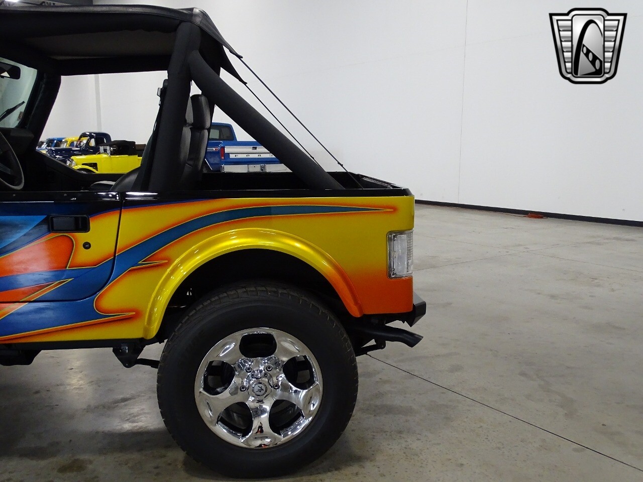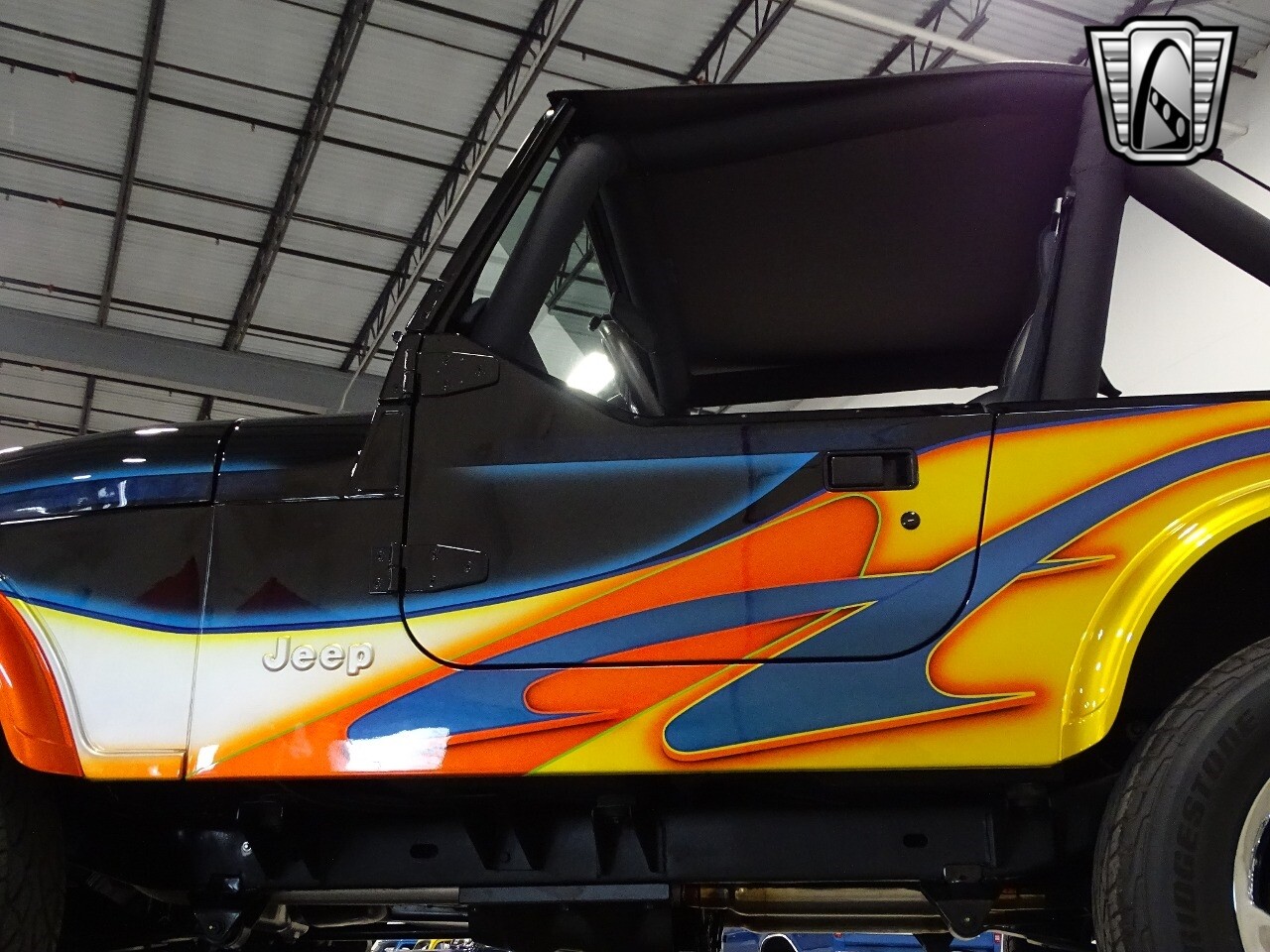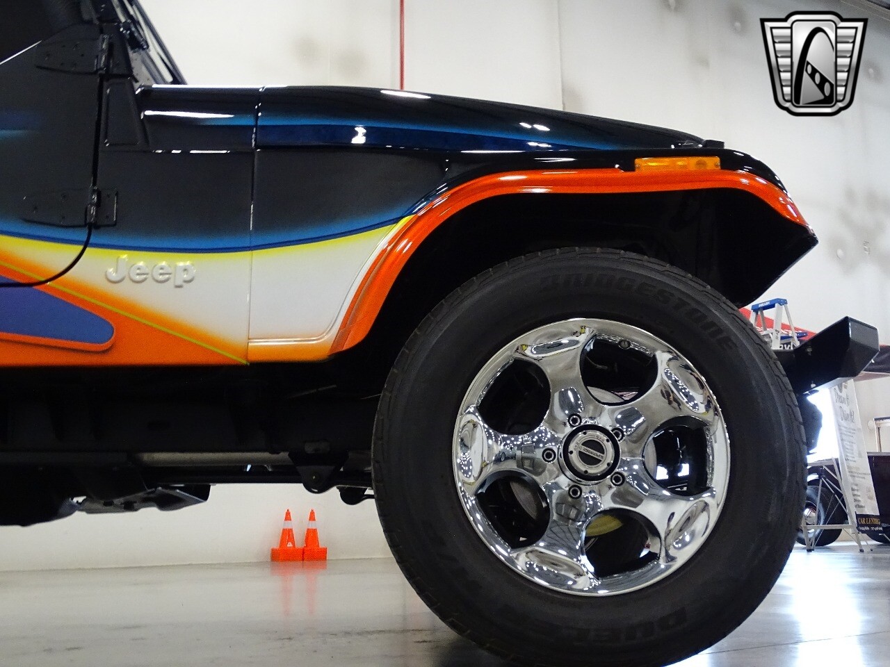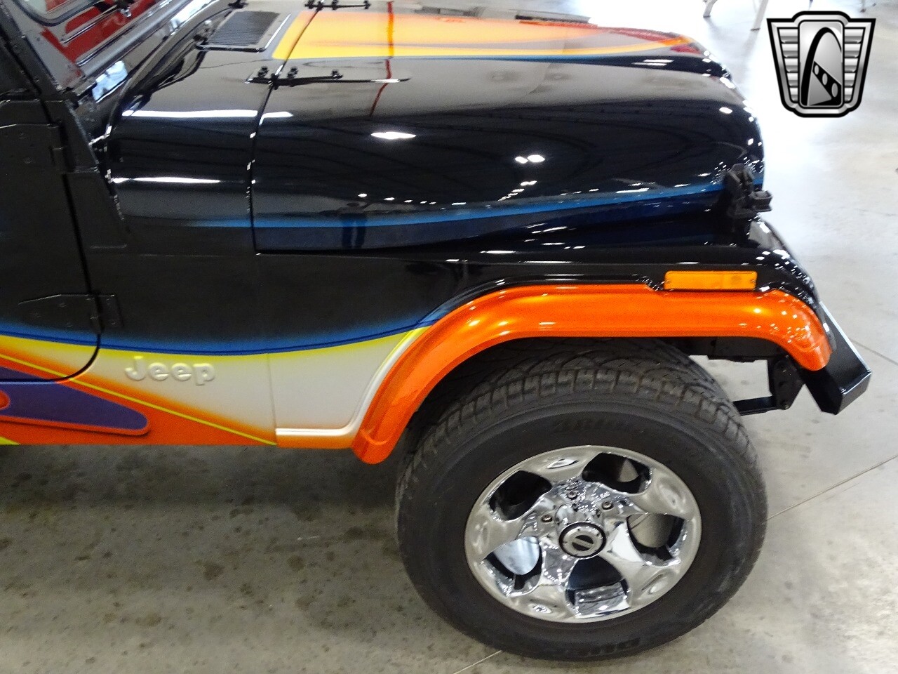 Gateway Classic Cars Milwaukee is excited to present this unique 1983 Jeep CJ-7 Custom Build. Painted in black with ten other Candy Chameleon colors that change color depending on angle you are viewing. Extra features include a fitted bikini top, American Racing chrome wheels mounted on 18" Bridgestone Dueler H/P tires, and a chrome grille. The custom interior comes with leather seating, lockable center console, full carpeting, rubber rear cargo mat, custom instrument panel w/ Auto Meter Phantom gauges, leather steering wheel w/tilt, custom Smitty Built 6-point padded roll bar, and a Jensen AM/FM/cd radio.