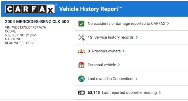 The original owner purchased the CLK500 in September 2003 and put only 4,100 miles during their 6-year ownership while providing scheduled servicing. The second owner purchased the CLK in October 2009 and put 25,100 miles on it during their almost 7-year ownership while providing scheduled servicing. The most recent owner purchased the CLK in July 2016 and had it serviced on a regular basis during their 7-year ownership.
